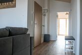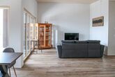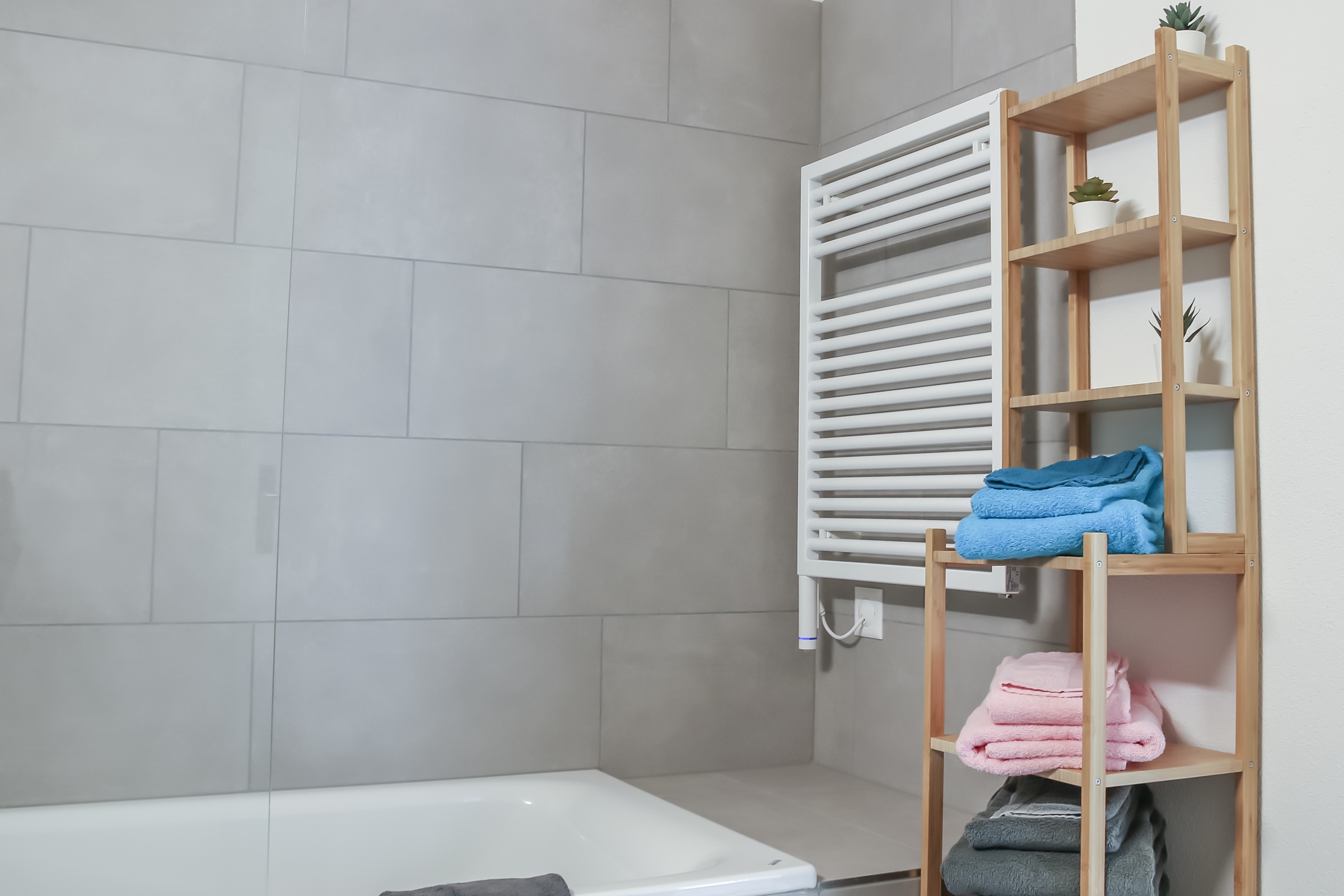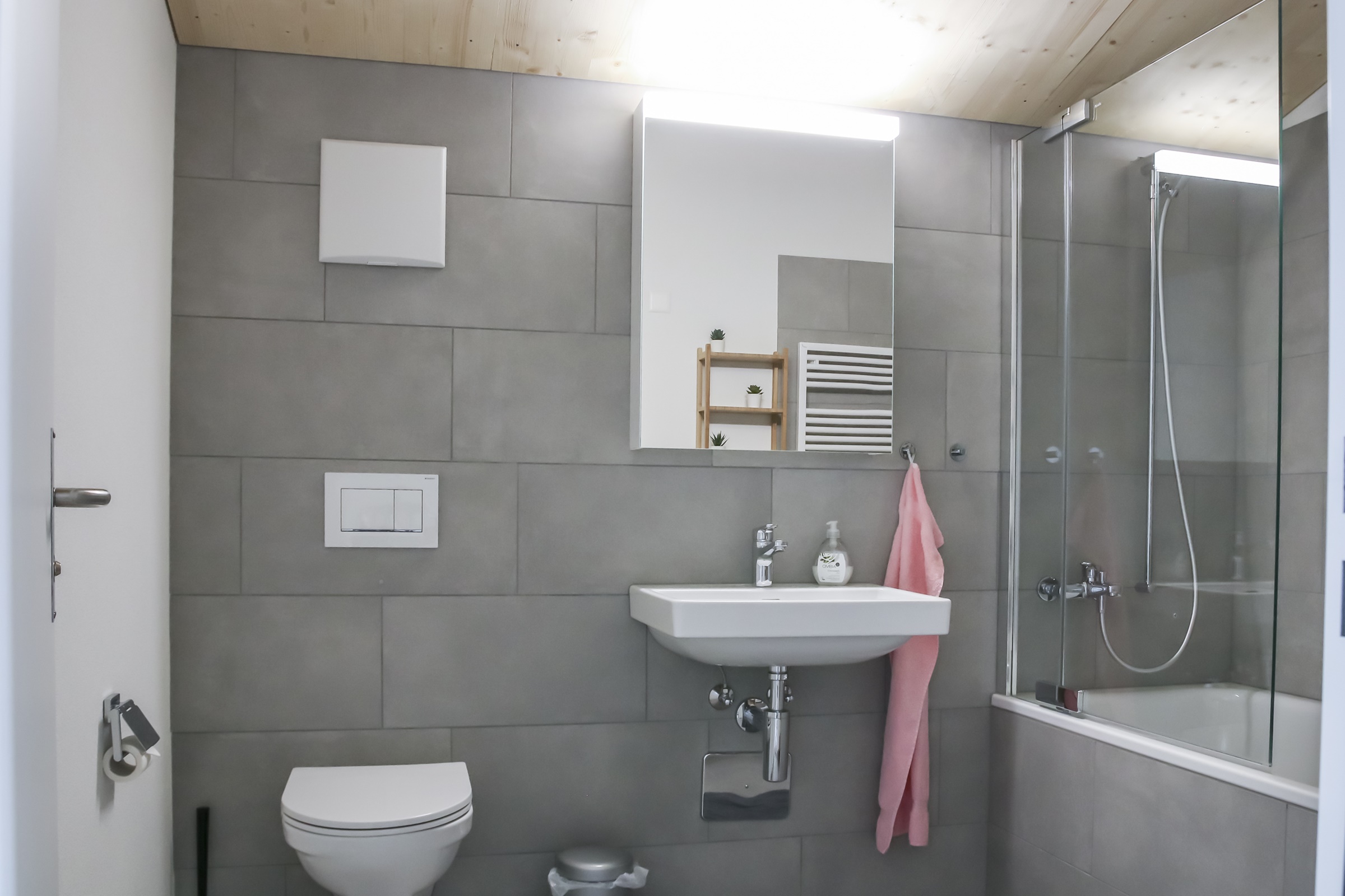 Das Badezimmer verfügt über eine Badewanne/Dusche, ein WC mit Lavabo, einen Handtuchwärmer und grosse Abstellfläche.Wohnzimmer