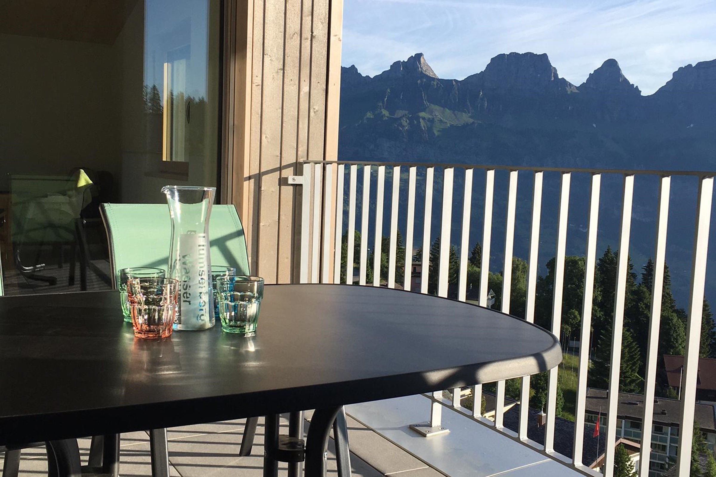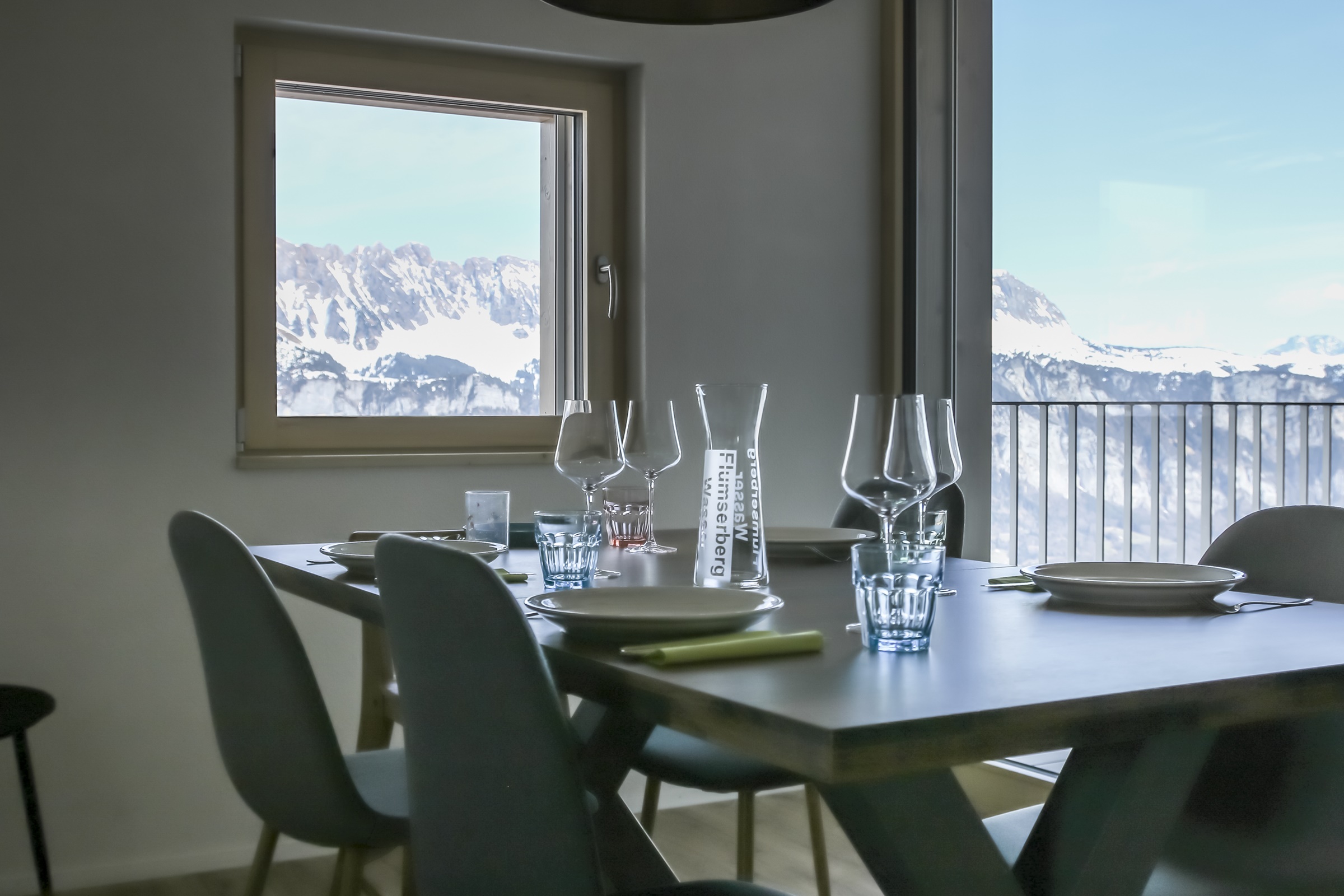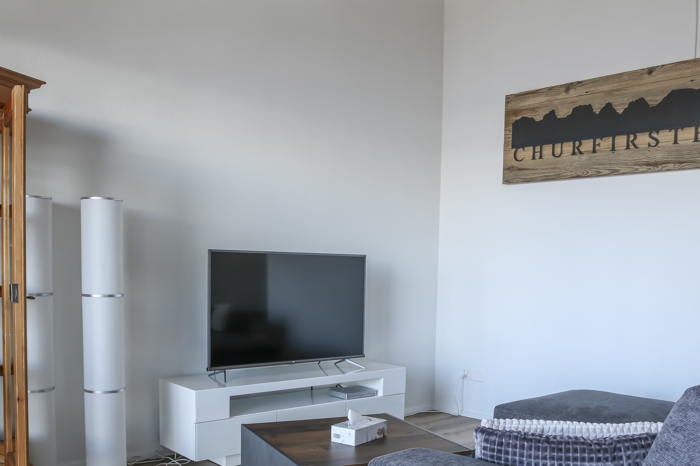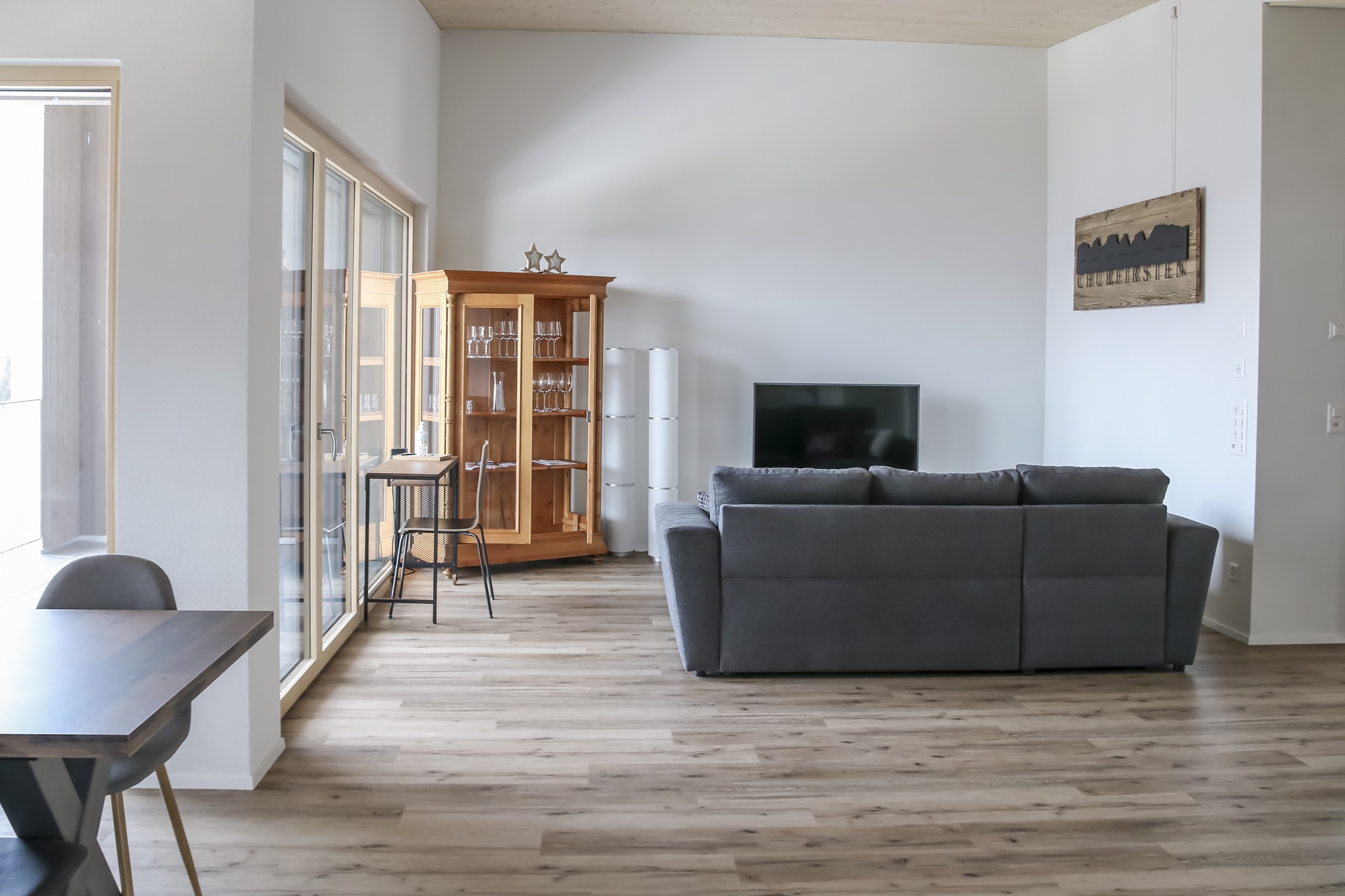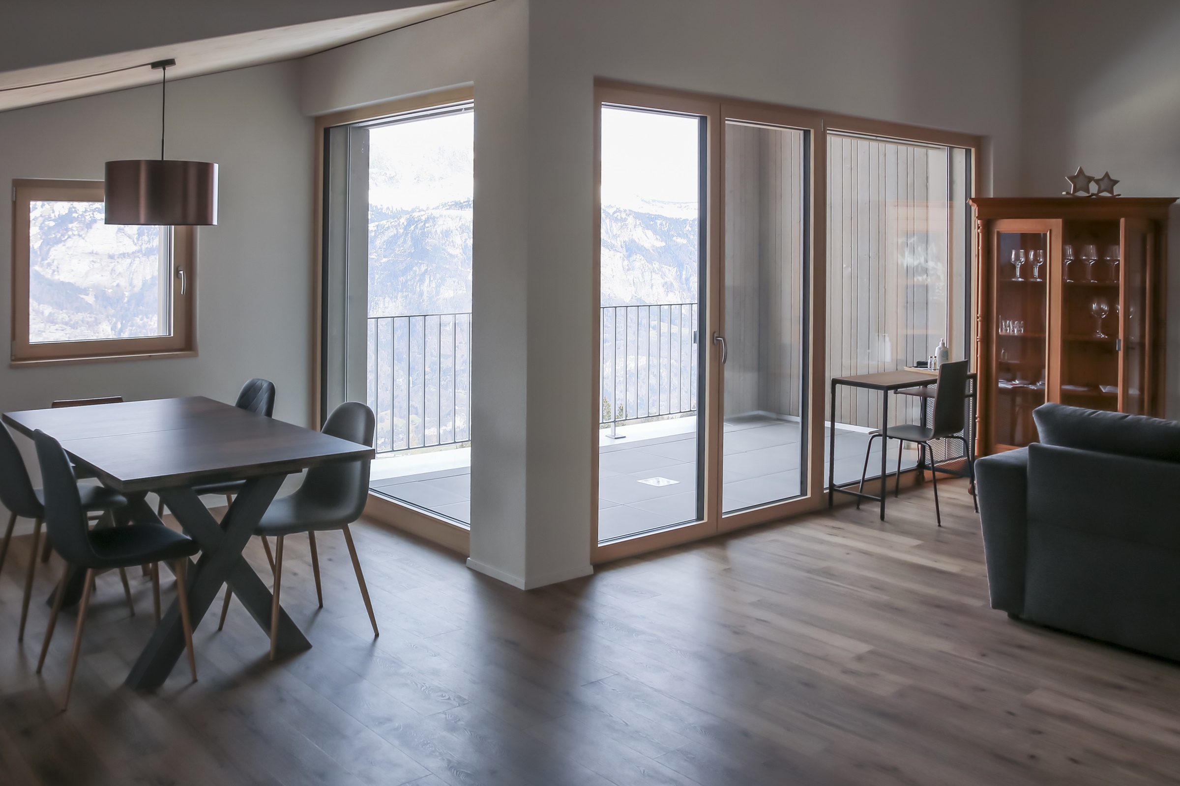 Ein offener Wohnraum mit Küchen-/Essbereich. Im Wohnzimmer befindet sich ein Sofa (ausziehbar für eine Schlafmöglichkeit von 2 Personen) mit Flatscreen-TV und DVD-Player, sowie ein ausziehbarer Esstisch mit Platz für bis zu 8 Personen. Ein Kinderstuhl und Babystuhl ist vorhanden. Grosser gedeckter Balkon mit schöner Aussicht auf die Churfirsten Bergkette. Küche