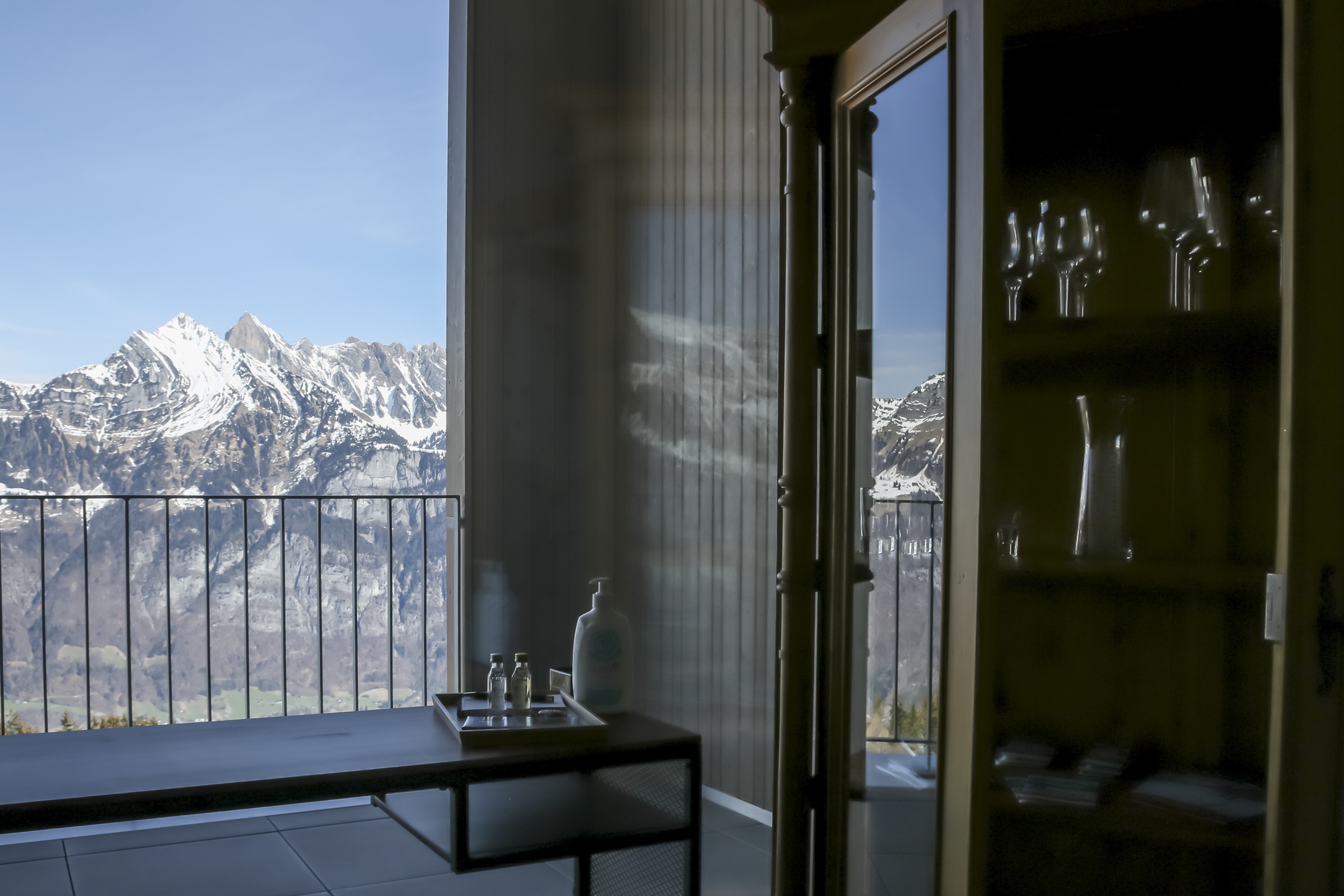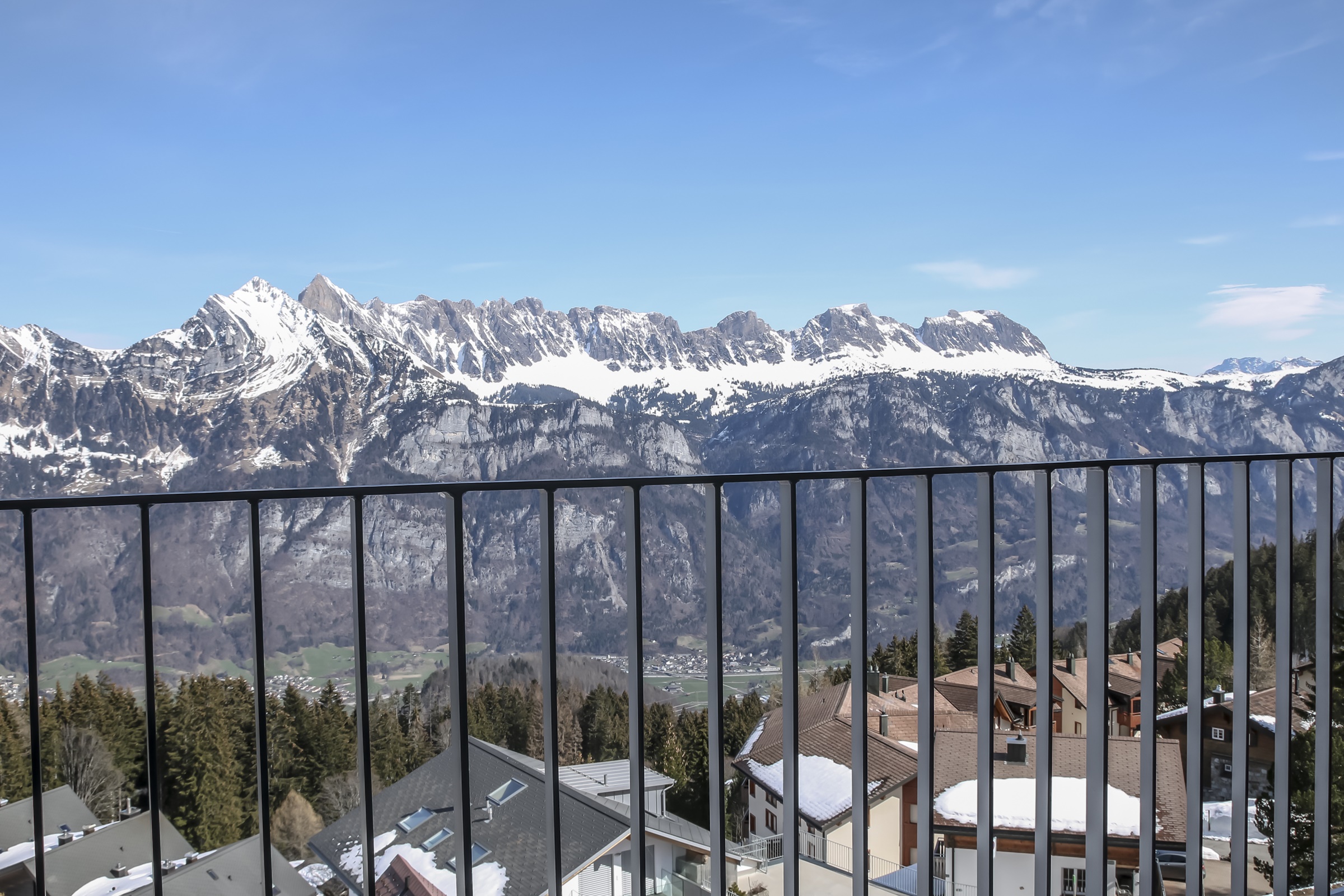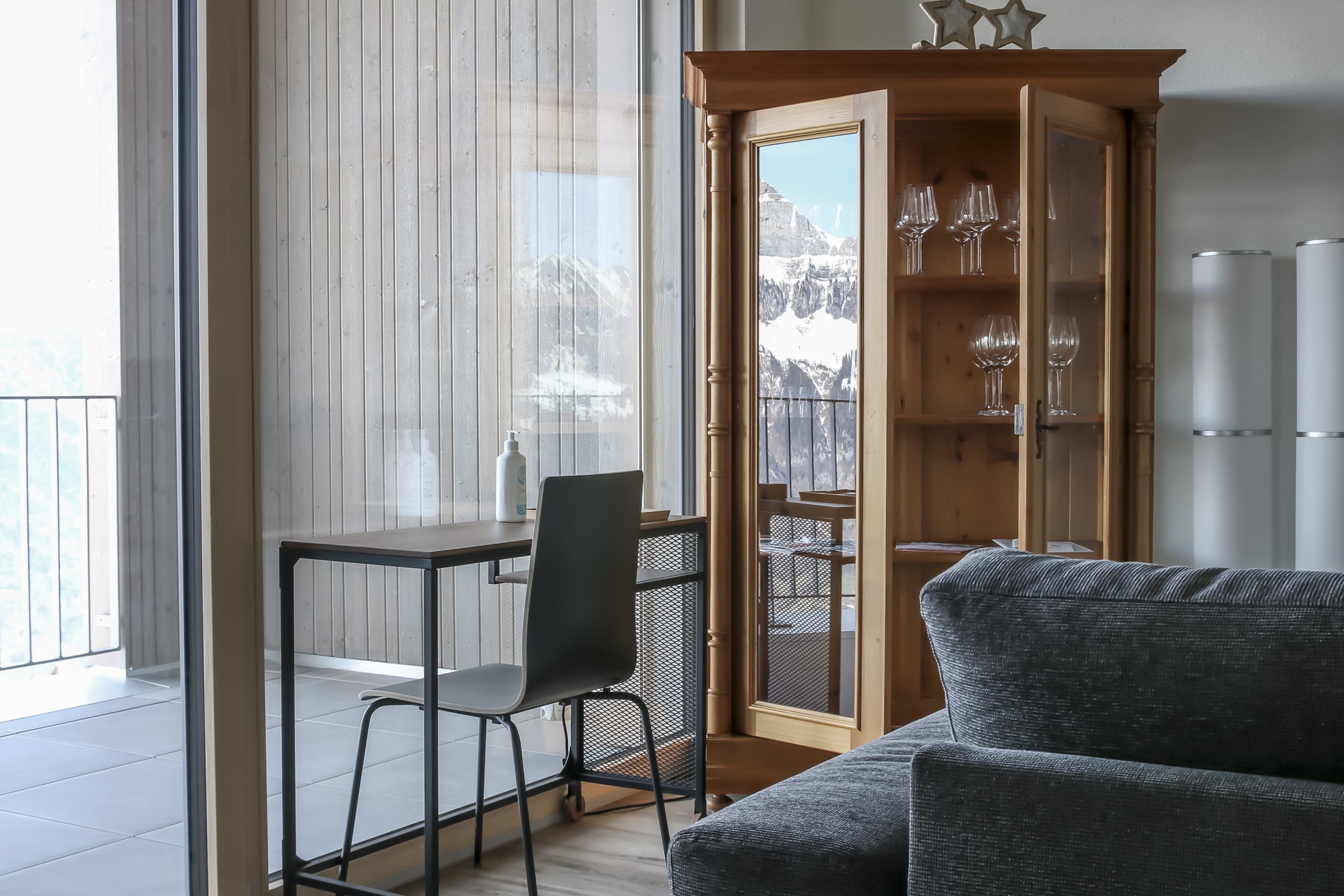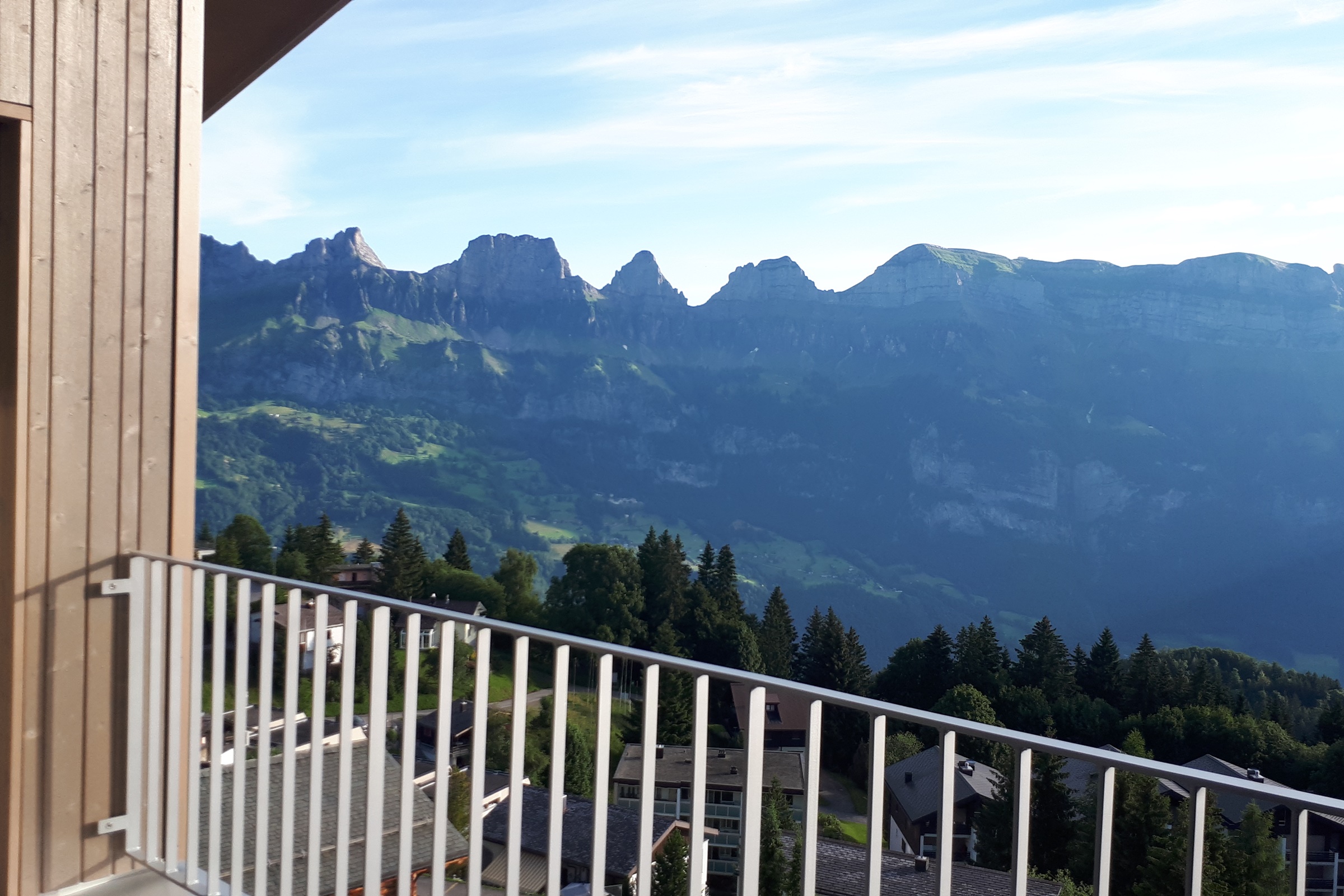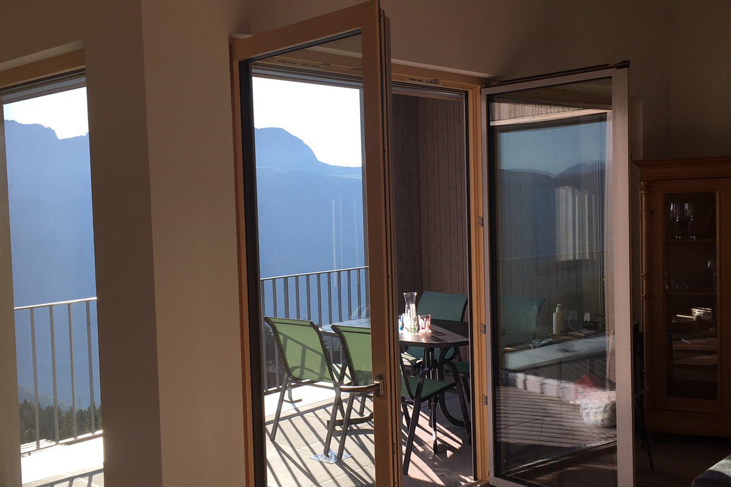 Ein offener Wohnraum mit Küchen-/Essbereich. Im Wohnzimmer befindet sich ein Sofa (ausziehbar für eine Schlafmöglichkeit von 2 Personen) mit Flatscreen-TV und DVD-Player, sowie ein ausziehbarer Esstisch mit Platz für bis zu 8 Personen. Ein Kinderstuhl und Babystuhl ist vorhanden. Grosser gedeckter Balkon mit schöner Aussicht auf die Churfirsten Bergkette. Küche