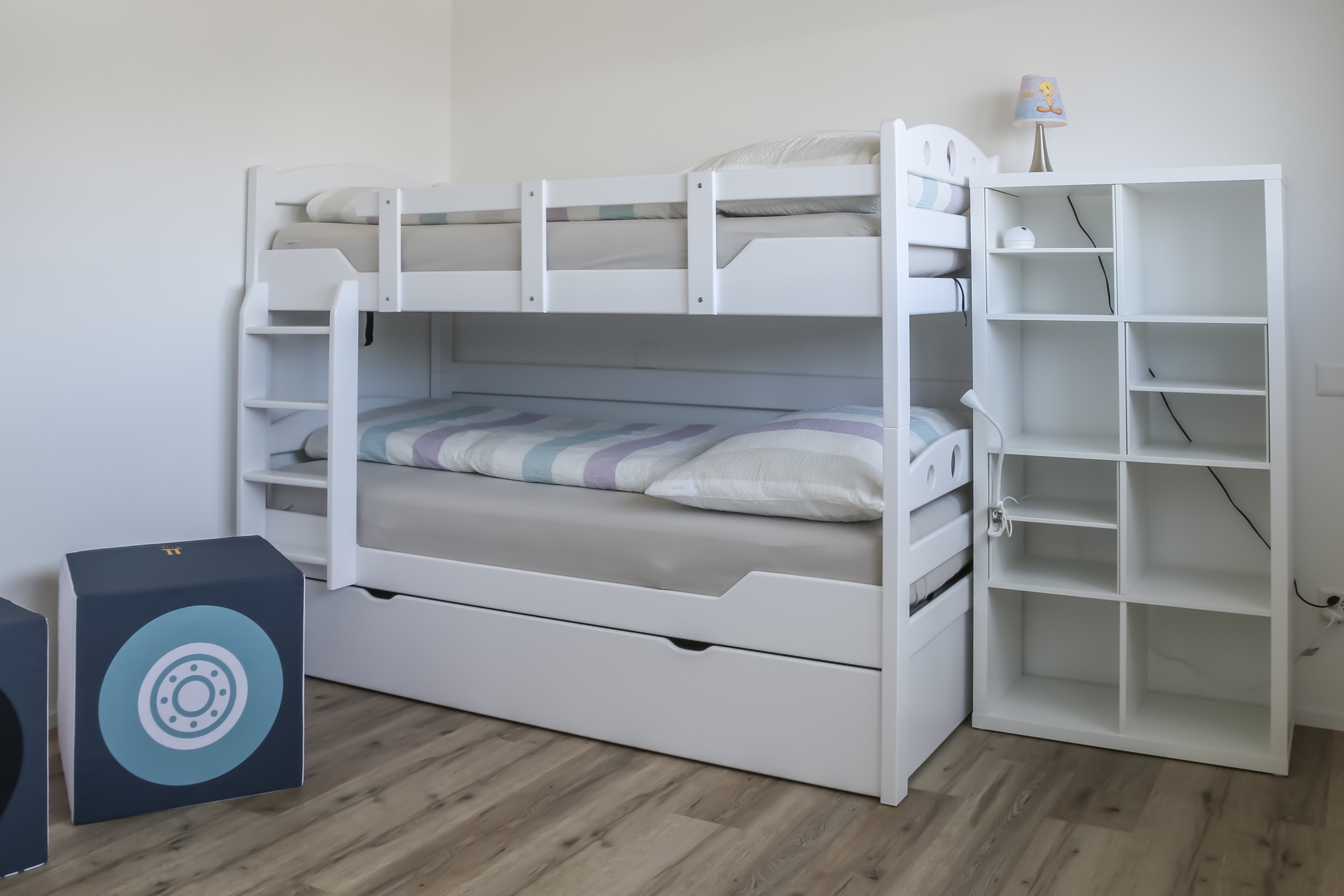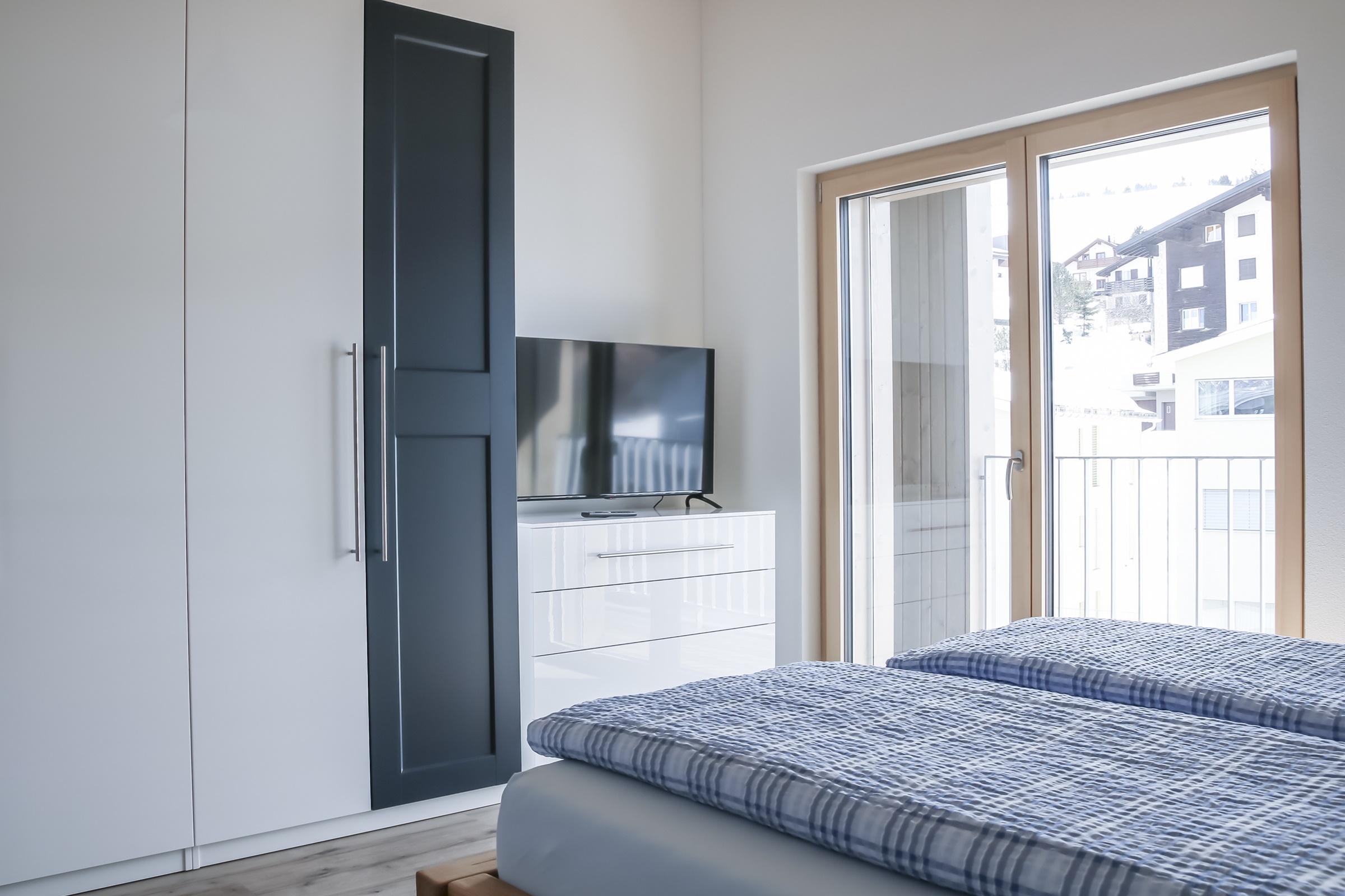 2 Schlafzimmer: Ein Schlafzimmer mit Doppelbett, Babybett (wird auf Wunsch aufgestellt), ein grosser Kleiderschrank, ein Flatscreen-TV und kleinem Balkon. Ein Schlafzimmer mit Kajütenbett und ausziehbarem Zusatzbett (3 Pers.), ein grosser Kleiderschrank.Badezimmer