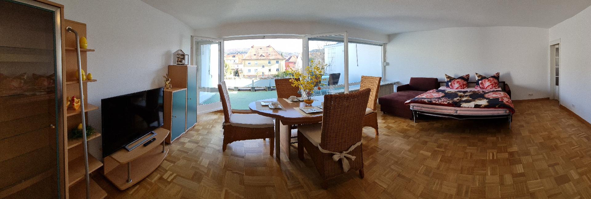 Die Ferienwohnung liegt am Anfang des Sinnbergs, in einer ruhigen und gepflegten Wohngegend. Ein kleines Einkaufszentrum mit Bäckerei, Apotheke, Bank, Post, Wäscherei, Elektronikmarkt, Blumenladen und verschiedenen Arztpraxen befindet sich gleich um die Ecke.