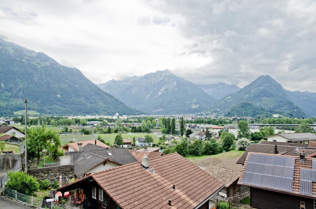 Einfache 3.5-Zimmerwohnung für 4 Personen in Goldswil – sonniger Balkon mit Aussicht über Interlaken und Berge.
