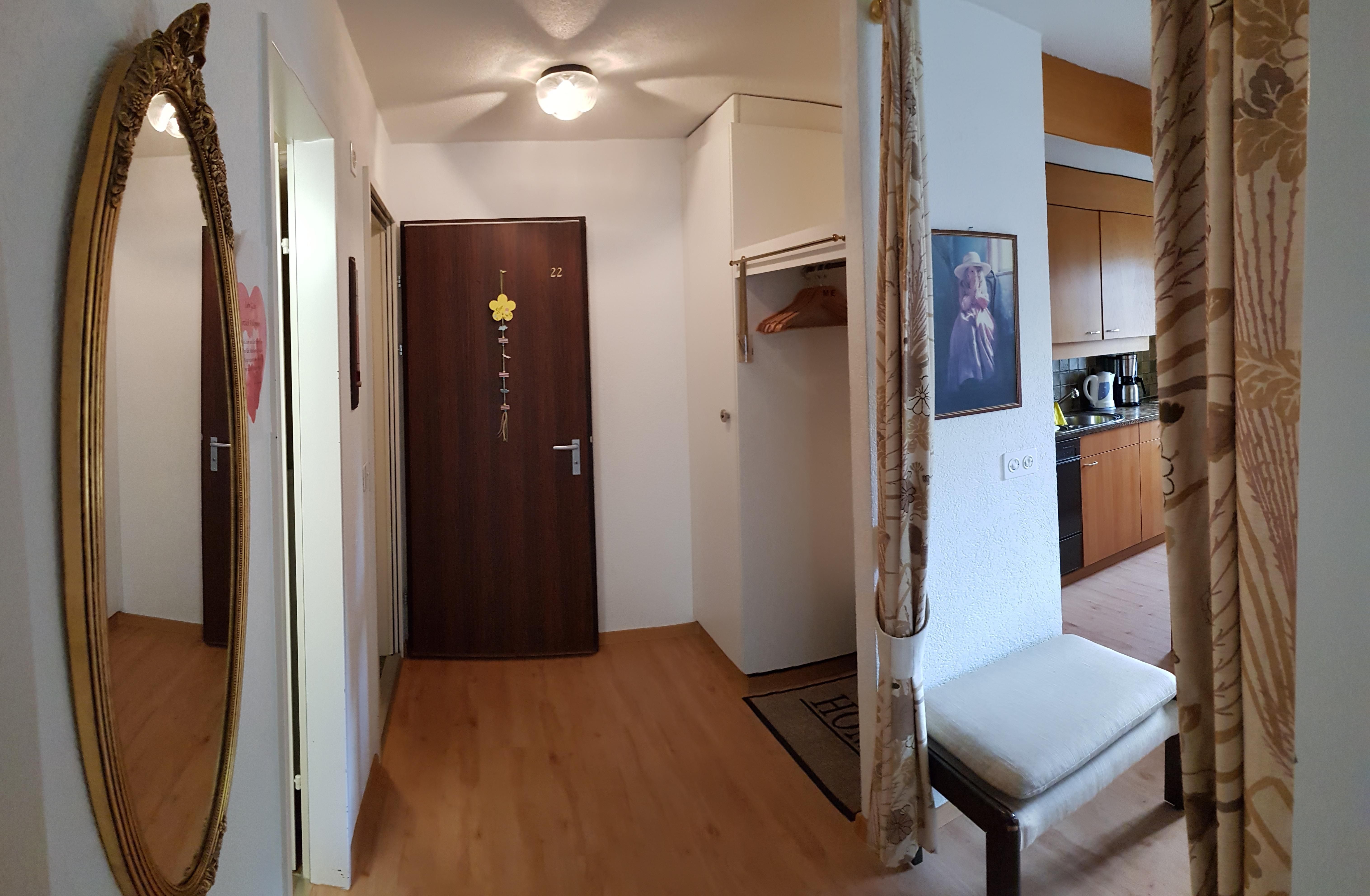 Entrée – offene Garderobe mit Kleiderbügeln – Putzschrank (mit Staubsauger etc.)
