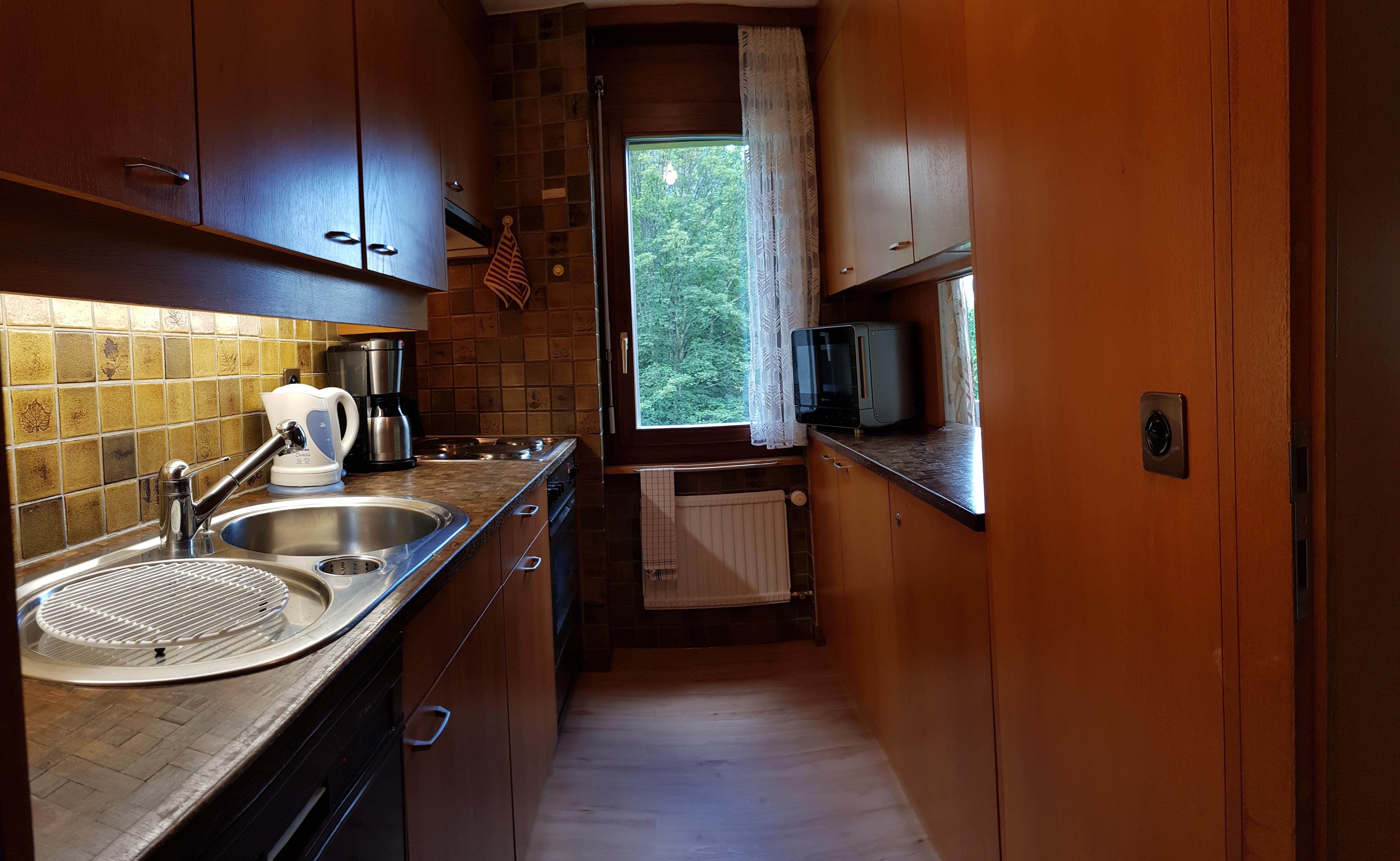 Vollausgestattete separate Küche – Filter-Kaffeemaschine – Wasserkocher – Toaster – Kühlschrank – Elektroherd – Backofen – Mikrowelle – Geschirrspüler