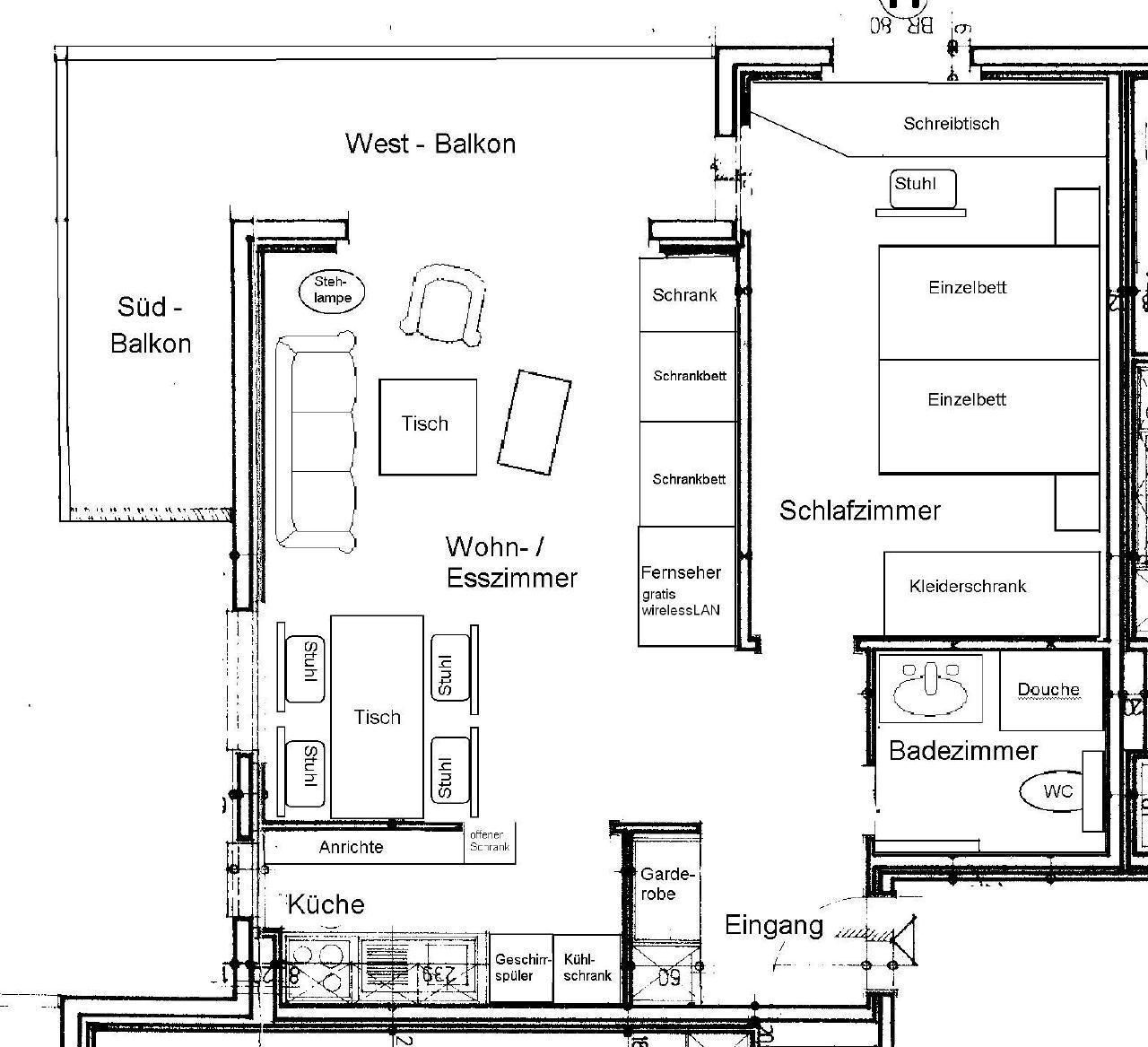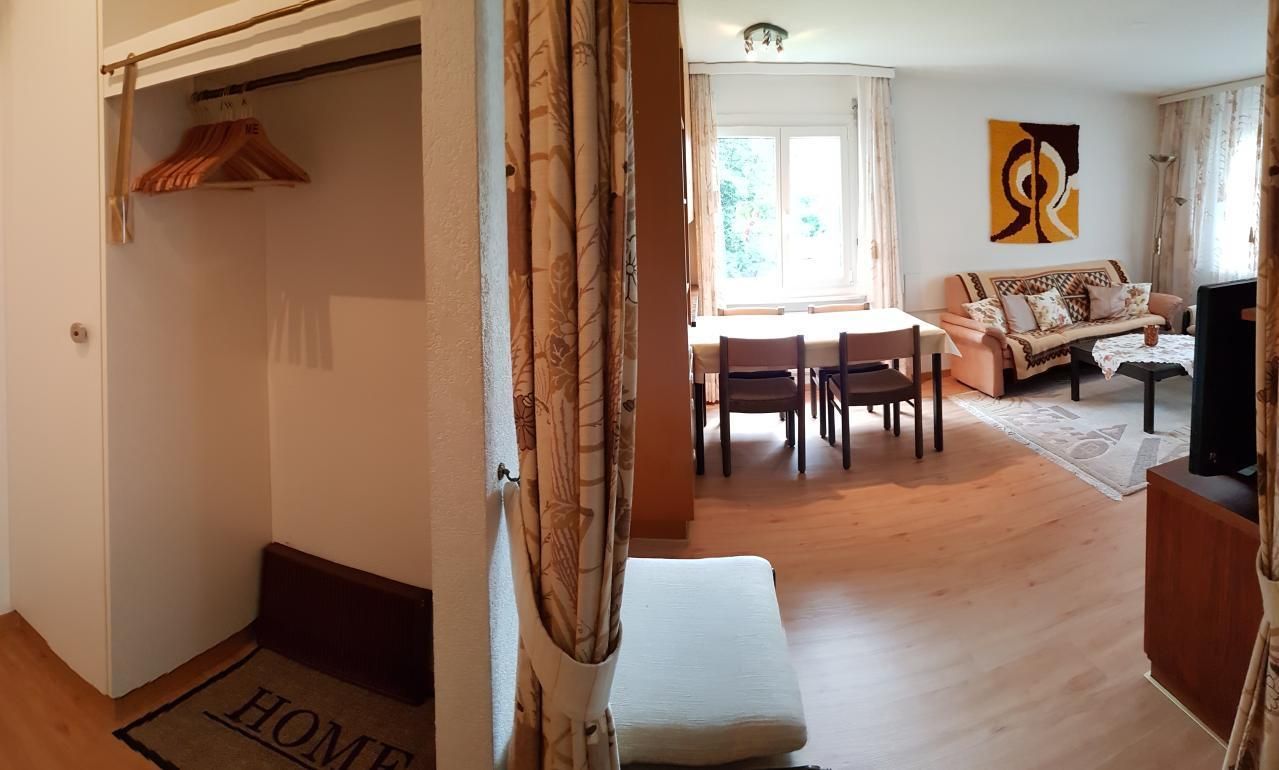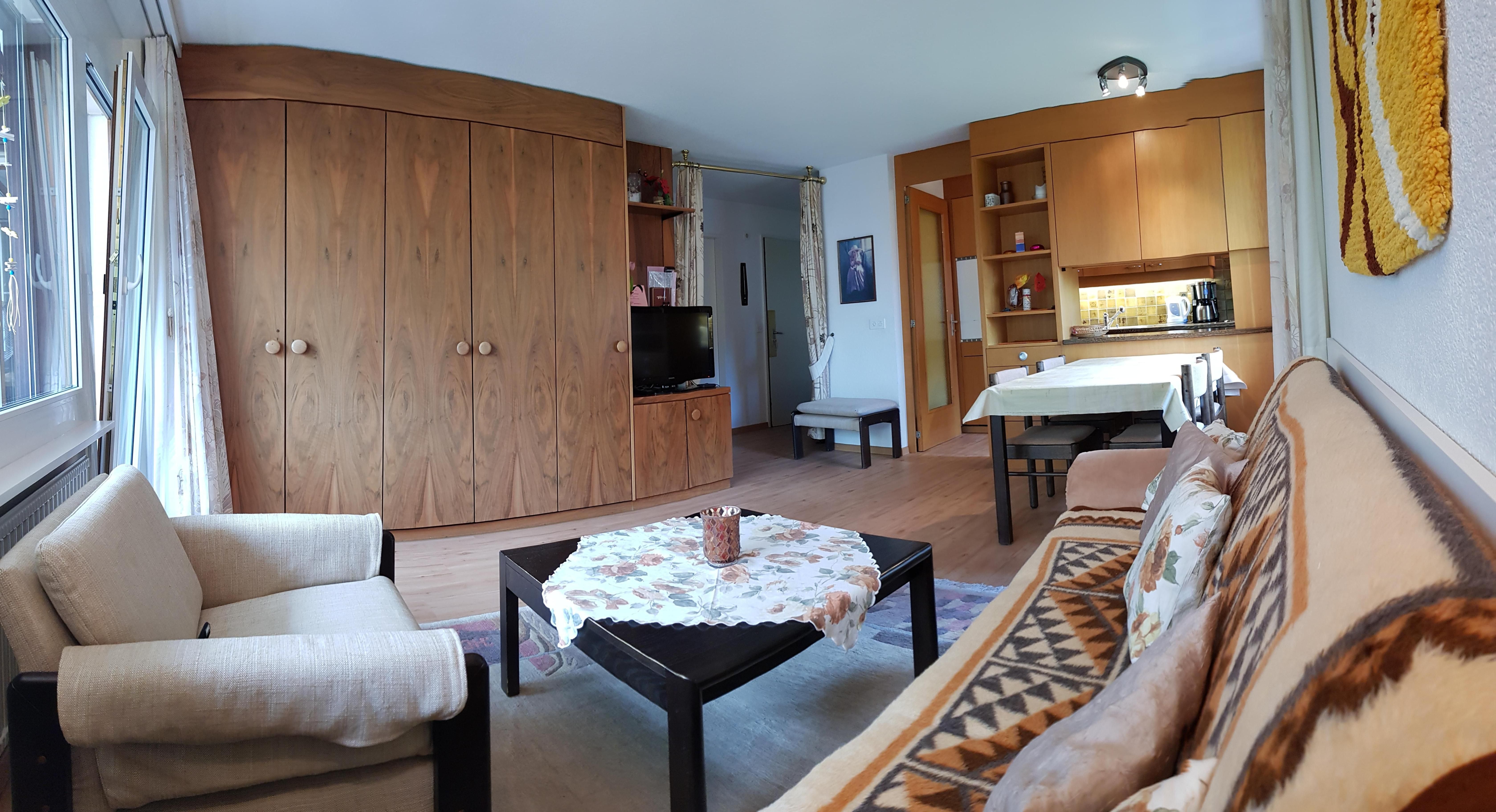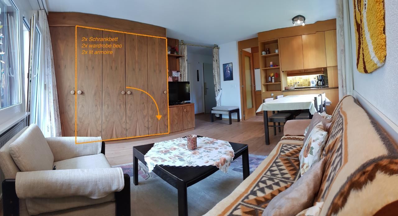 Wohn-/Esszimmer – Esstisch (ausziehbar) – Couch – Sessel – TV – WiFi gratis – Kleiderschrank – 2 Schrankbetten