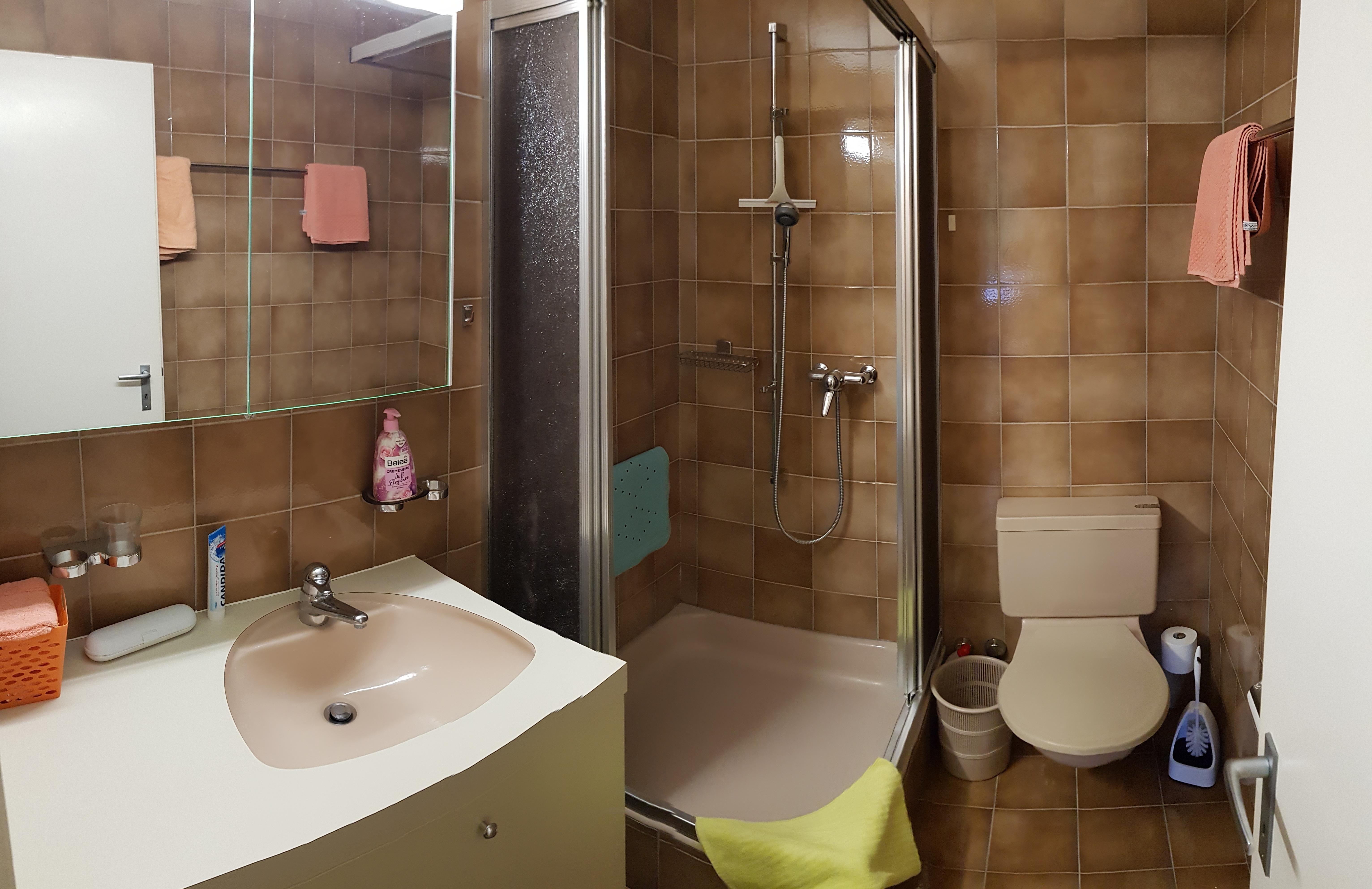 Bad - Dusche - WC – Spiegelschrank – Lavabo - Haarfön – Frotteewäsche – Wäschekippe für Schmutzwäsche