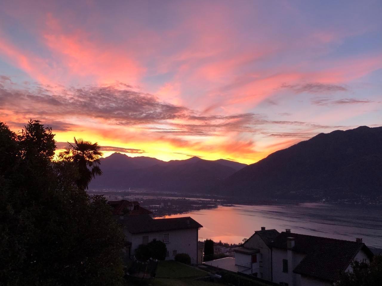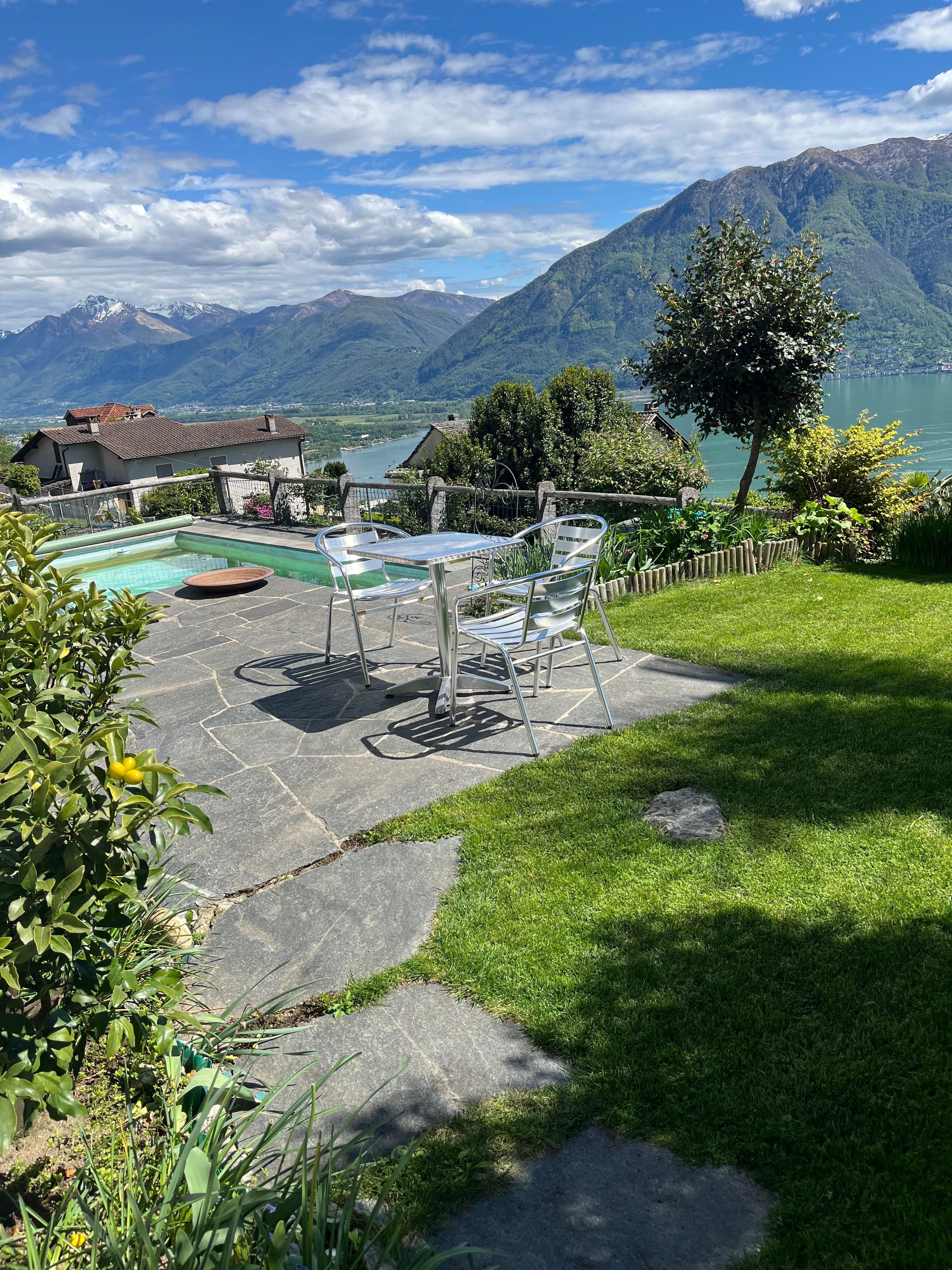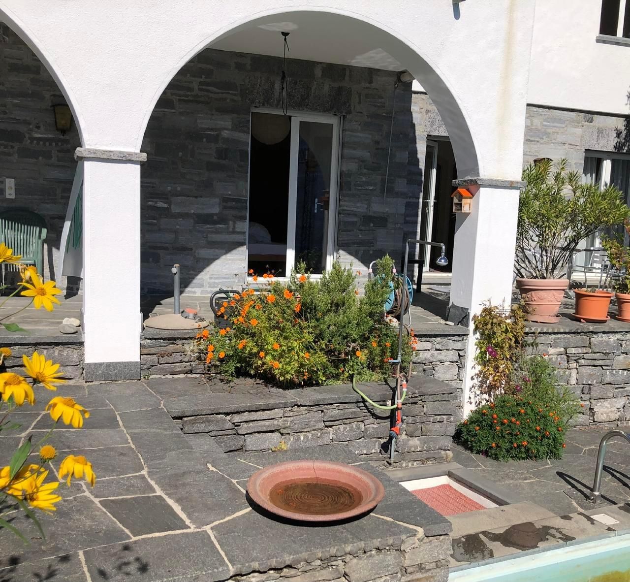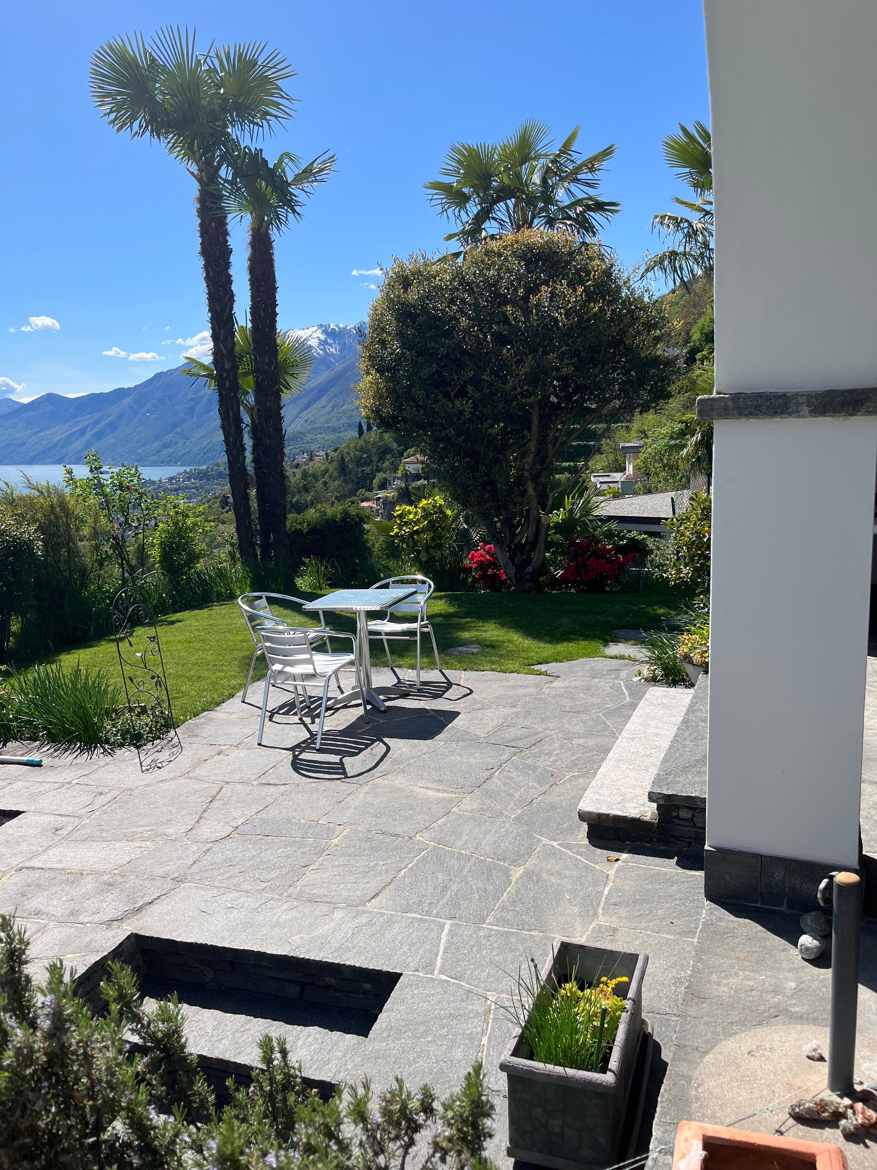 Die Ferienwohnung von ca 65 m2 Grösse und einer grossen Terasse, liegt sehr ruhig in Brione, auf einem Hügel oberhalb Locarno. Von hier aus geniessen Sie eine wunderschöne Aussicht um 180° auf den See, die Brissagoinseln und die umliegenden Berge. Über eine Gartentreppe und über Ihre eigene , zum Teil gedeckte Terasse treten Sie direkt in ihr Wohnzimmer ein. Darin gibt es einen Tisch mit 4 Stühlen, einen Lehnstuhl und ein Sofa, das sich auch in ein Bett verwandeln lässt. Ein TV und ein Radio sind vorhanden. Durch eine Türe treten Sie ins Schlafzimmer ein mit 2 Betten und 2 Kleiderschränken. Durch eine 2. Türe vom Wohnzimmer aus kommen Sie in den hinteren Teil der Wohnung mit der Küche und dem Badezimmer mit einer Dusche. Vor ihrer Terasse liegt das Schwimmbad und eine Liegewiese.Zwei kleine Restaurants und ein Grotto befinden sich im alten Dorfkern von Brione etwa 200 m zu Fuss vom Haus entfernt, auch die Busstation ist dort, nahe der Kirche. Direkt vom Haus aus können sie schöne Wanderungen und Biketouren unternehmen. Das Seeufer erreichen Sie in 10 Autominuten Nah liegen auch die Bolle di Magadino zur Vogelbeobachtung, das Maggiatal das Verzascatal und das Onsernonetal - um nur 3 der malerischen Täler zu nennen- oder Sie wandern oder fahren auf die umliegenden Berge, oder einfach dem See oder der Maggia entlang . 2 Km von hier, ab Orselina, fährt die Seilbahn zu unserem Hausberg Cardada und Cimetta.Locarno selber besitzt ein Spa und 2 öffentliche Schwimmbäder, den Kamelienpark, eine Falknerei , diverse Museen,eine Burg, sehenswerte Kirchen und eine schöne Altstadt. Ascona liegt 4km entfernt, Bellinzona, die Hauptstadt vom Kanton Tessin mit ihren berühmten Burgen, liegt 16 km , Lugano 22km und Mailand 85km entfernt.Für internationale Bekanntheit sorgen das Filmfestival Locarno, Moon and Stars oder das Jazzfestival Ascona und vieles mehr.Da WLan vorhanden ist, eignet sich die Wohnung auch gut als Home office.
