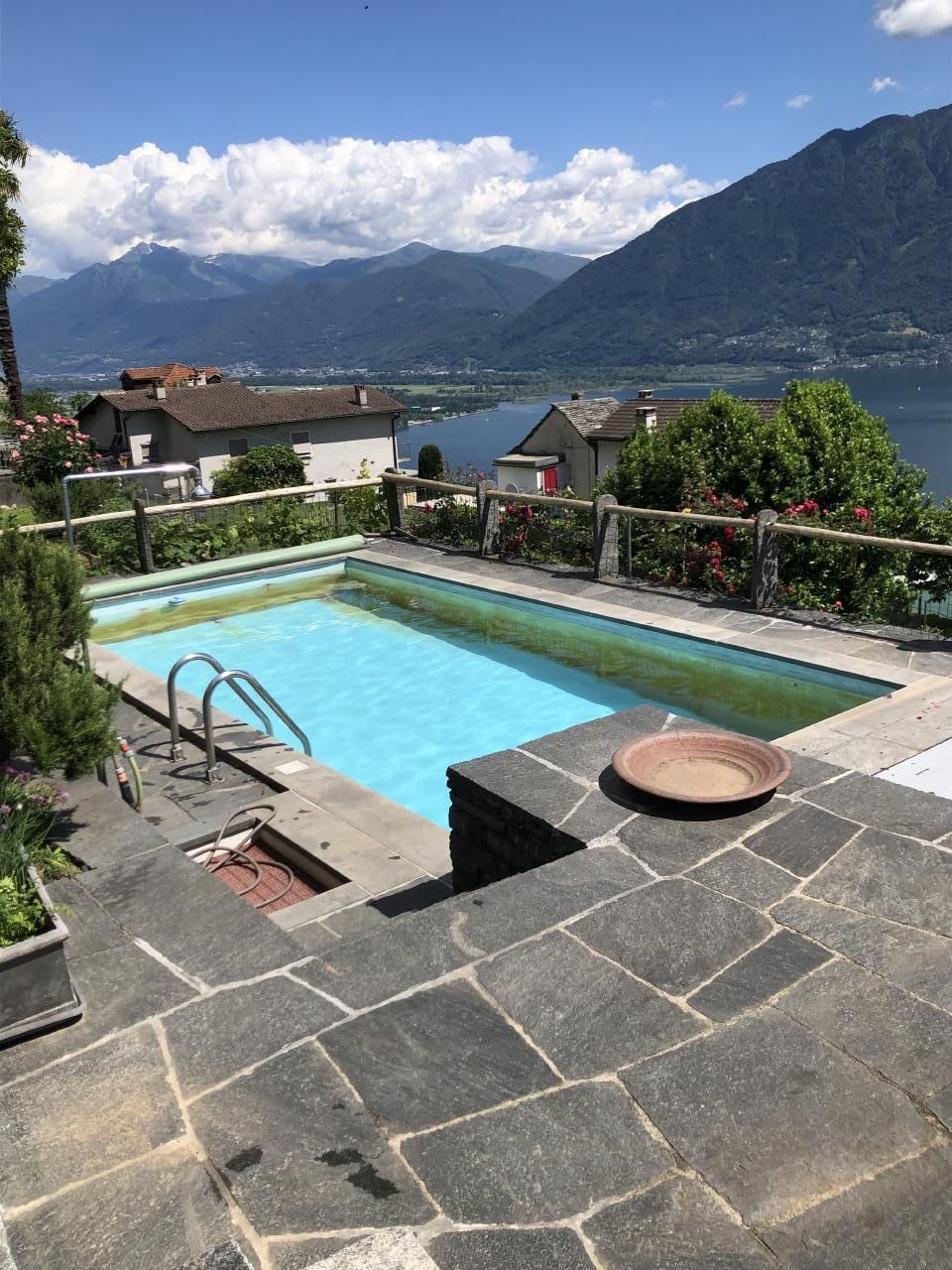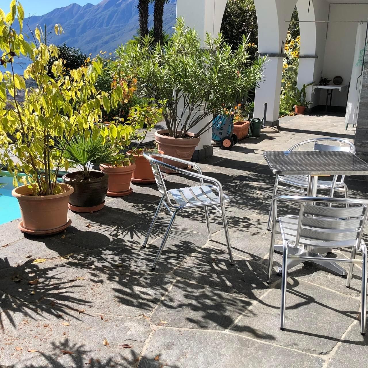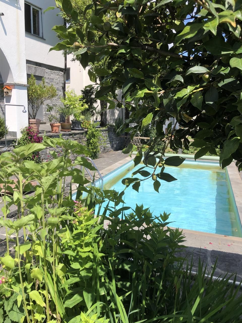 Die Ferienwohnung von ca 65 m2 Grösse und einer grossen Terasse, liegt sehr ruhig in Brione, auf einem Hügel oberhalb Locarno. Von hier aus geniessen Sie eine wunderschöne Aussicht um 180° auf den See, die Brissagoinseln und die umliegenden Berge. Über eine Gartentreppe und über Ihre eigene , zum Teil gedeckte Terasse treten Sie direkt in ihr Wohnzimmer ein. Darin gibt es einen Tisch mit 4 Stühlen, einen Lehnstuhl und ein Sofa, das sich auch in ein Bett verwandeln lässt. Ein TV und ein Radio sind vorhanden. Durch eine Türe treten Sie ins Schlafzimmer ein mit 2 Betten und 2 Kleiderschränken. Durch eine 2. Türe vom Wohnzimmer aus kommen Sie in den hinteren Teil der Wohnung mit der Küche und dem Badezimmer mit einer Dusche. Vor ihrer Terasse liegt das Schwimmbad und eine Liegewiese.Zwei kleine Restaurants und ein Grotto befinden sich im alten Dorfkern von Brione etwa 200 m zu Fuss vom Haus entfernt, auch die Busstation ist dort, nahe der Kirche. Direkt vom Haus aus können sie schöne Wanderungen und Biketouren unternehmen. Das Seeufer erreichen Sie in 10 Autominuten Nah liegen auch die Bolle di Magadino zur Vogelbeobachtung, das Maggiatal das Verzascatal und das Onsernonetal - um nur 3 der malerischen Täler zu nennen- oder Sie wandern oder fahren auf die umliegenden Berge, oder einfach dem See oder der Maggia entlang . 2 Km von hier, ab Orselina, fährt die Seilbahn zu unserem Hausberg Cardada und Cimetta.Locarno selber besitzt ein Spa und 2 öffentliche Schwimmbäder, den Kamelienpark, eine Falknerei , diverse Museen,eine Burg, sehenswerte Kirchen und eine schöne Altstadt. Ascona liegt 4km entfernt, Bellinzona, die Hauptstadt vom Kanton Tessin mit ihren berühmten Burgen, liegt 16 km , Lugano 22km und Mailand 85km entfernt.Für internationale Bekanntheit sorgen das Filmfestival Locarno, Moon and Stars oder das Jazzfestival Ascona und vieles mehr.Da WLan vorhanden ist, eignet sich die Wohnung auch gut als Home office.