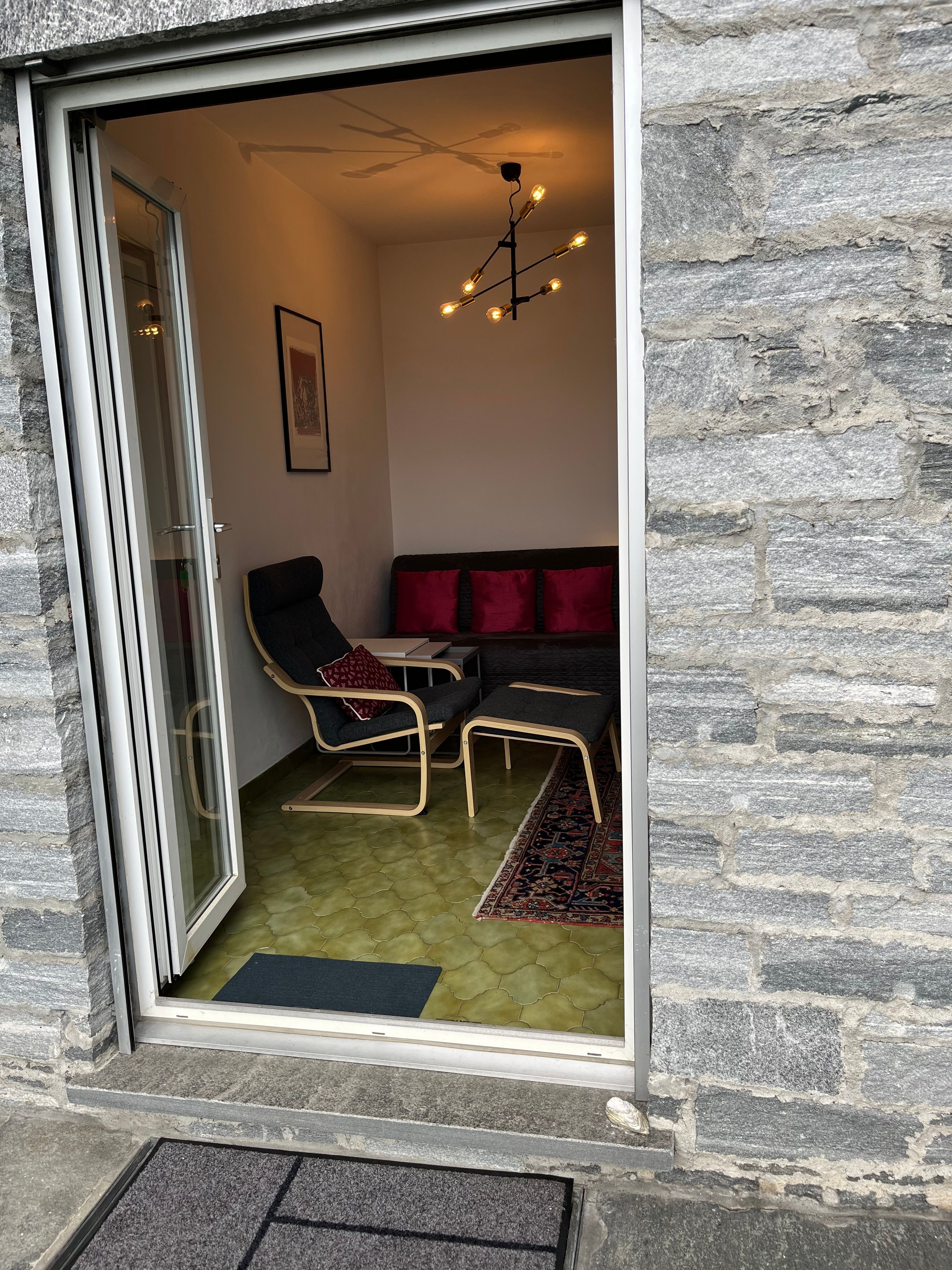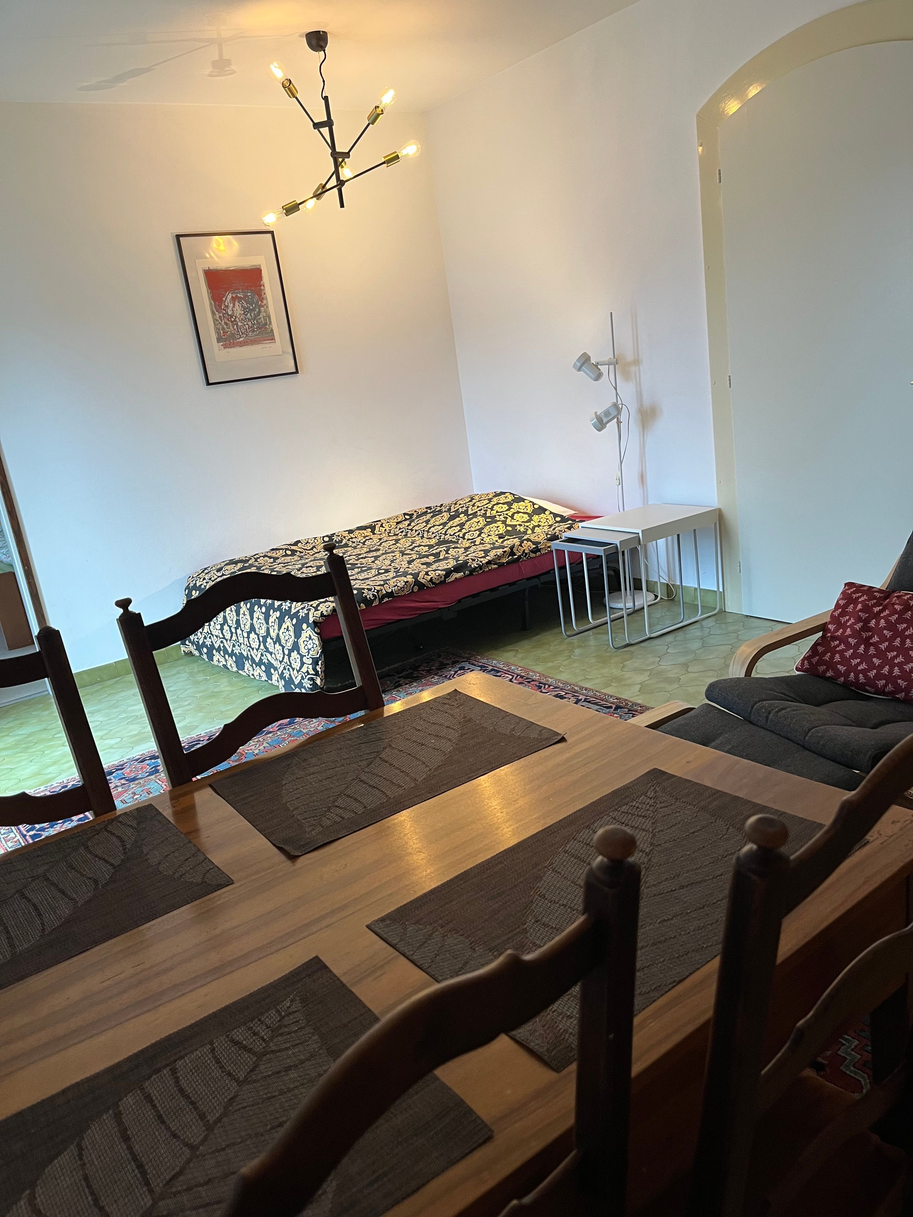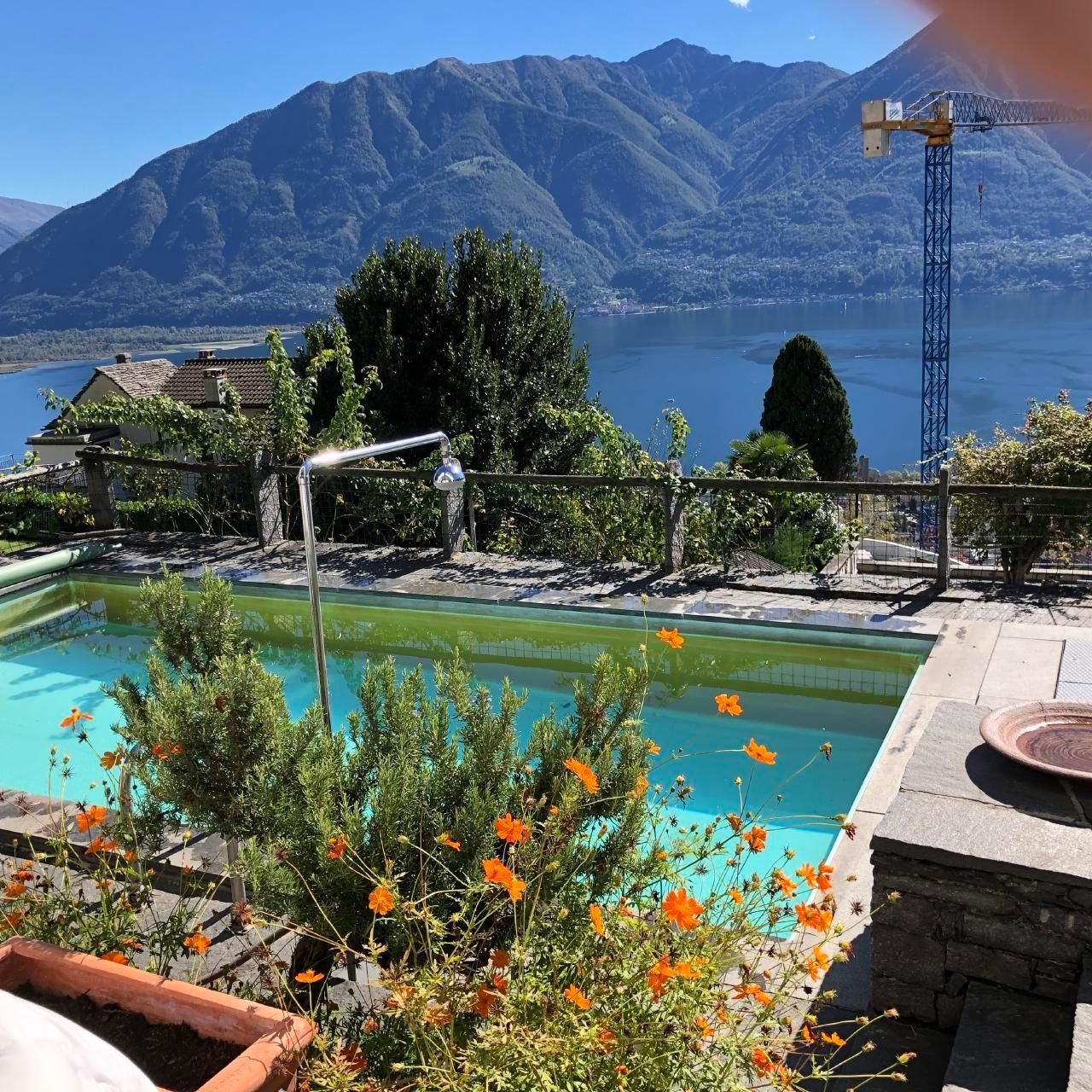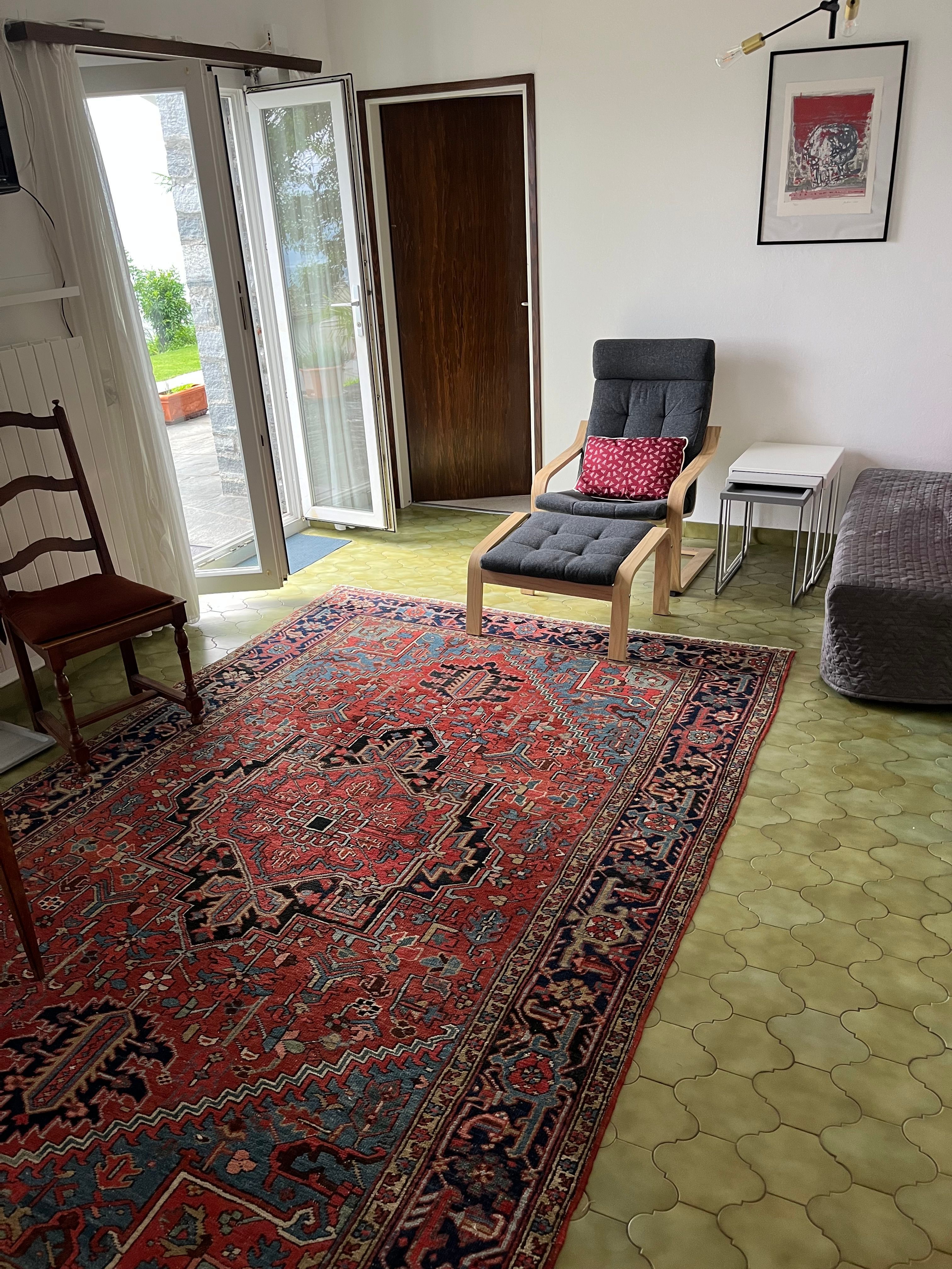 Die Ferienwohnung von ca 65 m2 Grösse und einer grossen Terasse, liegt sehr ruhig in Brione, auf einem Hügel oberhalb Locarno. Von hier aus geniessen Sie eine wunderschöne Aussicht um 180° auf den See, die Brissagoinseln und die umliegenden Berge. Über eine Gartentreppe und über Ihre eigene , zum Teil gedeckte Terasse treten Sie direkt in ihr Wohnzimmer ein. Darin gibt es einen Tisch mit 4 Stühlen, einen Lehnstuhl und ein Sofa, das sich auch in ein Bett verwandeln lässt. Ein TV und ein Radio sind vorhanden. Durch eine Türe treten Sie ins Schlafzimmer ein mit 2 Betten und 2 Kleiderschränken. Durch eine 2. Türe vom Wohnzimmer aus kommen Sie in den hinteren Teil der Wohnung mit der Küche und dem Badezimmer mit einer Dusche. Vor ihrer Terasse liegt das Schwimmbad und eine Liegewiese.Zwei kleine Restaurants und ein Grotto befinden sich im alten Dorfkern von Brione etwa 200 m zu Fuss vom Haus entfernt, auch die Busstation ist dort, nahe der Kirche. Direkt vom Haus aus können sie schöne Wanderungen und Biketouren unternehmen. Das Seeufer erreichen Sie in 10 Autominuten Nah liegen auch die Bolle di Magadino zur Vogelbeobachtung, das Maggiatal das Verzascatal und das Onsernonetal - um nur 3 der malerischen Täler zu nennen- oder Sie wandern oder fahren auf die umliegenden Berge, oder einfach dem See oder der Maggia entlang . 2 Km von hier, ab Orselina, fährt die Seilbahn zu unserem Hausberg Cardada und Cimetta.Locarno selber besitzt ein Spa und 2 öffentliche Schwimmbäder, den Kamelienpark, eine Falknerei , diverse Museen,eine Burg, sehenswerte Kirchen und eine schöne Altstadt. Ascona liegt 4km entfernt, Bellinzona, die Hauptstadt vom Kanton Tessin mit ihren berühmten Burgen, liegt 16 km , Lugano 22km und Mailand 85km entfernt.Für internationale Bekanntheit sorgen das Filmfestival Locarno, Moon and Stars oder das Jazzfestival Ascona und vieles mehr.Da WLan vorhanden ist, eignet sich die Wohnung auch gut als Home office.