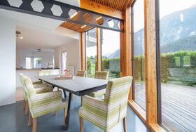 Das ist unser Appartement Villa mit ca. 160 m² das sich mit eigenem Eingang über 2 Etagen erstreckt. Große Fenster und hohe Räume sind hier Programm. Unsere Villa besteht aus: 2 Doppelzimmer mit jeweils Dusche/WC, 1 Doppelzimmer mit Badezimmer mit Badewanne und Dusche, 1 Galerie mit Schlafsofa für 2 Personen 1 gemütlichem Wohnzimmer mit Kachelofen und Sitzecke, der Essbereich befindet sich im lichtdurchfluteten Wintergarten. Von der Küche (Kühlschrank/Gefrierfach, Induktionsherd, Backrohr, Bohnenkaffee-Maschine, Geschirrspülmaschine uvm.) - gelangen Sie auf die möblierte Terrasse.