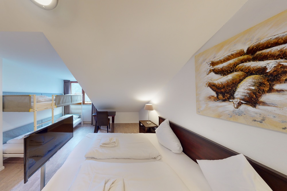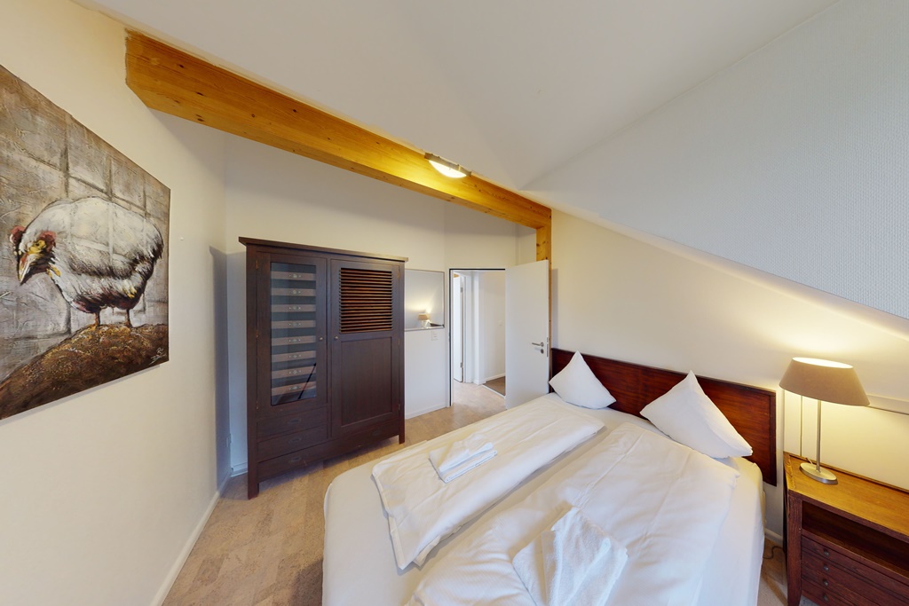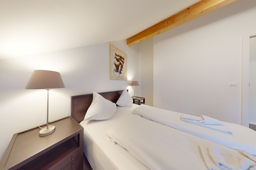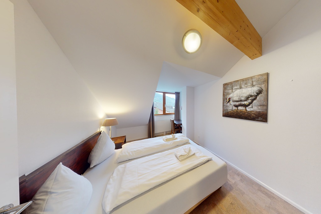 Die Dachwohnung verfügt überZwei Etagen 3 Schlafzimmer mit King-Size Bettenein Badezimmer mit Bad/Dusche, Toilette und Lavaboeine separate Toilette mit Lavaboeine komplett ausgestattete Küche mit Nespresso-Kapselmaschineein Balkon mit BergsichtInneneinrichtung & Technik