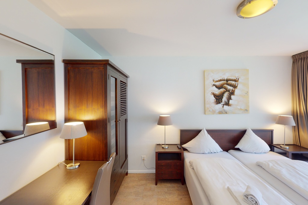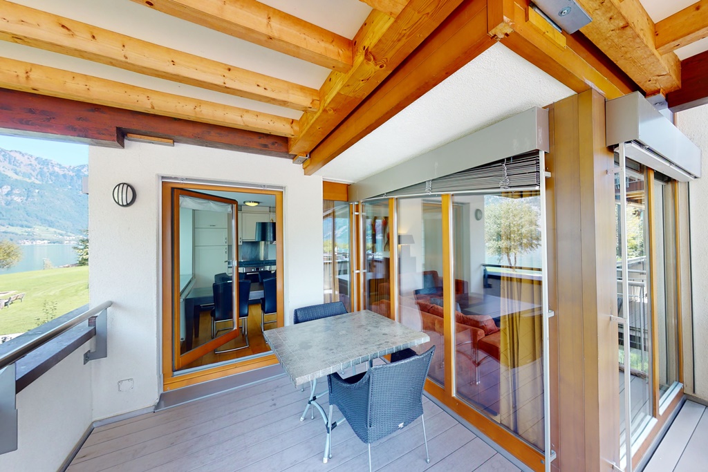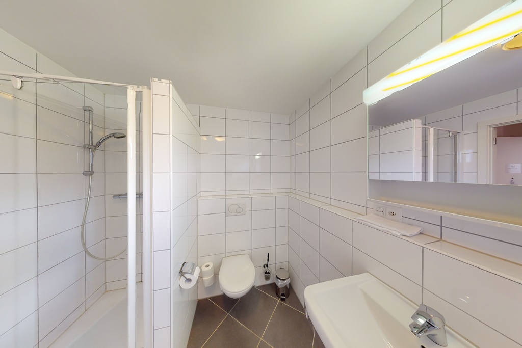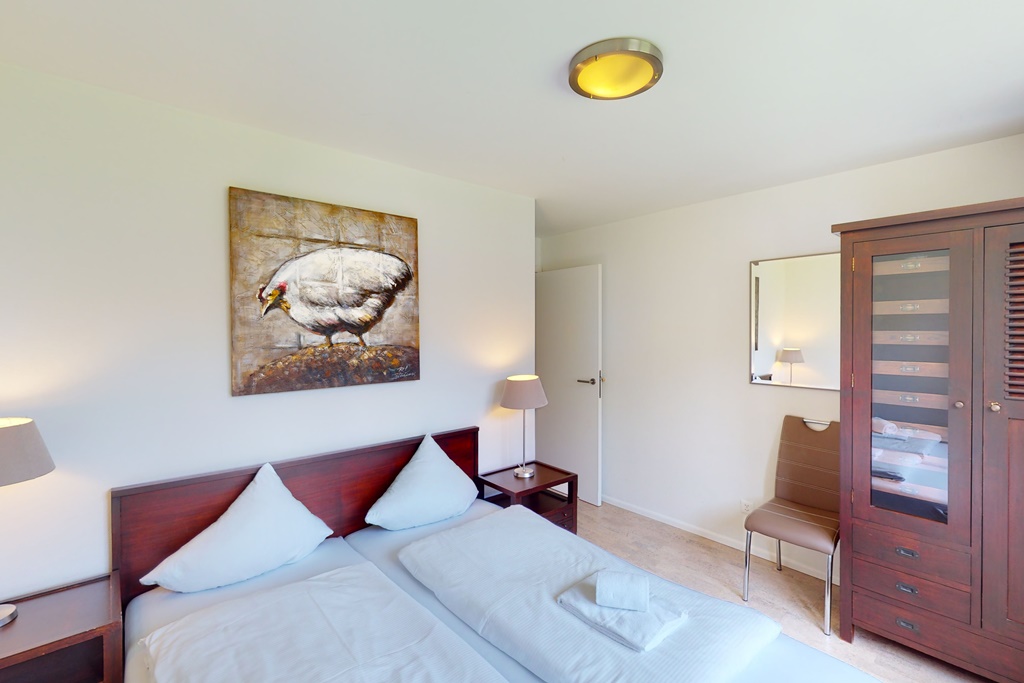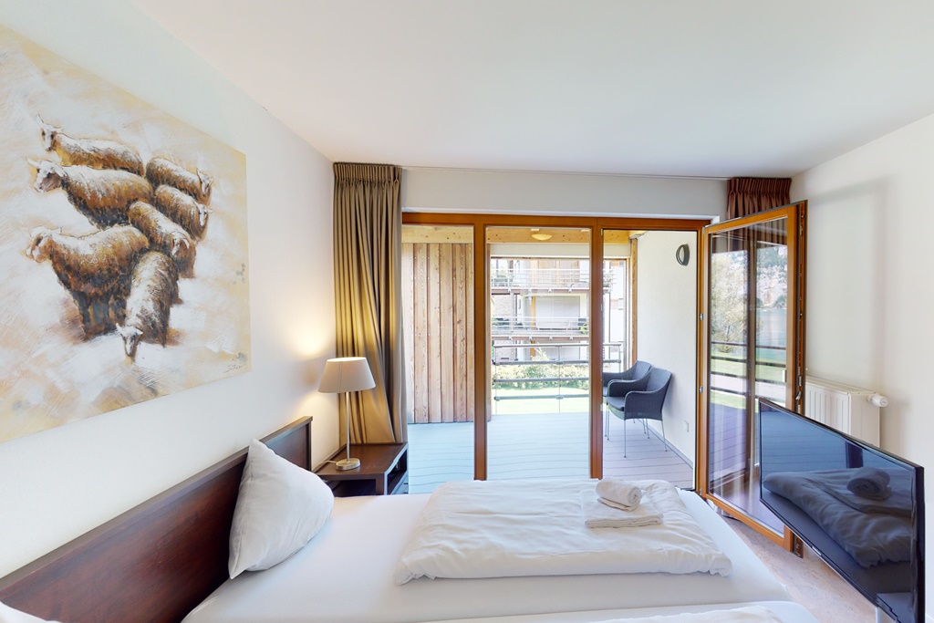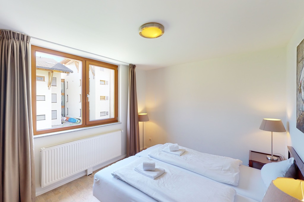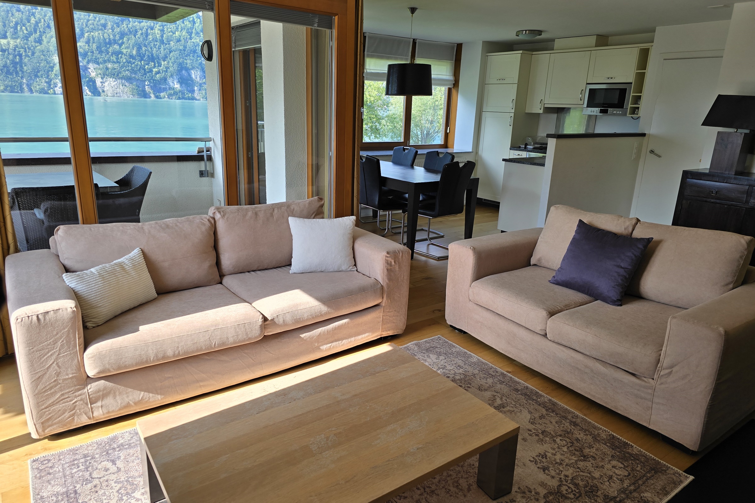 Die Ferienwohnung verfügt über2 Schlafzimmer mit je 2 Einzelbettenein Badezimmer mit Badewanne/Dusche, Toilette und Lavaboeine separate Toilette mit Lavaboeine komplett ausgestattete Küche mit Nespresso-Kapselmaschineein Balkon mit Bergsicht und teils SeesichtInneneinrichtung & Technik