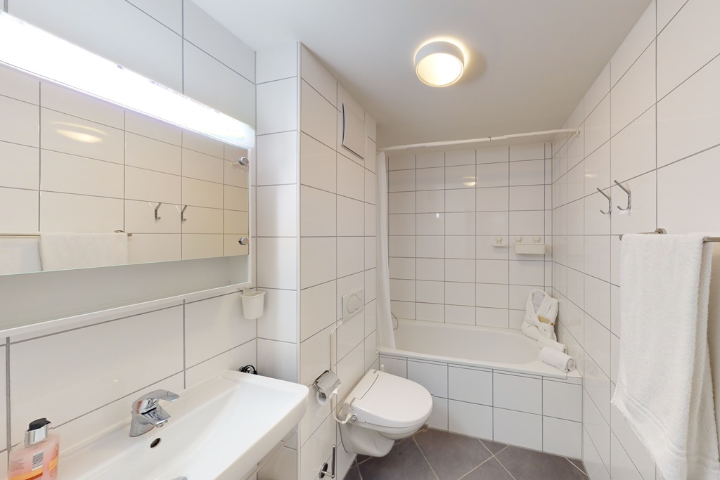 Die Ferienwohnung verfügt über2 Schlafzimmer mit je 2 Einzelbettenein Badezimmer mit Badewanne/Dusche, Dusch-WC und Lavaboeine separate Toilette mit Lavaboeine komplett ausgestattete Küche mit Nespresso-Kapselmaschineein Balkon mit BergsichtInneneinrichtung & Technik