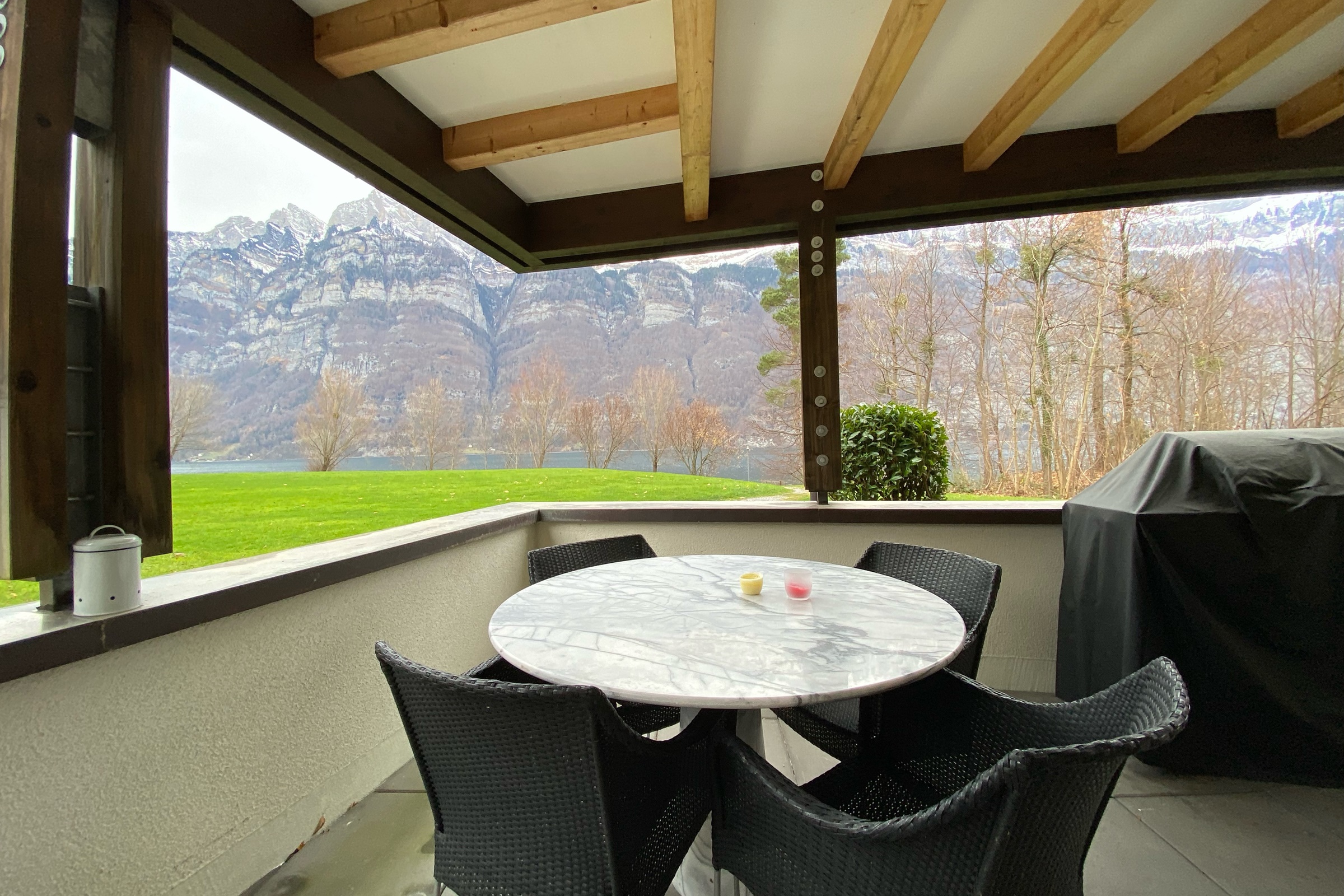 Die Ferienwohnung verfügt über2 Schlafzimmerein Badezimmer mit Whirlpool, Dusche, Sauna, Solarium Toilette und Lavabo zusätzliches Gästebadeine komplett ausgestattete Küche mit Nespresso-Kapselmaschineeine Terrasse mit See- und Bergsicht (136m2)direkter SeezugangInneneinrichtung & Technik