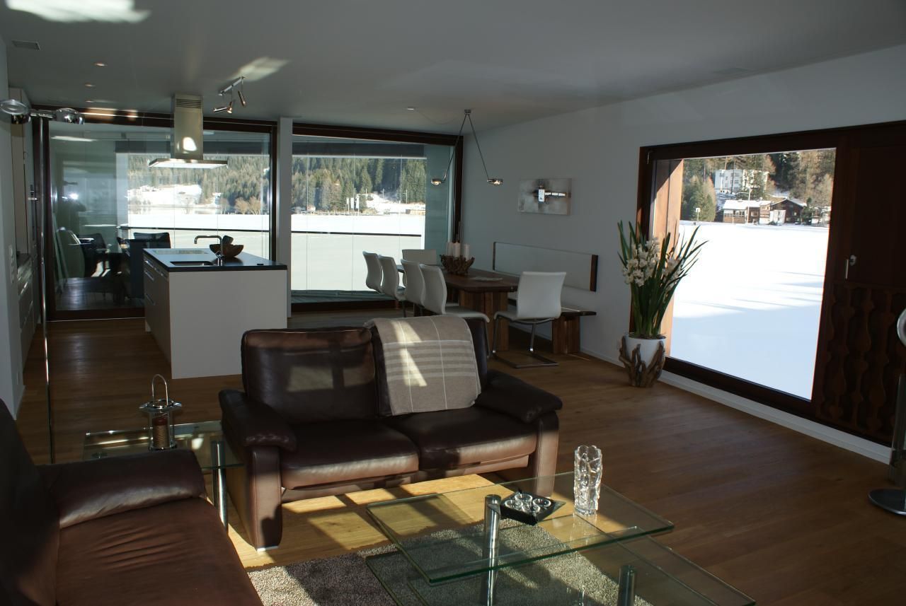Die Lage mit direkter Sicht und Nähe zum See, sowie die Grösse und Qualität der Wohnung lädt zum geniessen ein. Das offene Wohnzimmer verfügt über einen direkten Zugang zu den 2 Loggias mit einzigartiger Aussicht zum Davosersee und den Davoserbergen. Die Wohnung misst 143 m2.
