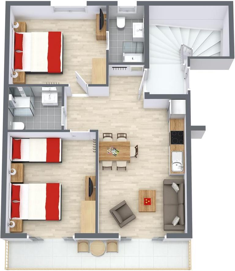 Bei einer Belegung bis zu 3 Personen steht nur ein Schlafzimmer und ein Badezimmer zur Verfügung.