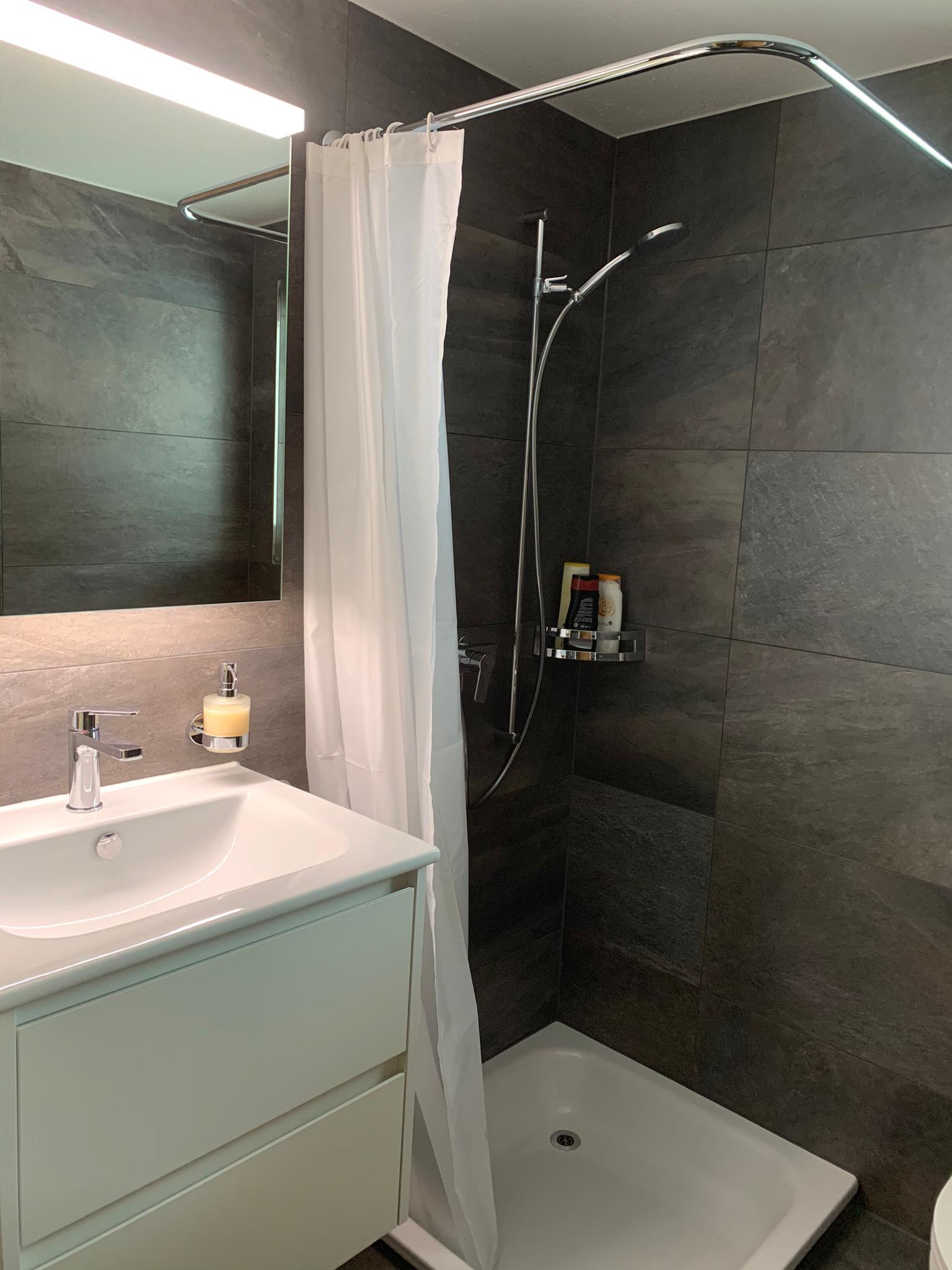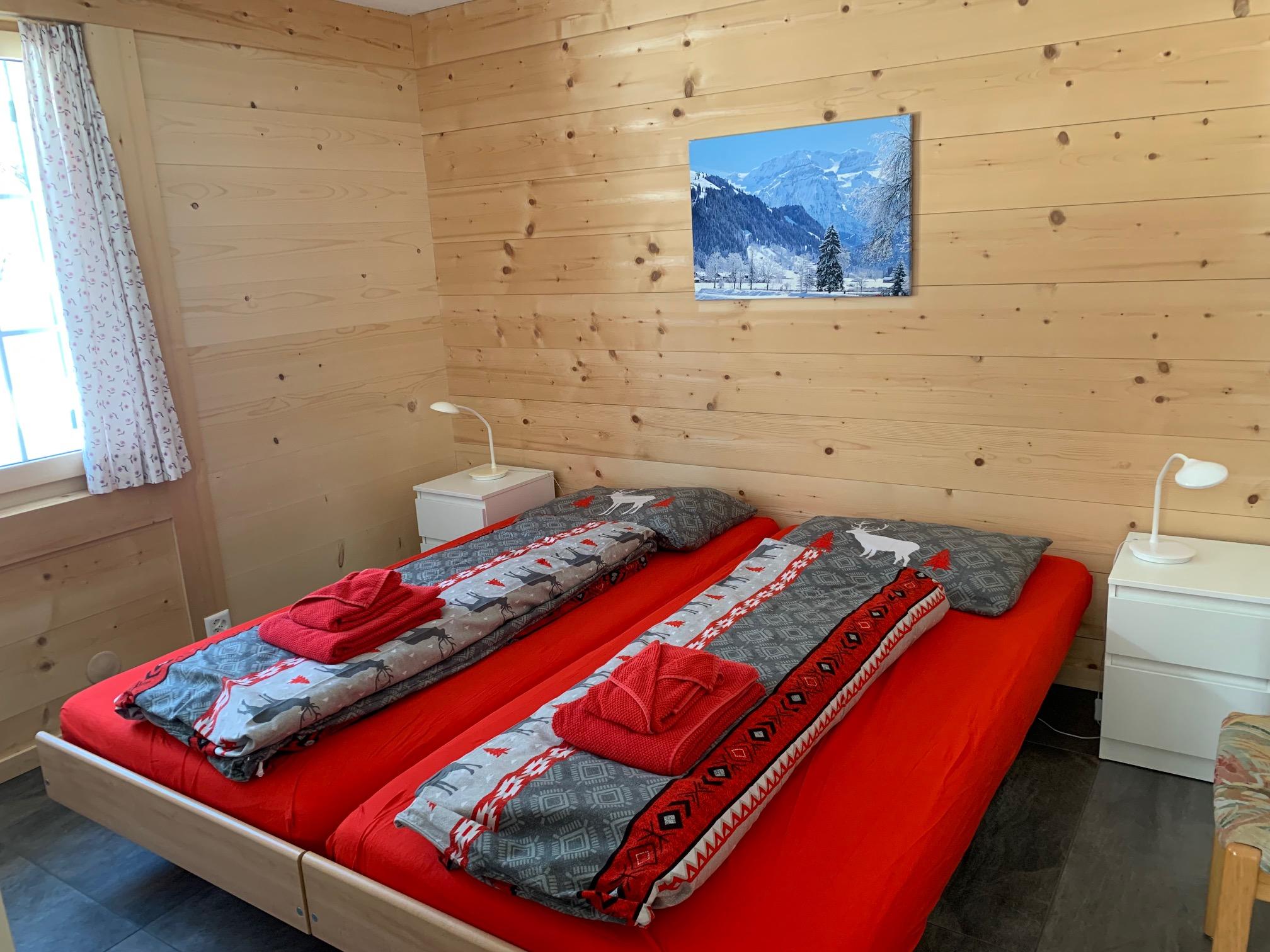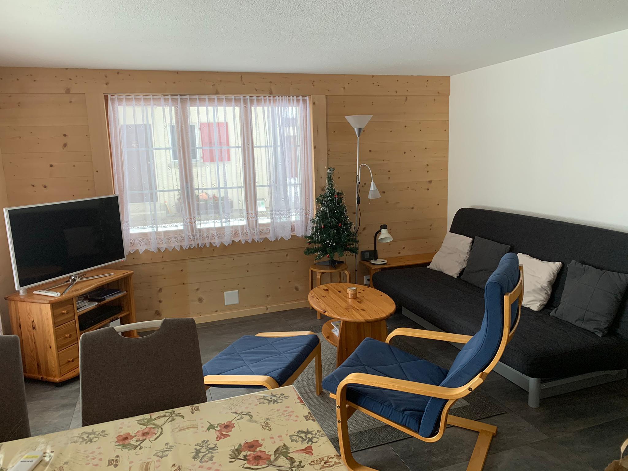 Gemütliche Wohnung mit schöner, offener Küche mit Geschirrspüler, Wohnzimmer mit Esstisch, TV & Radio, 1 Doppelschlafzimmer mit zwei aneinander gereihten Einzelbetten und 1 Bettsofa im Wohnzimmer mit grosser Matratze (1.40m x 2.00m), Badezimmer mit Dusche / WC. Die Parterre Wohnung ist praktisch schwellenlos.