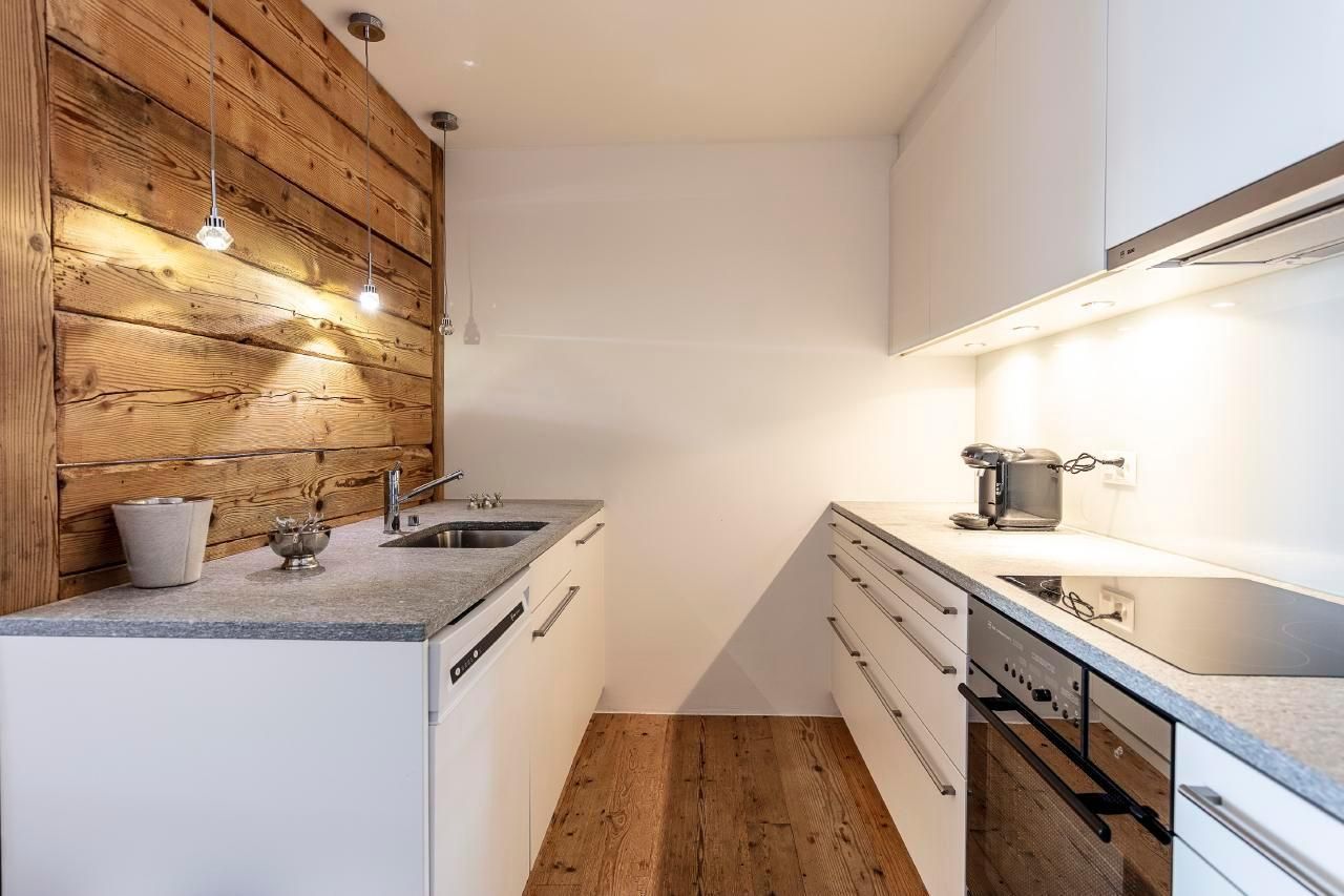 Die Küche ist mit einer Spülmaschine und einem Dampf-Backofen von Zug ausgestattet sowie mit einem Kühlschrank mit Gefrierfach.