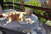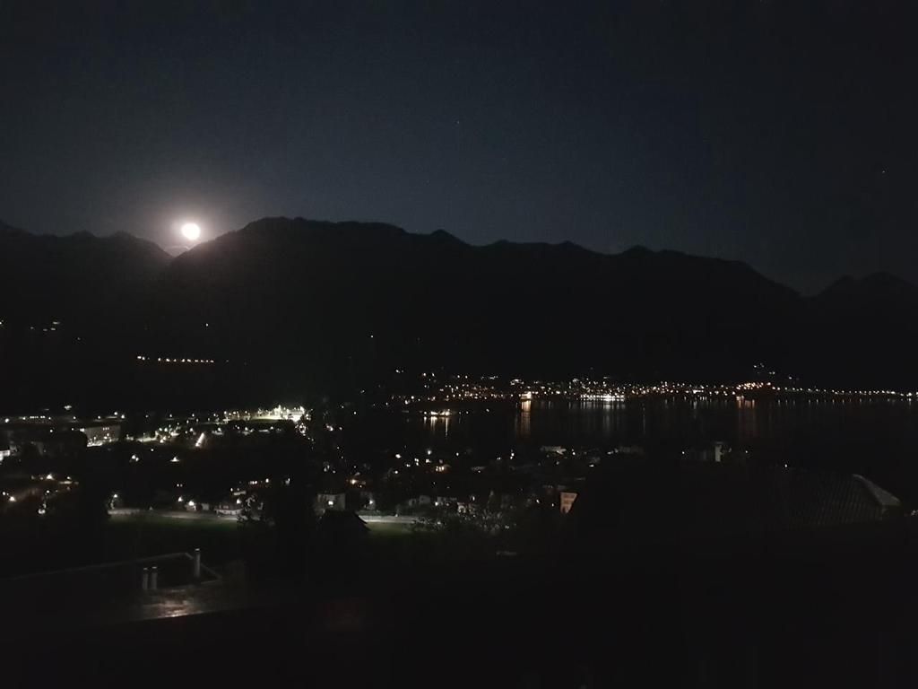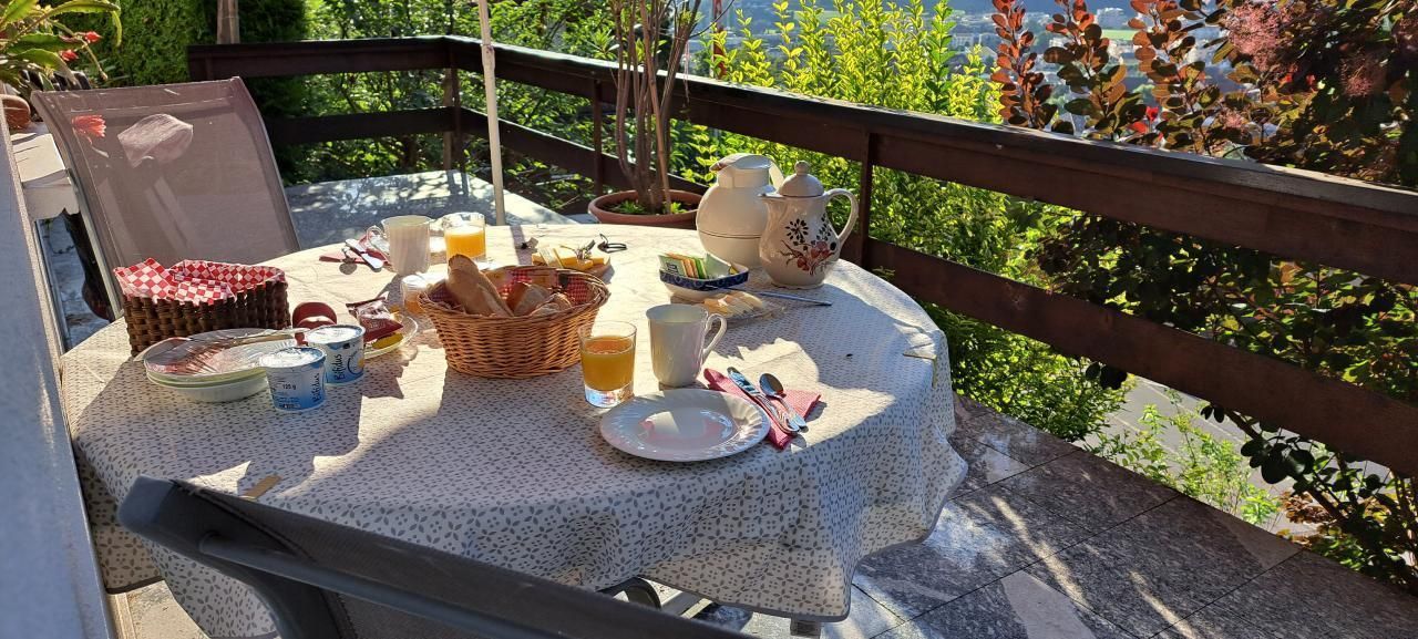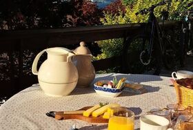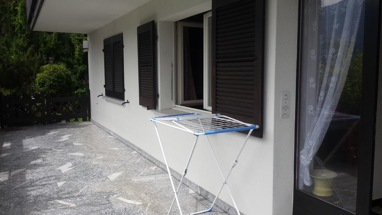 Der große Garten mit seinen schattenspendenden Bäumen und einem eingezäunten Teil, ideal für Hunde, lädt zum Verweilen und Entspannen ein. Die Wohnung bleibt auch ohne Klimaanlage dank der parkähnlichen Anlage im Hochsommer angenehm kühl. Auf der Terrasse mit Tisch, Stühlen und einem Sonnenschirm können Sie entspannte Stunden im Freien genießen. Die riesige Terrasse selbst bietet eine traumhafte Sicht auf die Bergwelt und den See, was besonders am Abend zum Verweilen einlädt.