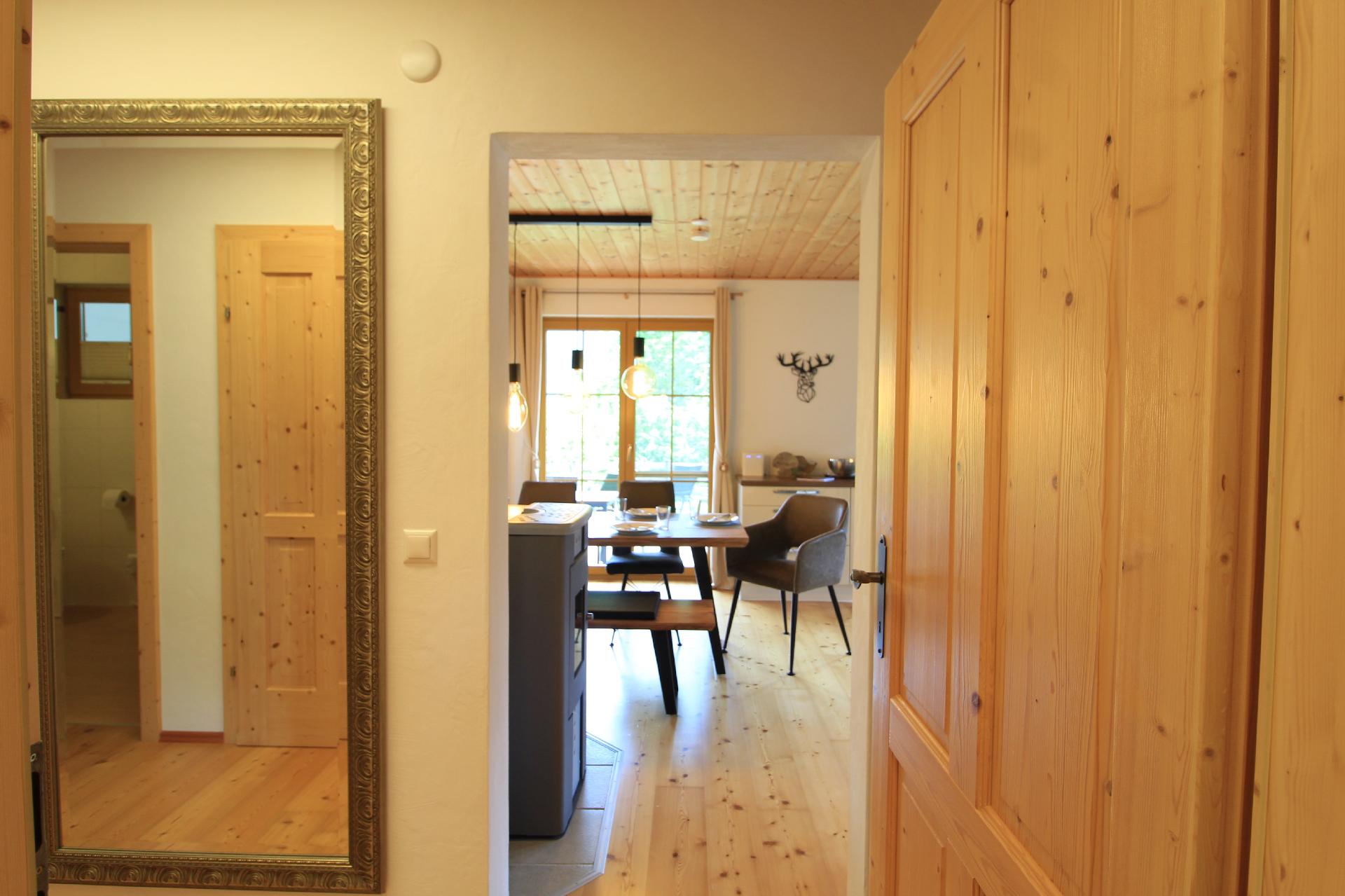 Der Innenbereich des Apartments überzeugt mit zwei gemütlichen Doppelzimmern, einem kompletten Badezimmer mit Dusche sowie einer zusätzlichen Toilette. Das große Wohnzimmer, ausgestattet mit einer Schlafcouch, bietet genügend Raum für Entspannung nach einem actionreichen Tag. Die voll ausgestattete Küche mit Backofen, Geschirrspüler und einem Pelletofen lädt zu gemeinsamen Kocherlebnissen ein.