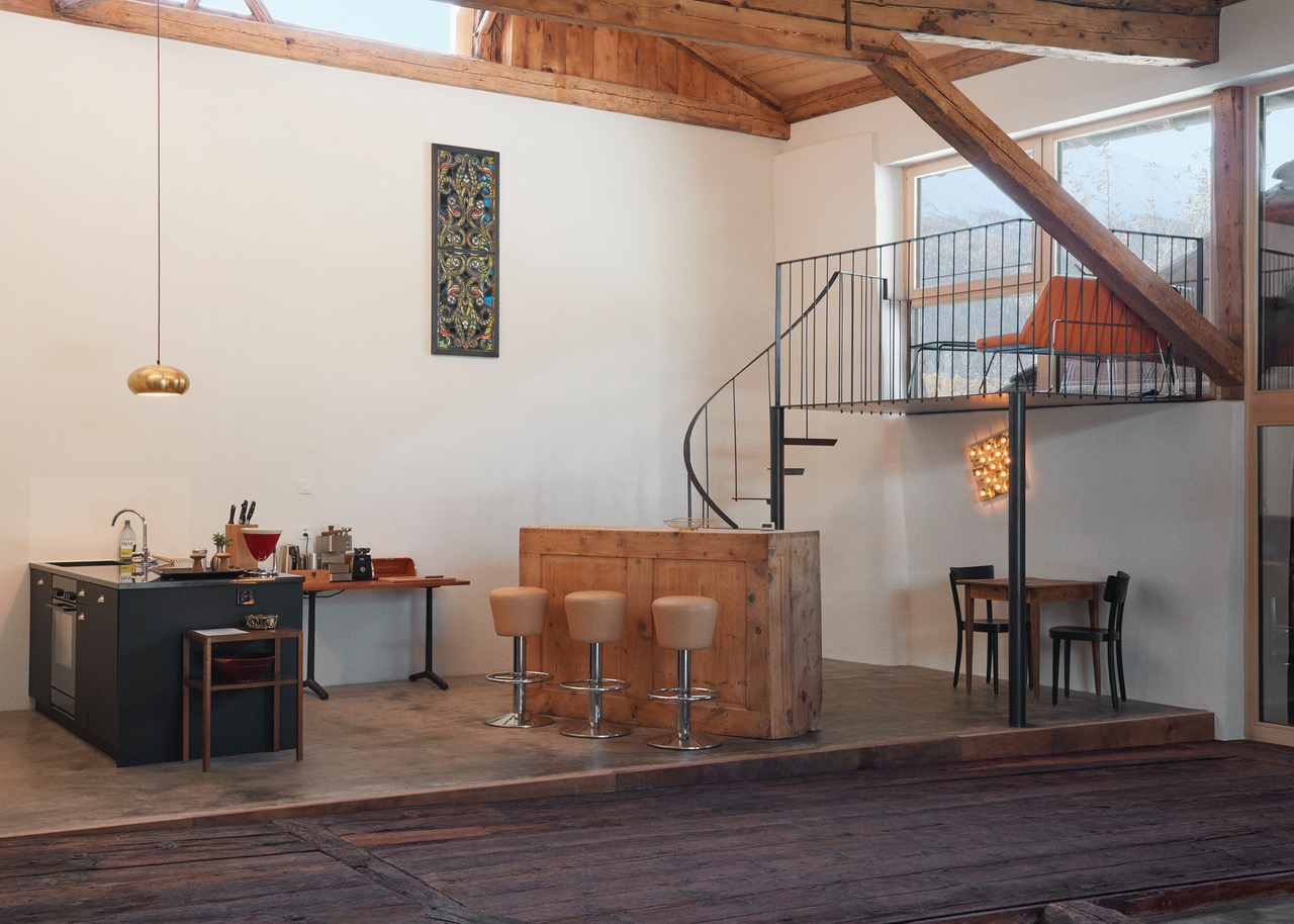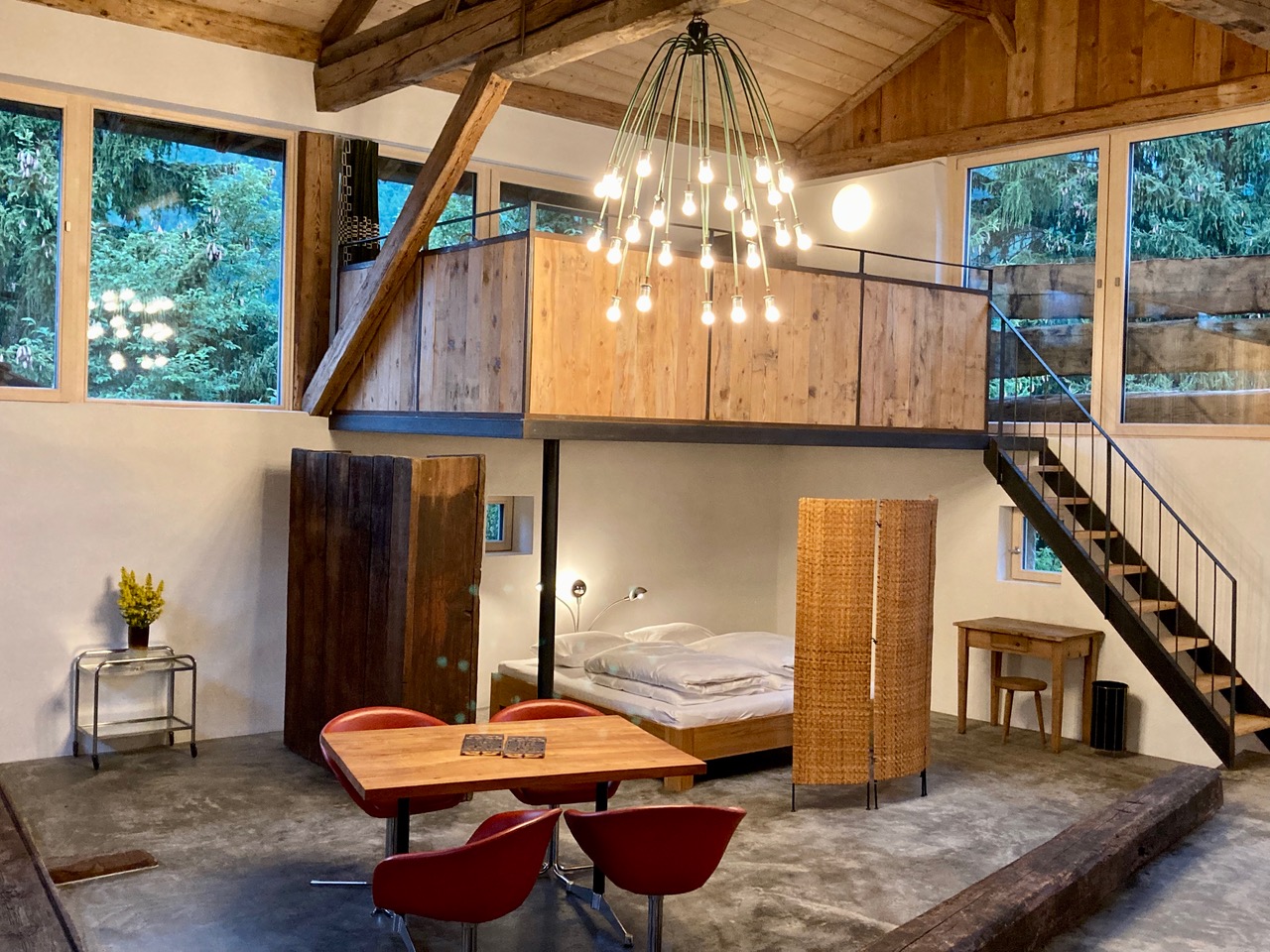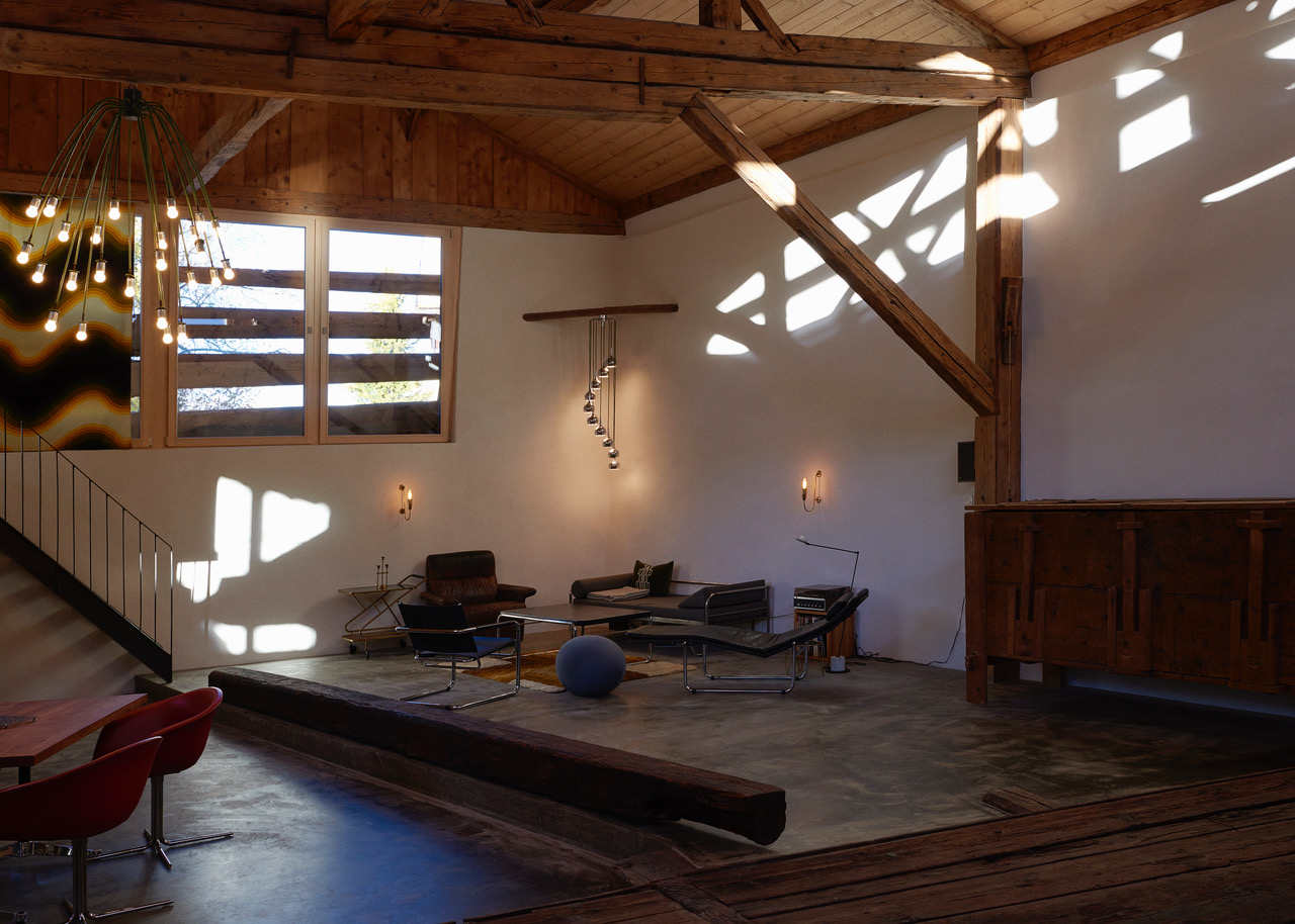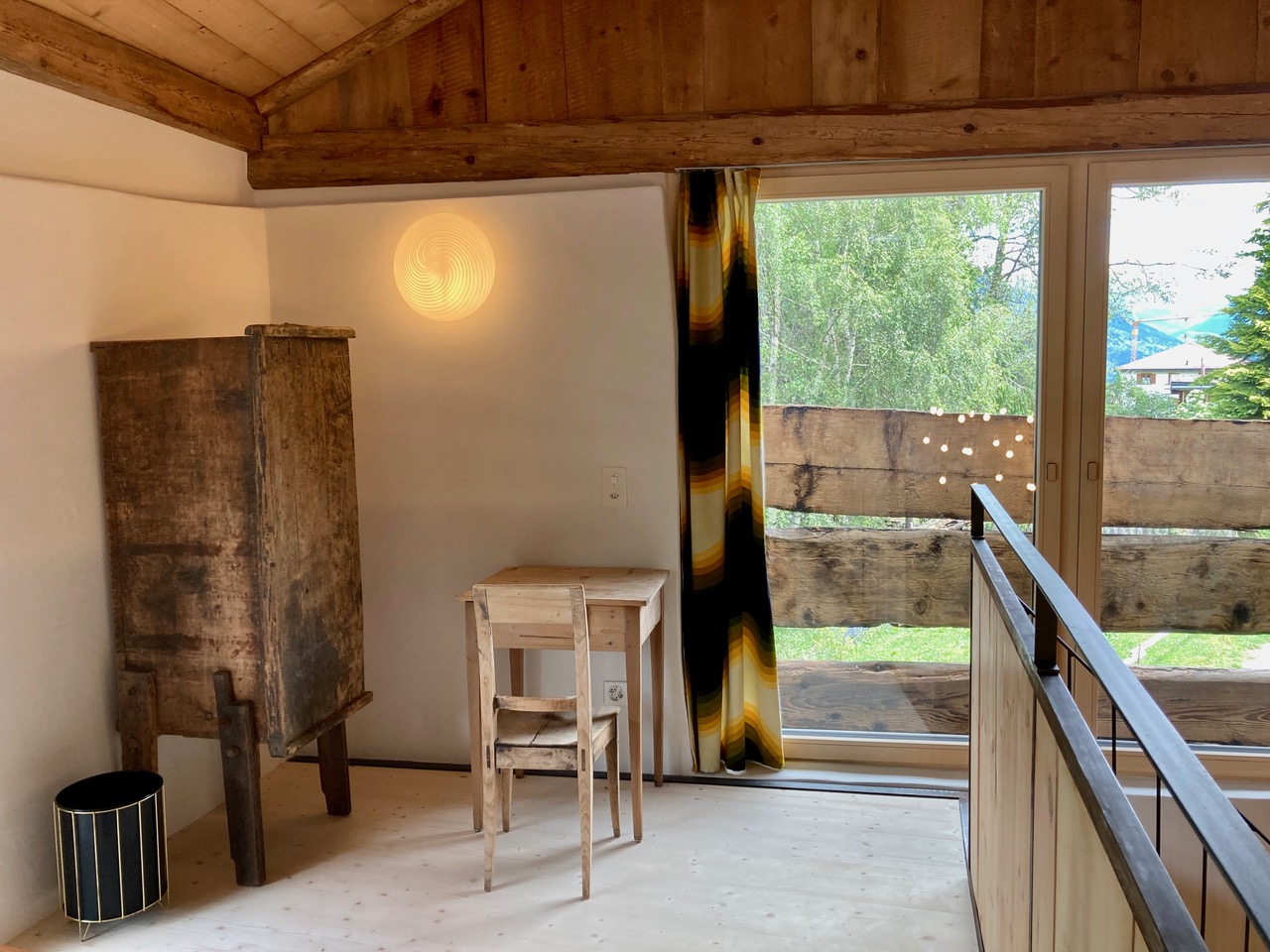 Die loftartige Stalla d´Immez besteht aus einem ungeteilten Raum von 120m2 Fläche mit unverstellter Aussicht auf die Bergwelt der Val Müstair. Einzig das Bad ist abgegrenzt, und ein unbeheizter Anbau dient als Wintergarten und Ofenzimmer. Das Mobiliar folgt dem Geschmack des Gastgeberpaars und ist von ausgesuchter Qualität, teils der Gründerzeit des Stalls verpflichtet (17./18. Jahrhundert), teils den Design-Epochen zwischen Bauhaus und Jahrtausendwende. Der Unterhaltung dient eine kleine, ausgesuchte Bibliothek, eine antike Spielesammlung und eine persönlich gefärbte Vinyl-Schallplattensammlung.
