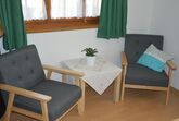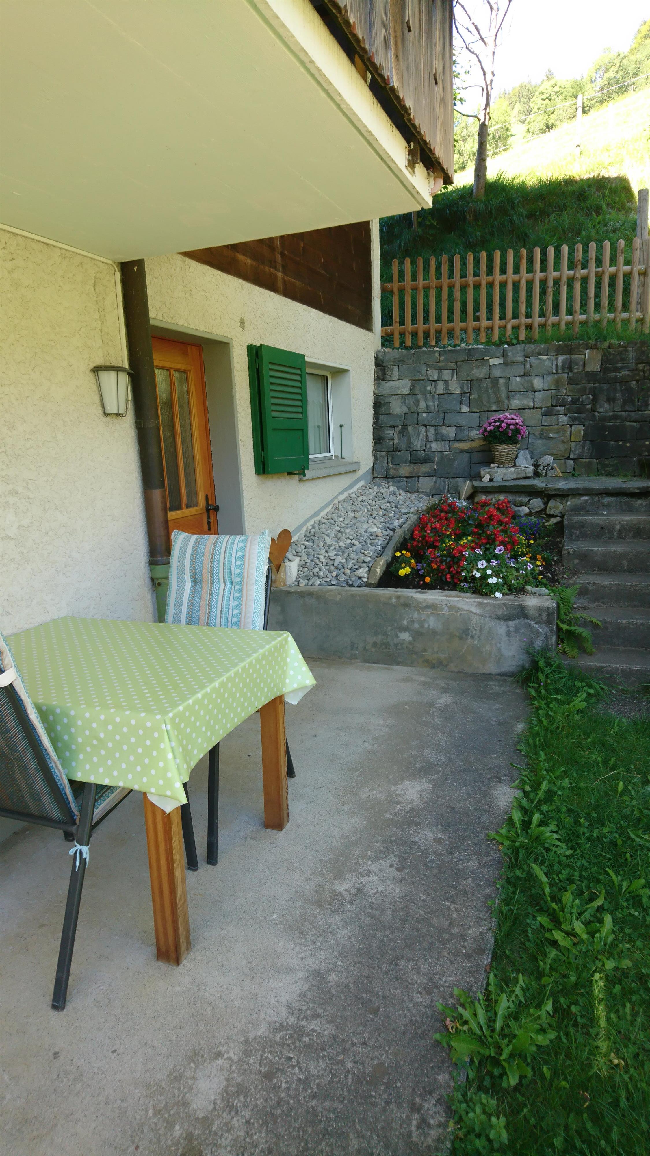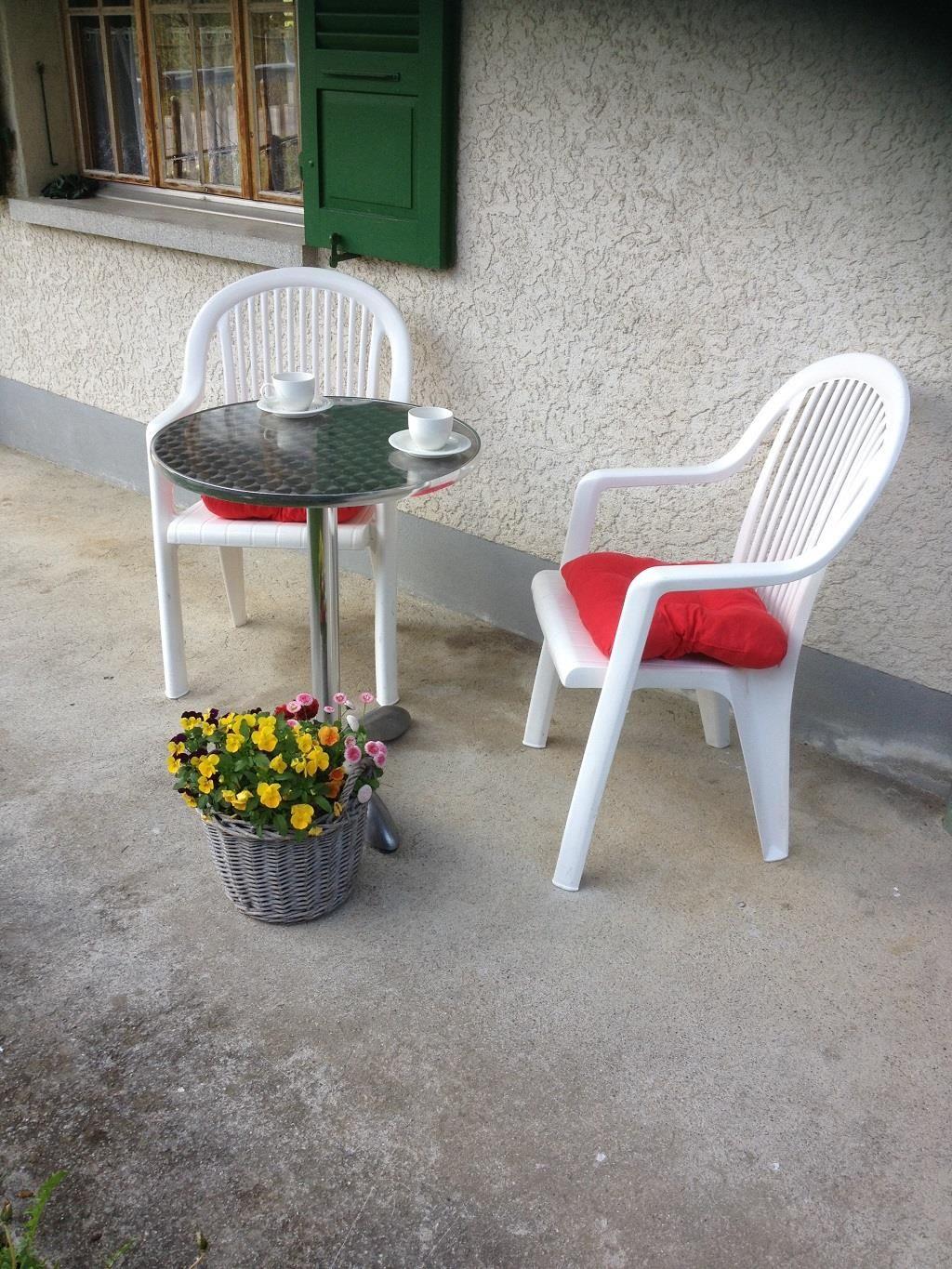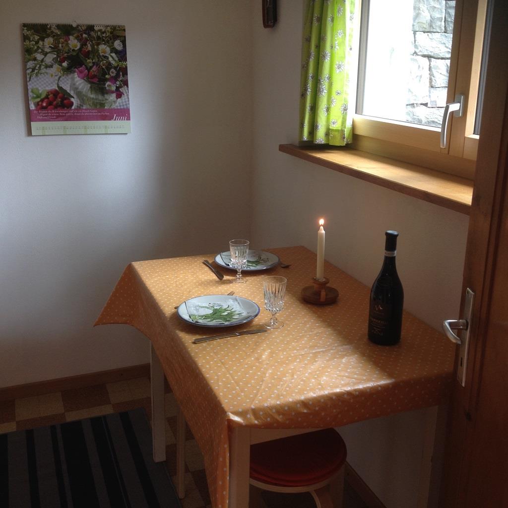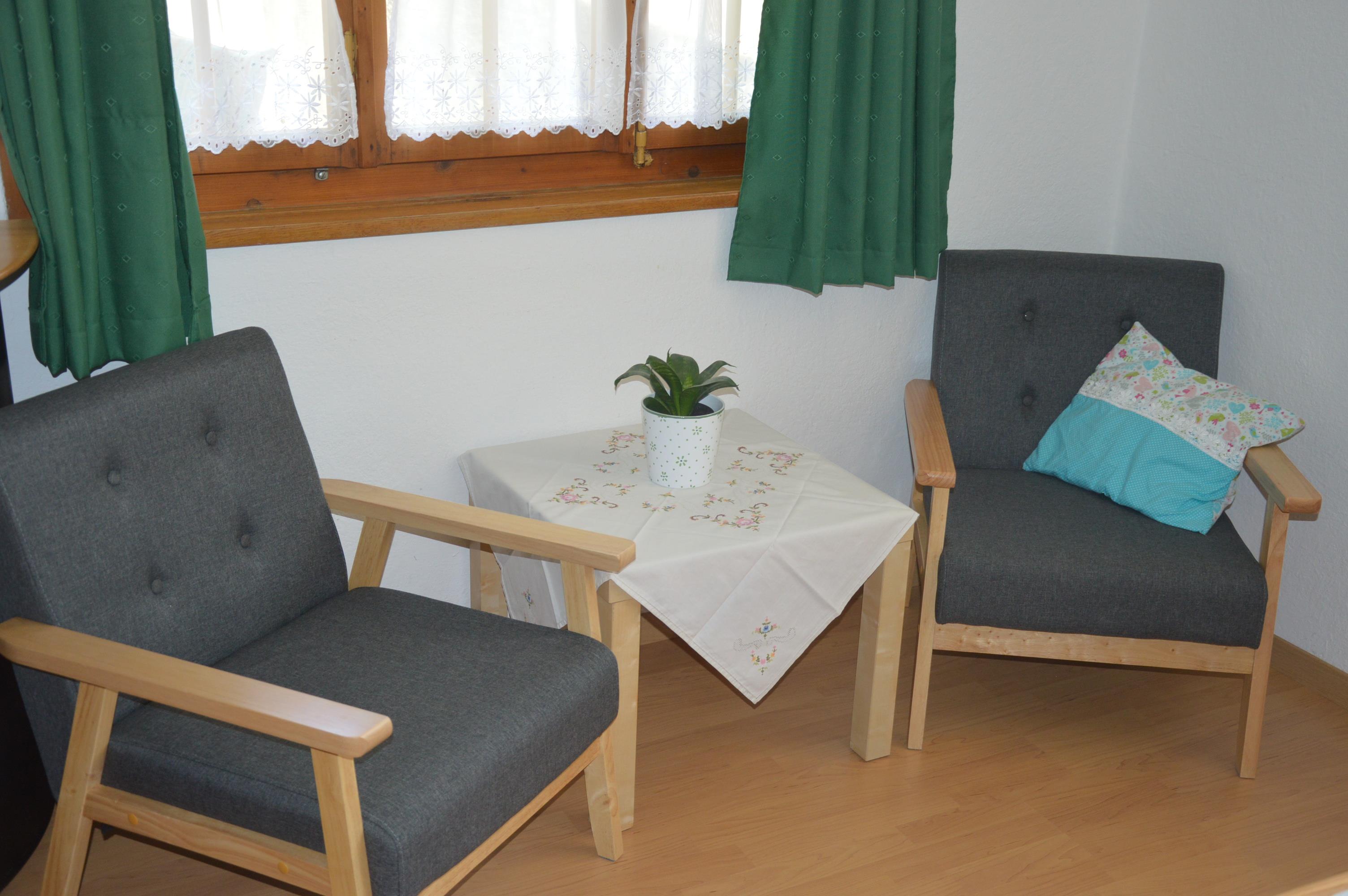 Kleine, heimelige und einfache 1-Zimmerwohnung (Parterre) in unserem Haus, mit separatem Eingang. Wohn-/Schlafzimmer mit Sitzecke, Doppelbett, CD, Radio und Internetanschluss. Küche mit Kühlschrank, Backofen, Kaffeemaschine (Delizio, Kapseln in Migros erhältlich), Fondueset und Racletteofen. Badezimmer mit Dusche/WC.