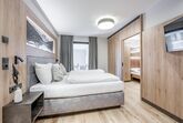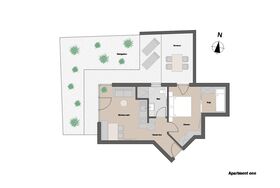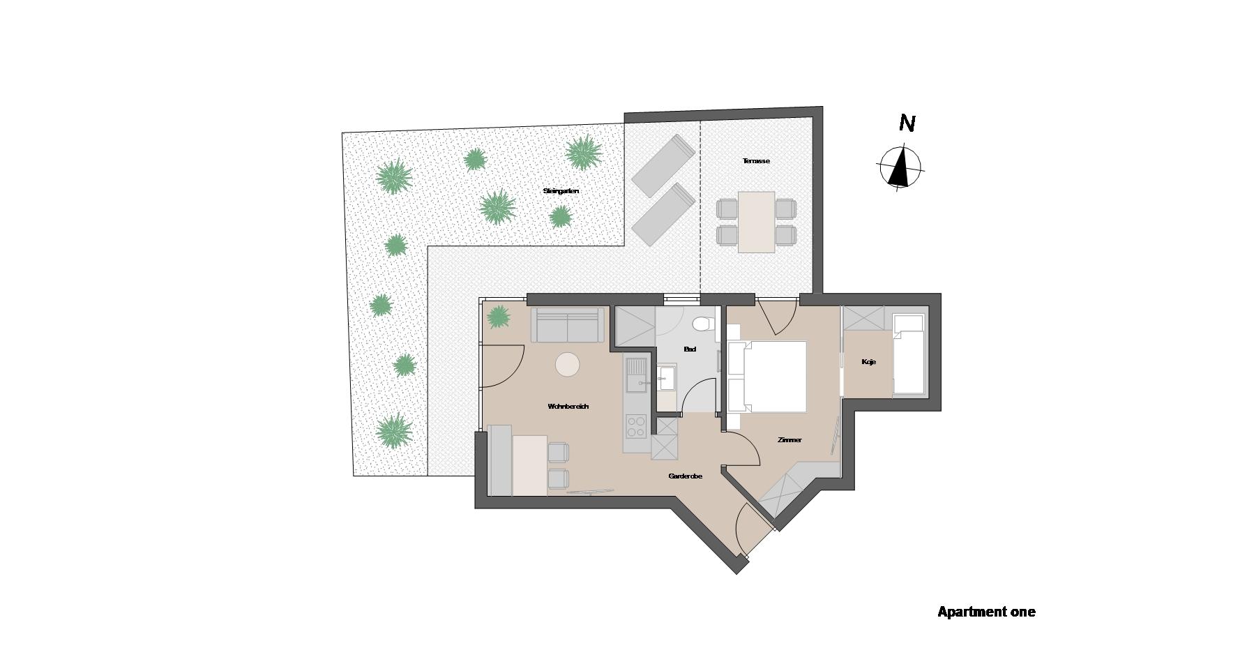 Apartment N° ONE mit ca. 47 m² befindet sich im Erdgeschoß und besteht aus: 1 Doppelzimmer mit Boxspringbett und integriertem, durch Schiebetür abgetrenntem Schlafraum (Koje) für zwei Kinder (Stockbett); 1 modernes Badezimmer mit Dusche /WC; großzügiger, offener Wohn-Ess-Kochbereich mit vollausgestatteter Küche (Cerankochfeld, Backrohr, Kühlschrank mit Tiefkühlfach, Geschirrspüler, Kaffeemaschine, Wasserkocher, Toaster uvm.); Ausziehcouch; TV´s in allen Schlaf- und Wohnbereichen; genießen Sie auf der ca. 30 m² großen, nach Westen ausgerichteten Terrasse spektaktuläre Sonnenuntergänge.