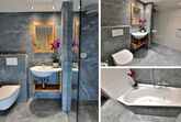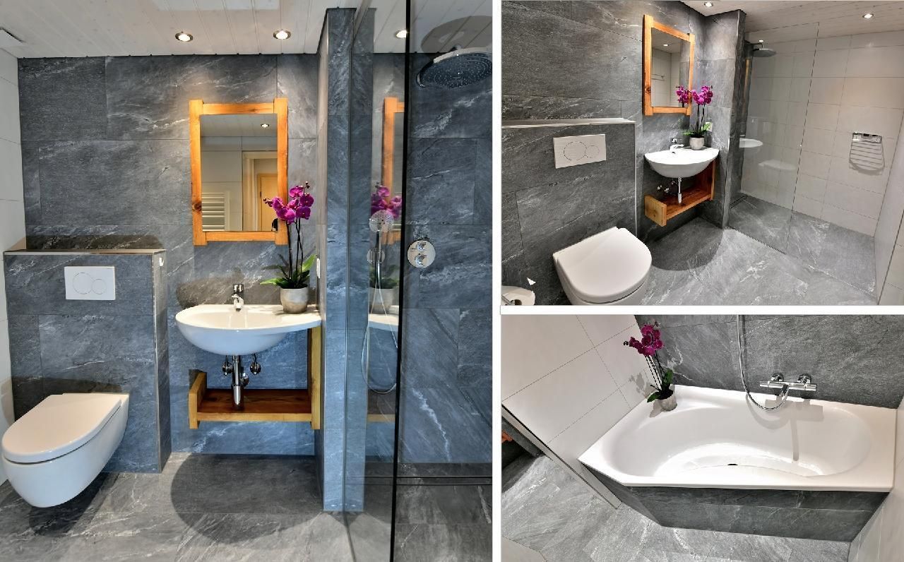 Das große Badezimmer hat eine Toilette, eine Dusche und eine Badewanne.