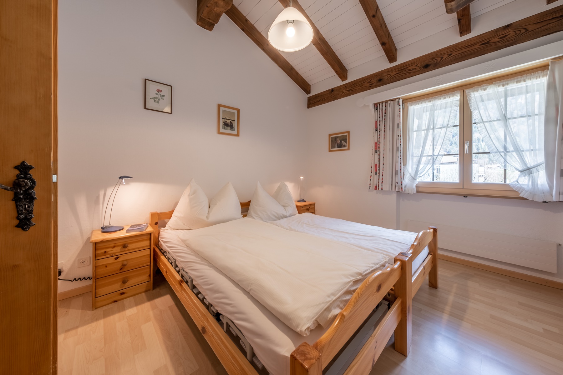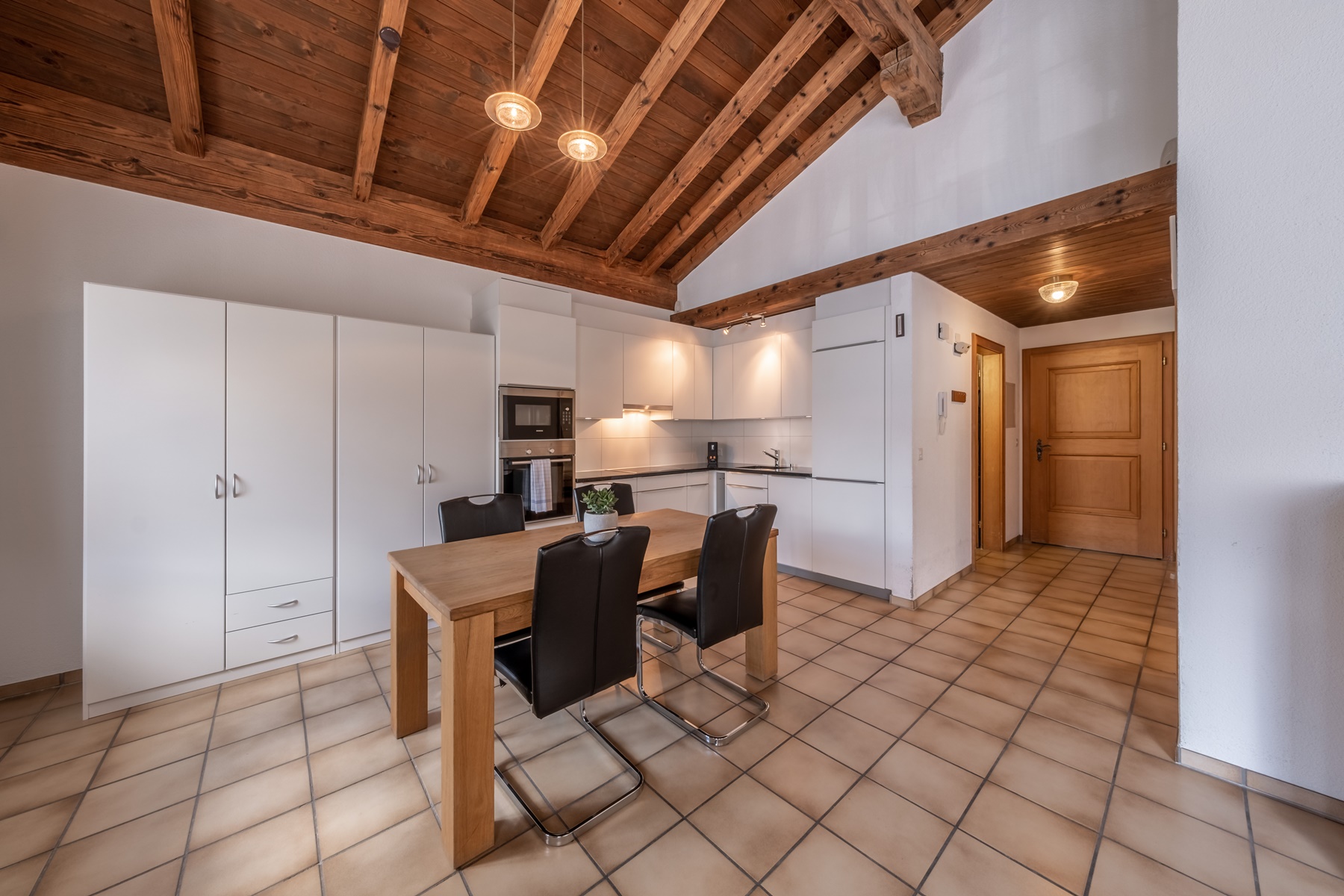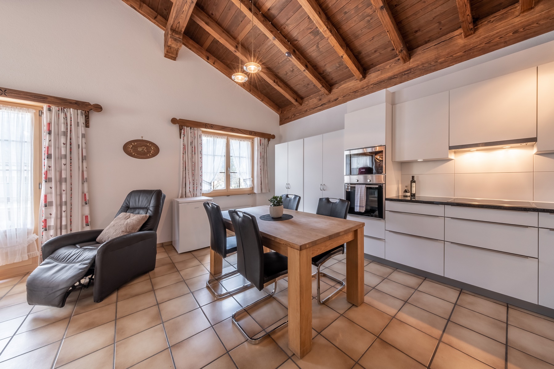 Masterschlafzimmer mit Komfort-Einzelbetten (90x200cm) elektrisch verstellbar, bei Bedarf kann ein Pflegebett untergebracht werden Badezimmer mit Dusche und WC Wohnzimmer mit Sofa und Relaxsessel, Schrankbett, Essbereich für vier Personen Offene Wohnküche mit Kochfeld, Backofen, Mikrowelle, Kühlschrank, Tiefkühler, Geschirrspüler und Nespressomaschine Inneneinrichtung & Technik