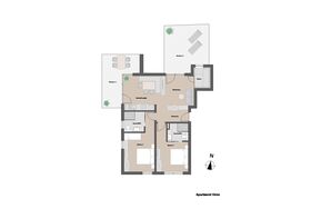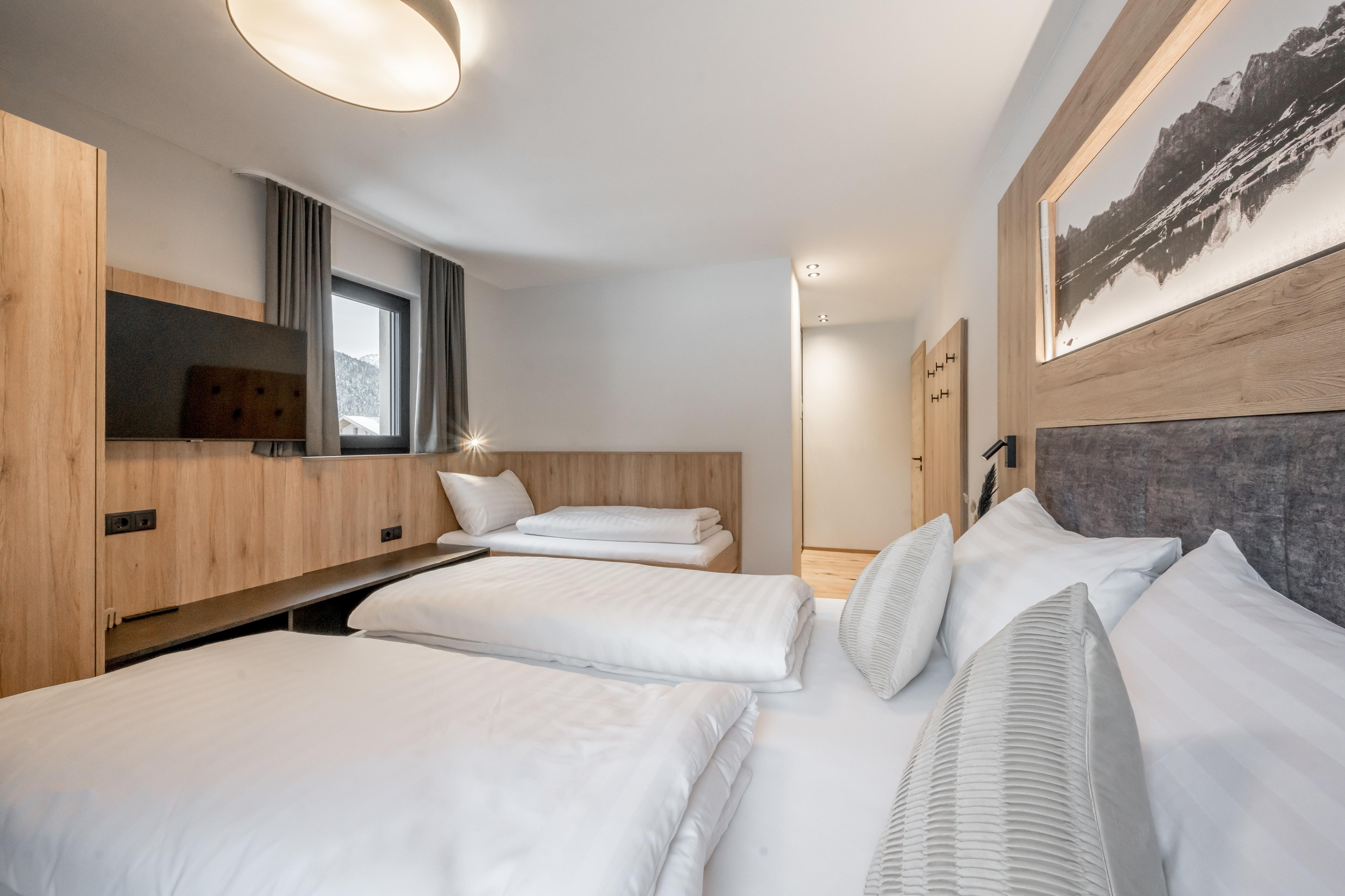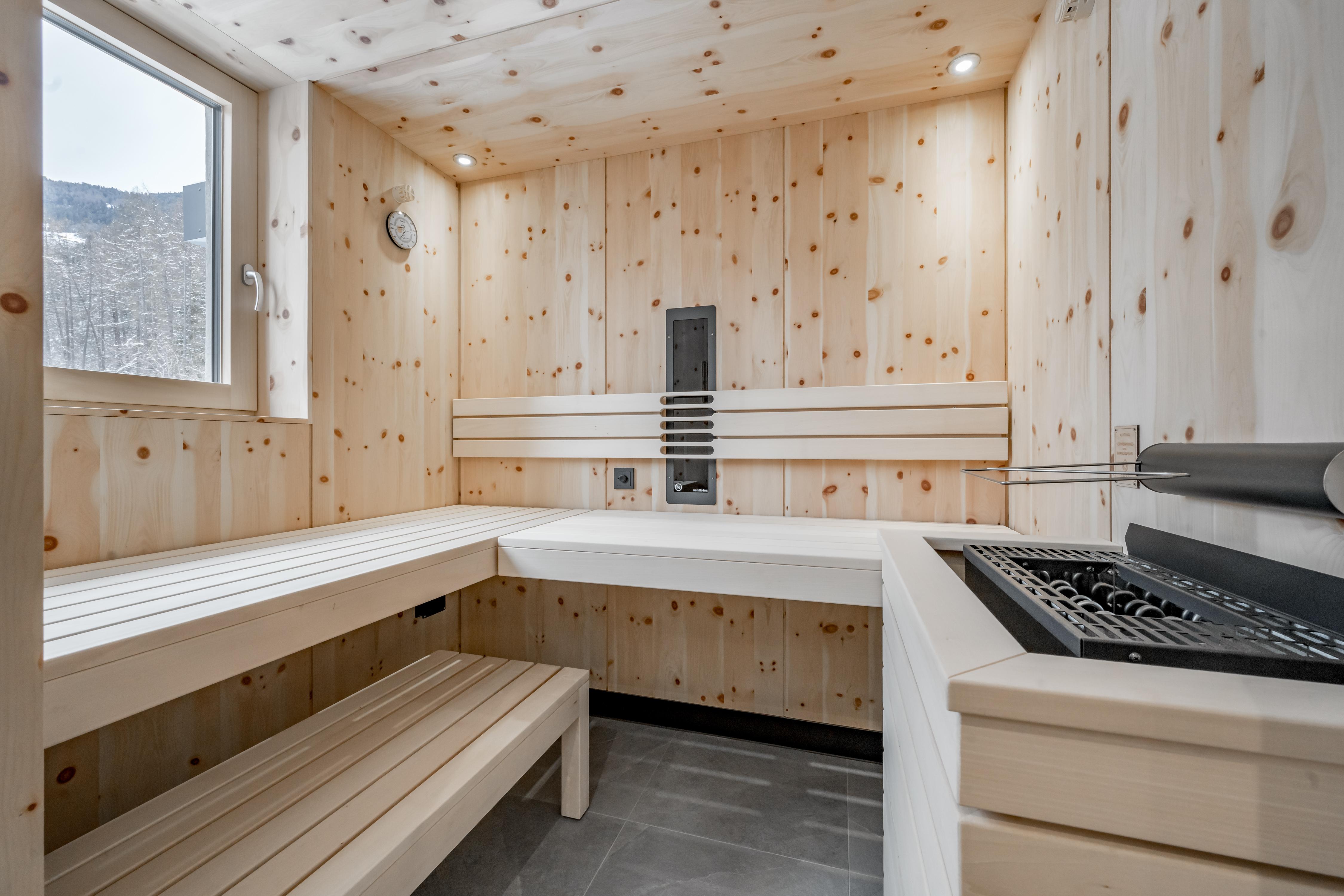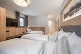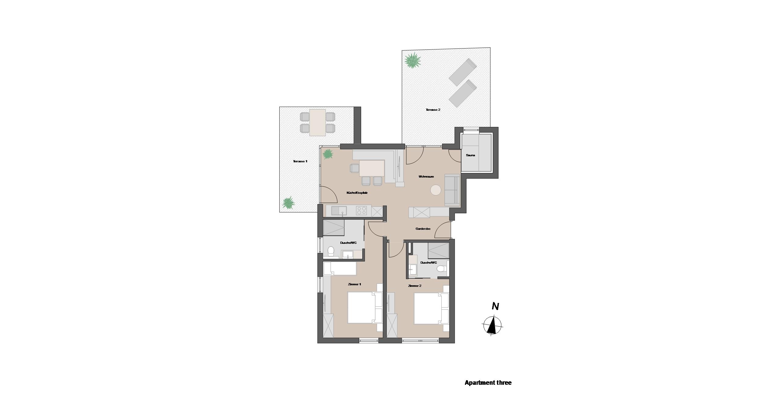Apartment N° THREE mit ca. 78 m² besteht aus: 1 Doppelzimmer mit Boxspringbett und 1 Badezimmer mit Dusche/WC; 1 Dreibettzimmer (1 x Doppelbett + 1 x Einzelbett) und 1 Badezimmer mit Dusche/WC; 1 offenen Wohn-Ess-Kochbereich mit vollausgestatteter Küche (Cerankochfeld, Backrohr, Kühlschrank mit Tiefkühlfach, Geschirrspüler, Kaffeemaschine, Wasserkocher, Toaster uvm.) inkl. ausziehbarer Couch (Schalfmöglichkeit für 2 weitere Personen); TV´s in allen Schlaf- und Wohnbereichen; vom Wohnbereich aus zugängliche Zirbenholz-Sauna mit integriertem Infrarotstrahler; die Wohnung ist auch mit dem Personenaufzug erreichbar; dieses Apartment verfügt über 2 Terrassen, eine ist nach Südwesten ausgerichtet, überdacht und voll möbliert, die Zweite ist nach Nordwesten ausgerichtet und ideal zum Abkühlen nach einem heißen Saunagang.