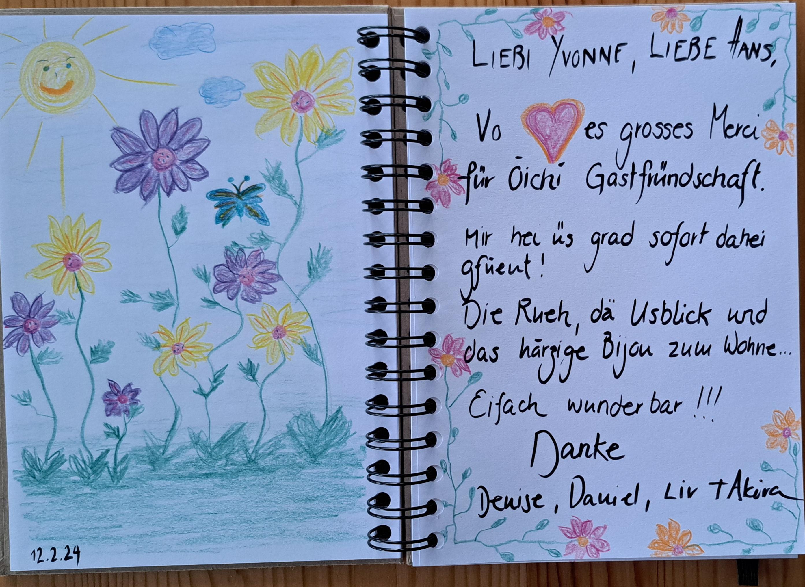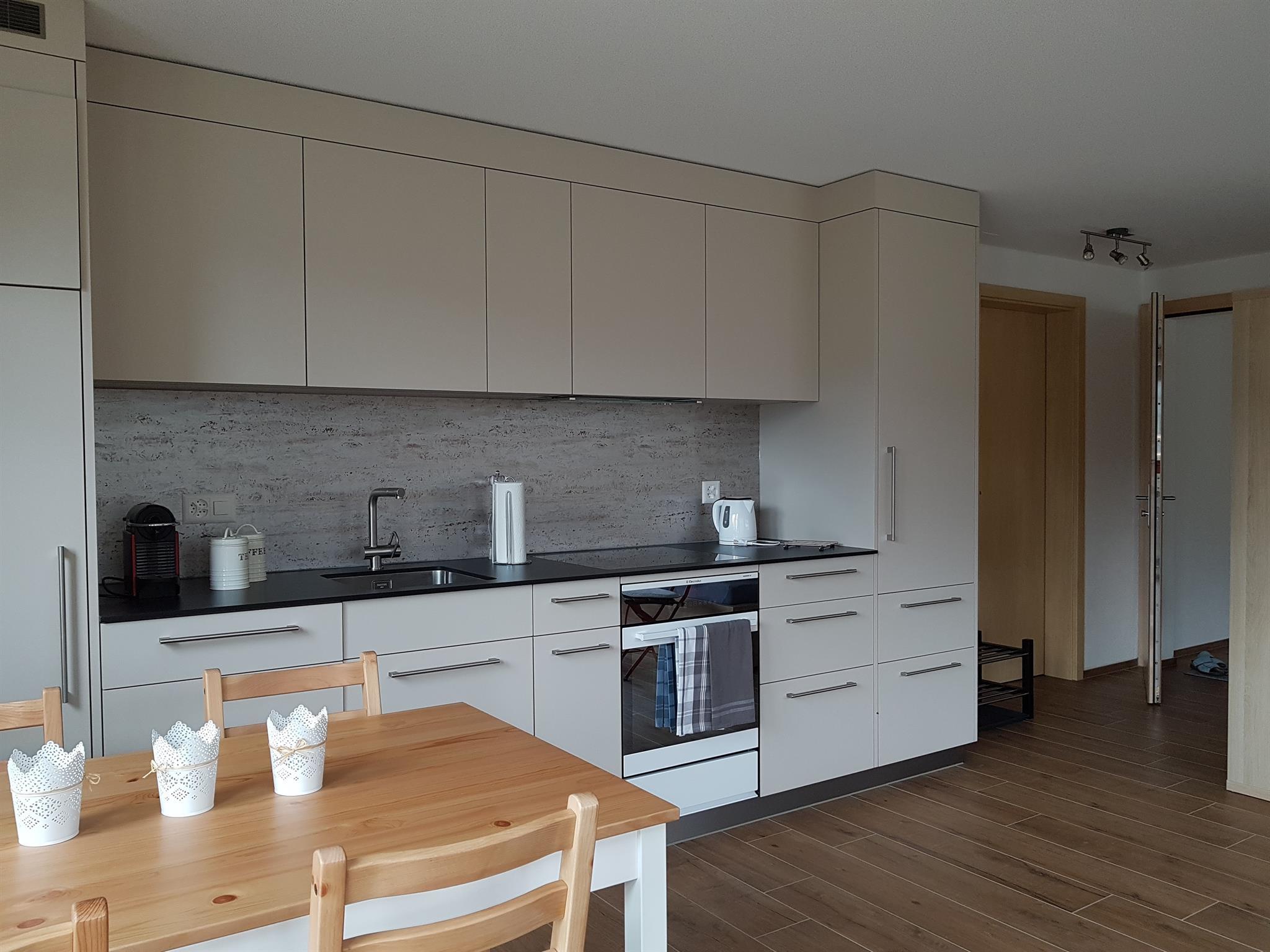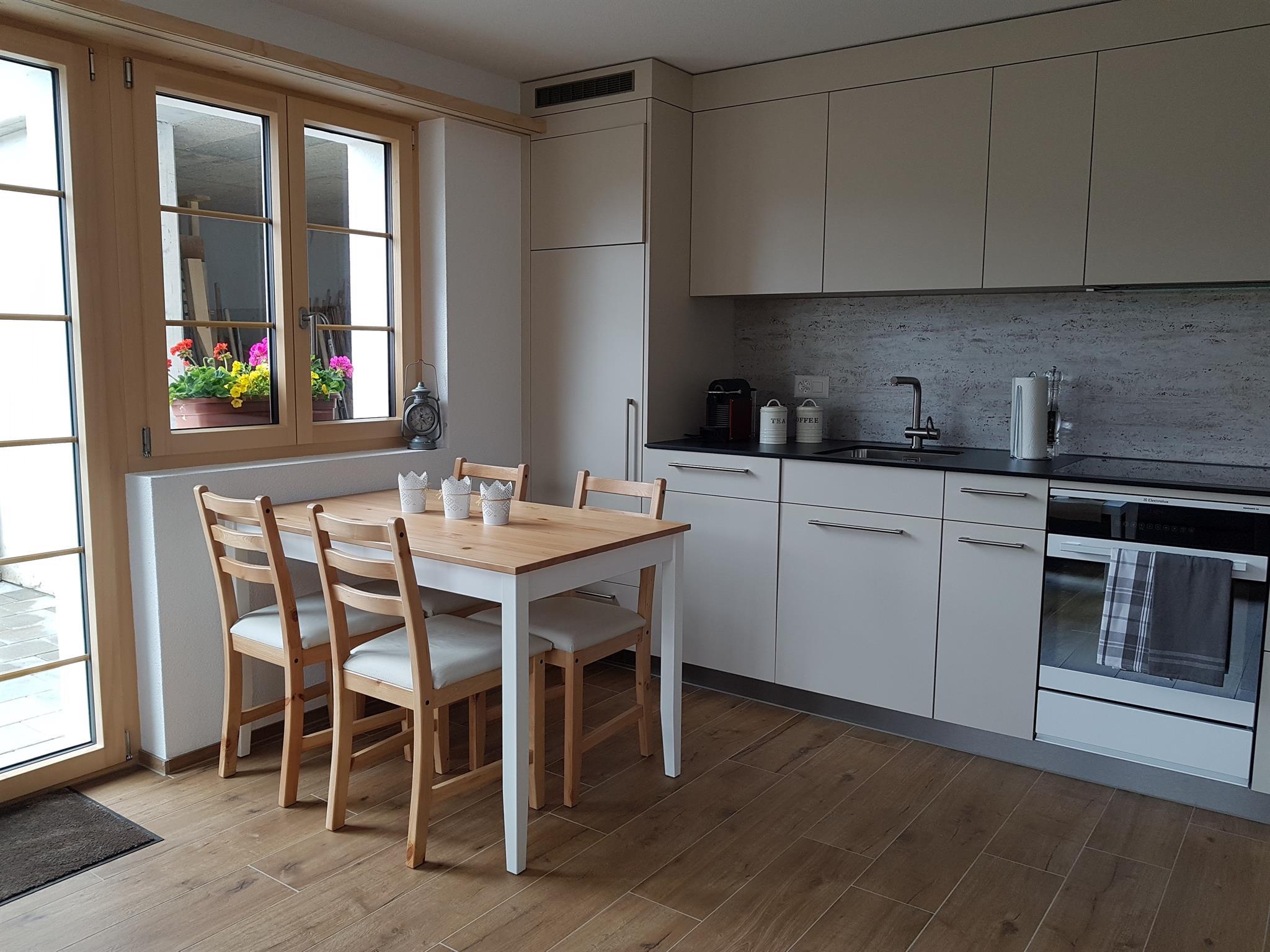 Unsere neue, grosse und moderne 1-Zimmer Ferienwohnung gefällt jedem, der sie entdeckt hat. Nebst der zweckmässig und voll ausgestatteten Küche mit Geschirrspüler, Backofen, Kühlschrank und vielem mehr, finden Sie ein frisch bezogenes Doppelbett mit zwei Decken, Kisen usw. sowie eine gemütliche Sitzecke, die zum Relaxen und Lesen einlädt. Nicht vergessen sei die grosszügige Nasszelle mit begehbarer Dusche, WC, Spiegelschrank und modernem Waschtisch. Die ganze Ferienwohnung verfügt über Fussbodenheizung. Die Bodenplättli haben eine Holzstrucktur, was dem ganzen Raum ein gemütliches Embiente verleiht.