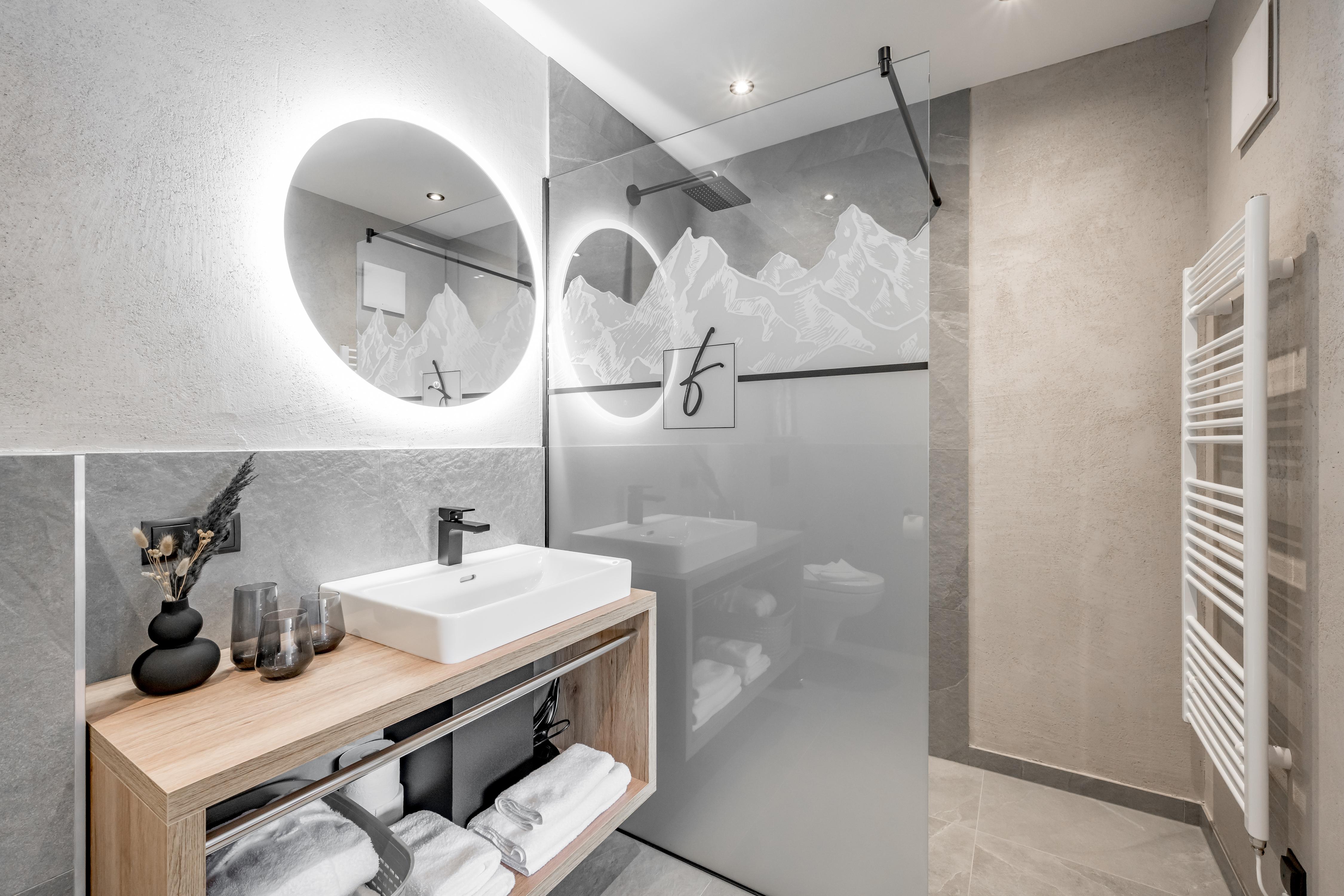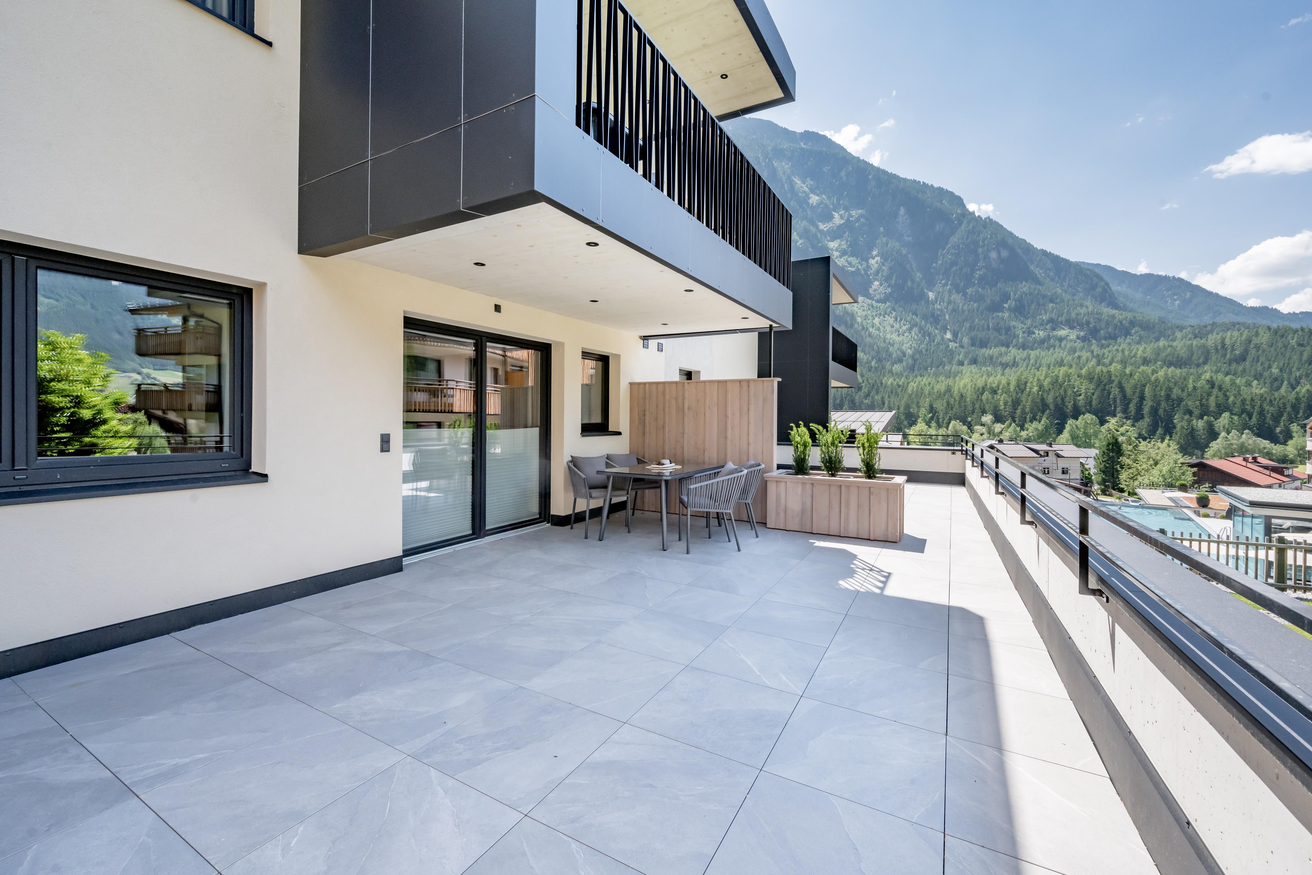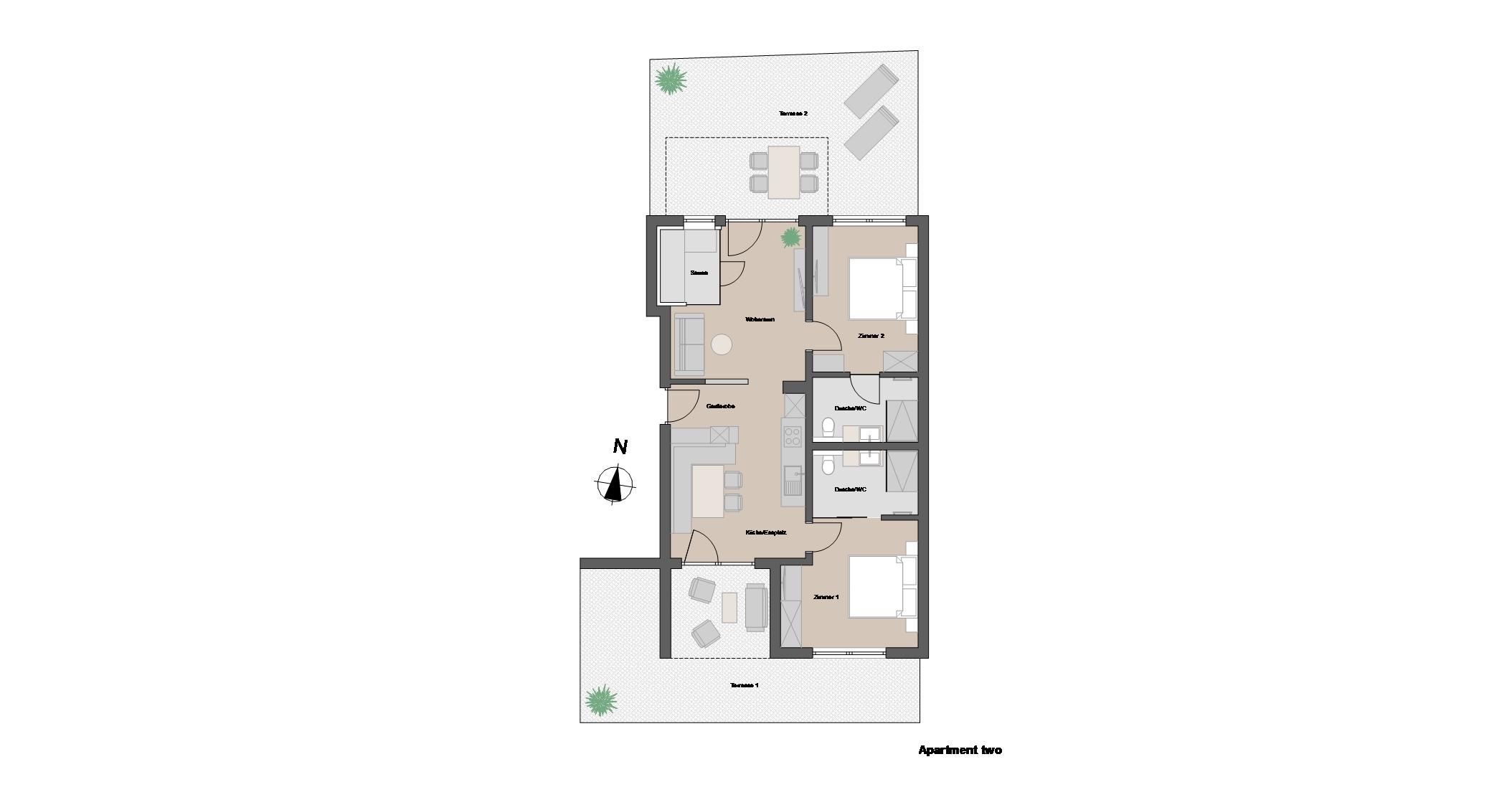 Apartment N° TWO mit ca. 75 m² besteht aus: 2 Doppelzimmer mit Boxspringbett, Sat-TV und je 1 Badezimmer mit Dusche /WC; 1 offenen Wohn-Ess-Kochbereich mit vollausgestatteter Küche (Cerankochfeld, Backrohr, Kühlschrank mit Tiefkühlfach, Geschirrspüler, Kaffeemaschine, Wasserkocher, Toaster uvm.) inkl. ausziehbarer Couch (Schlafmöglichkeit für 2 weitere Personen); TV´s in allen Schlaf- und Wohnbereichen; vom Wohnbereich aus zugängliche Zirbenholz-Sauna mit integriertem Infrarotstrahler; die Wohnung ist auch mit dem Personenaufzug erreichbar; dieses Apartment verfügt über 2 weitläufige Terrassen, eine nach Südosten und eine nach Nordwesten für laue Sommerabende. Beide Terrassen sind voll möbliert und zum Teil überdacht.