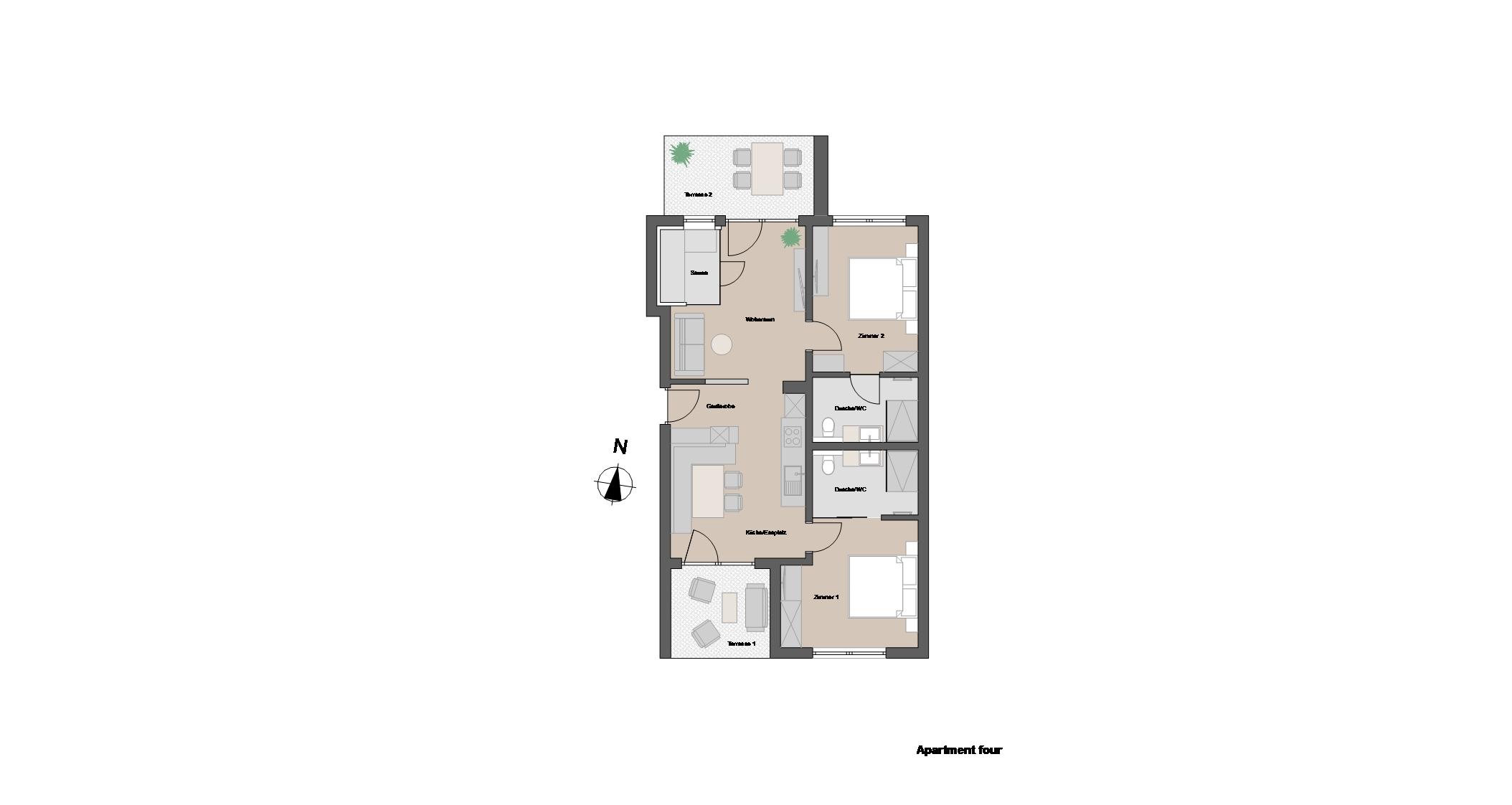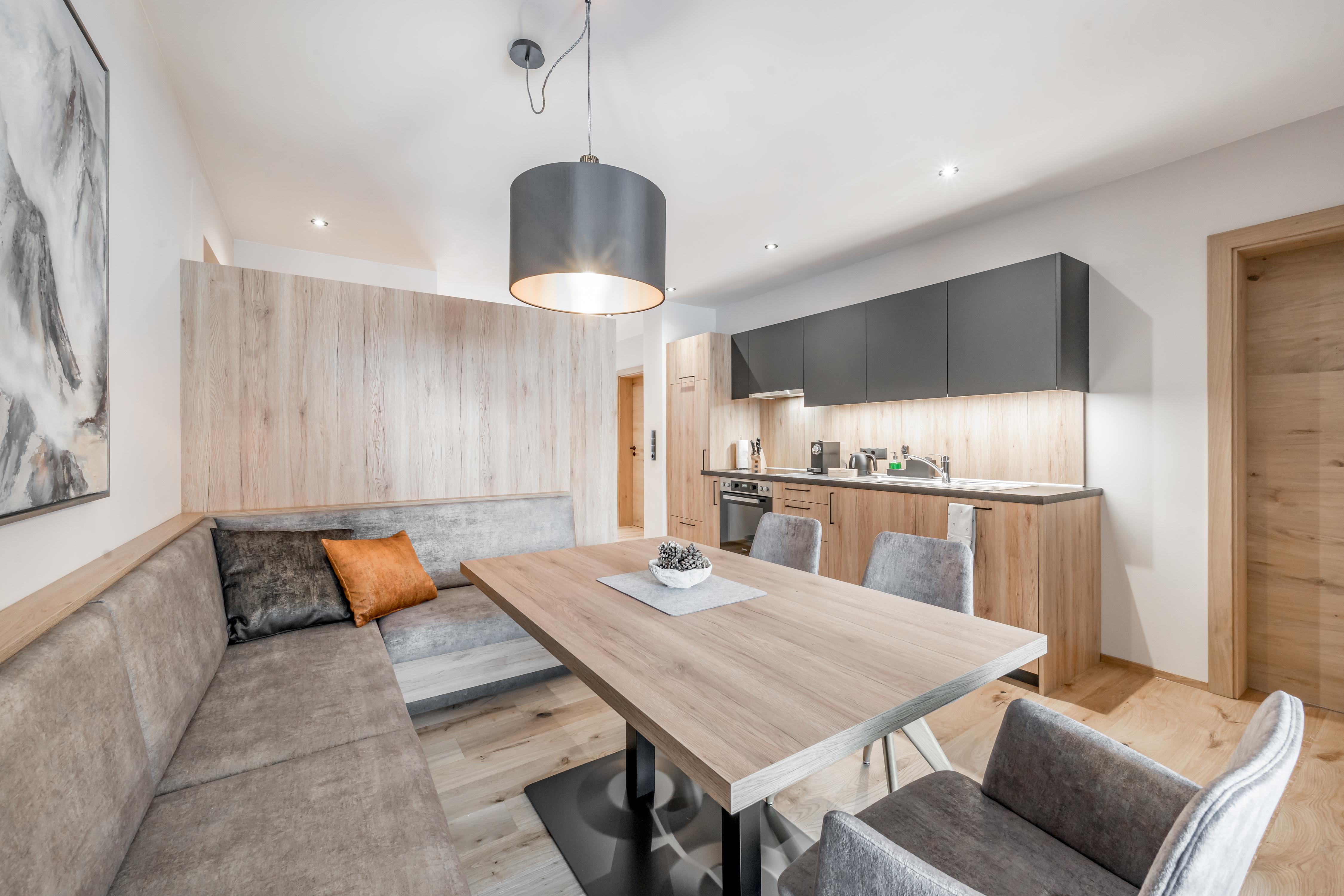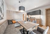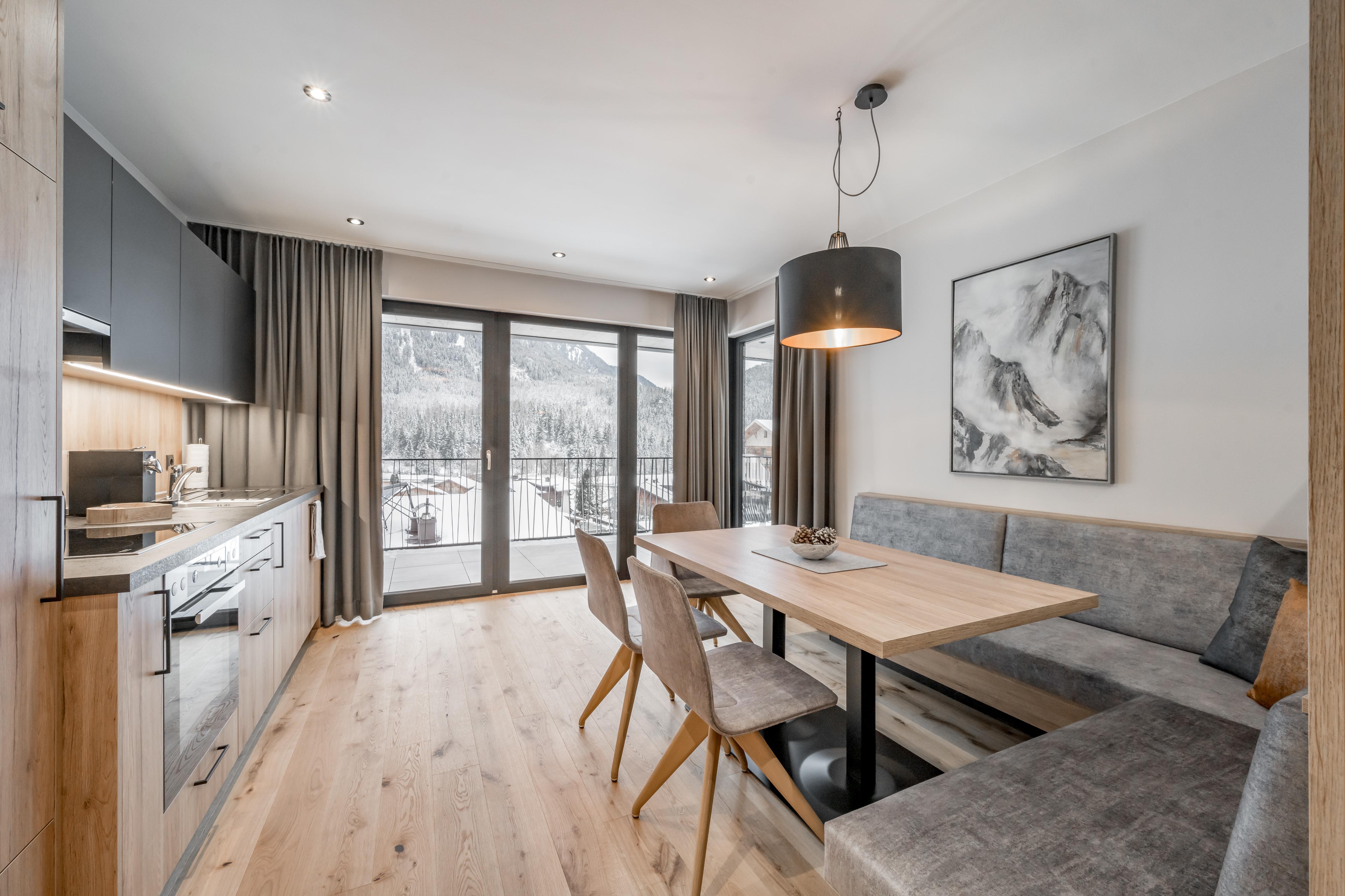 Apartment N° FOUR mit ca. 75 m² besteht aus: 2 Doppelzimmer mit Boxspringbett und je 1 Badezimmer mit Dusche /WC; 1 offenen Wohn-Ess-Kochbereich mit vollausgestatteter Küche (Cerankochfeld, Backrohr, Kühlschrank mit Tiefkühlfach, Geschirrspüler, Kaffeemaschine, Wasserkocher, Toaster uvm.) inkl. ausziehbarer Couch (Schlafmöglichkeit für 2 weitere Personen); TV´s in allen Schlaf- und Wohnbereichen; vom Wohnbereich aus zugängliche Zirbenholz-Sauna mit integriertem Infrarotstrahler; die Wohnung ist auch mit dem Personenaufzug erreichbar; dieses Apartment verfügt über 2 überdachte und voll möblierte Terrassen - einmal zur sonnigen Südostseite und einmal nach Nordwesten ausgerichtet.