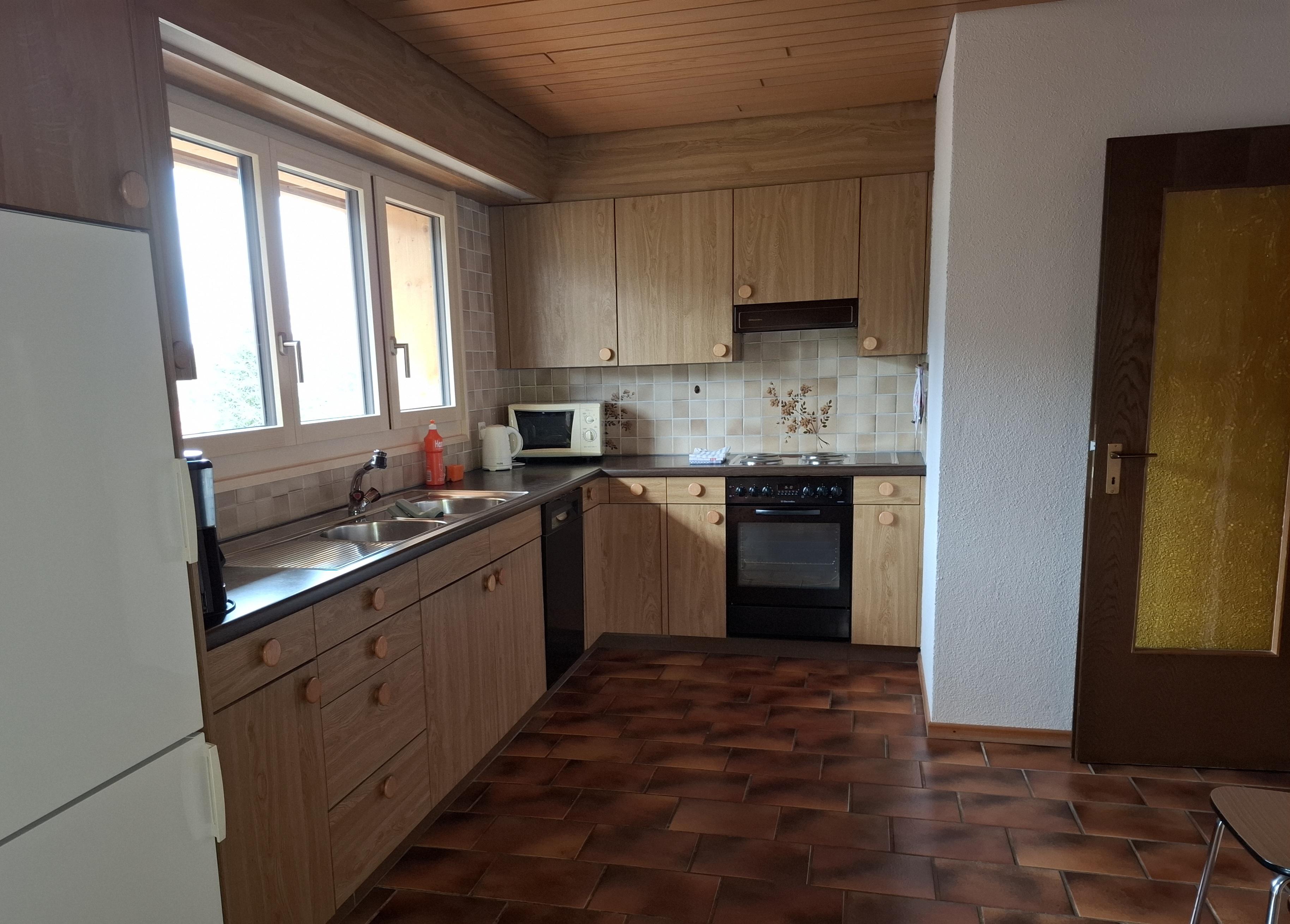 Komfortable 5 1/2-Zimmerwohnung im 1. Stock (Hanglage). Grosszügiges Wohnzimmer. Elternschlafzimmer mit direktem Zugang zum Bad. Die übrigen Schalfzimmer mit Lavabo. Kinderbett kann zur Verfügung gestellt werden. Balkon, Sitzplatz beim Haus. Sitzplatz beim Wald. Autoabstellplatz. Ruhige Lage, ausserhalb des Dorfes. Für gehbehinderte Personen steht ein Treppenlift zur Verfügung.