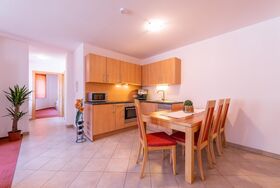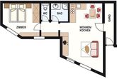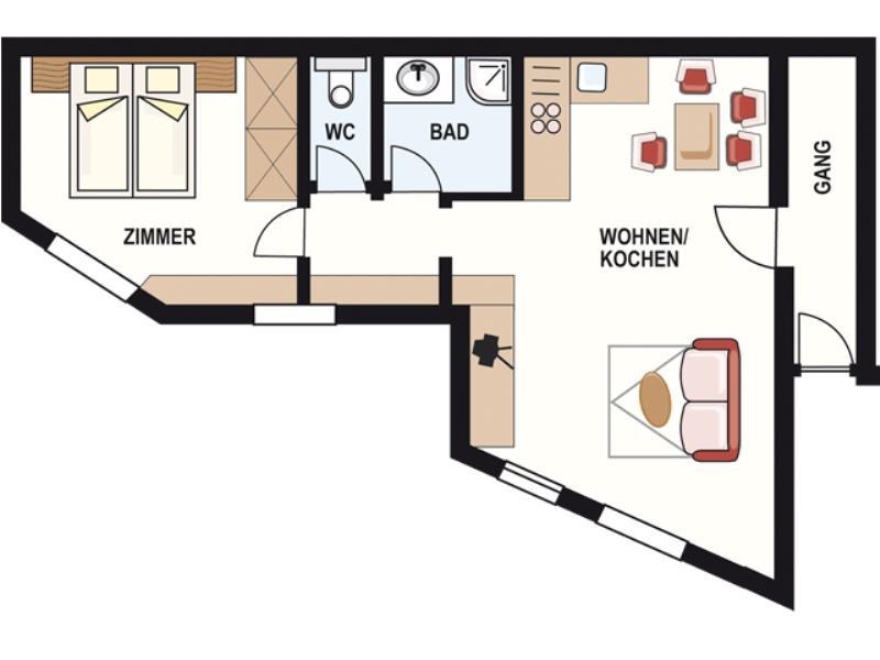 Die Wohnung besteht aus Vorraum, 1 helles, sonniges Doppelzimmer, 1 Badezimmer mit Dusche, 1 separates WC und 1 großzügige Wohnküche (mit Cerankochfeld, Backrohr, Mikrowelle, Wasserkocher, Kapsel-Kaffeemaschine - mit inkludiertem Starterset an Kapseln, Toaster, Kühlschrank mit Gefrierfach uvm.) Sitzecke mit Flat-TV und Wohnbereich. Die Couch im Wohnbereich wird als Schlafsofa für 3./4. Person genützt.
