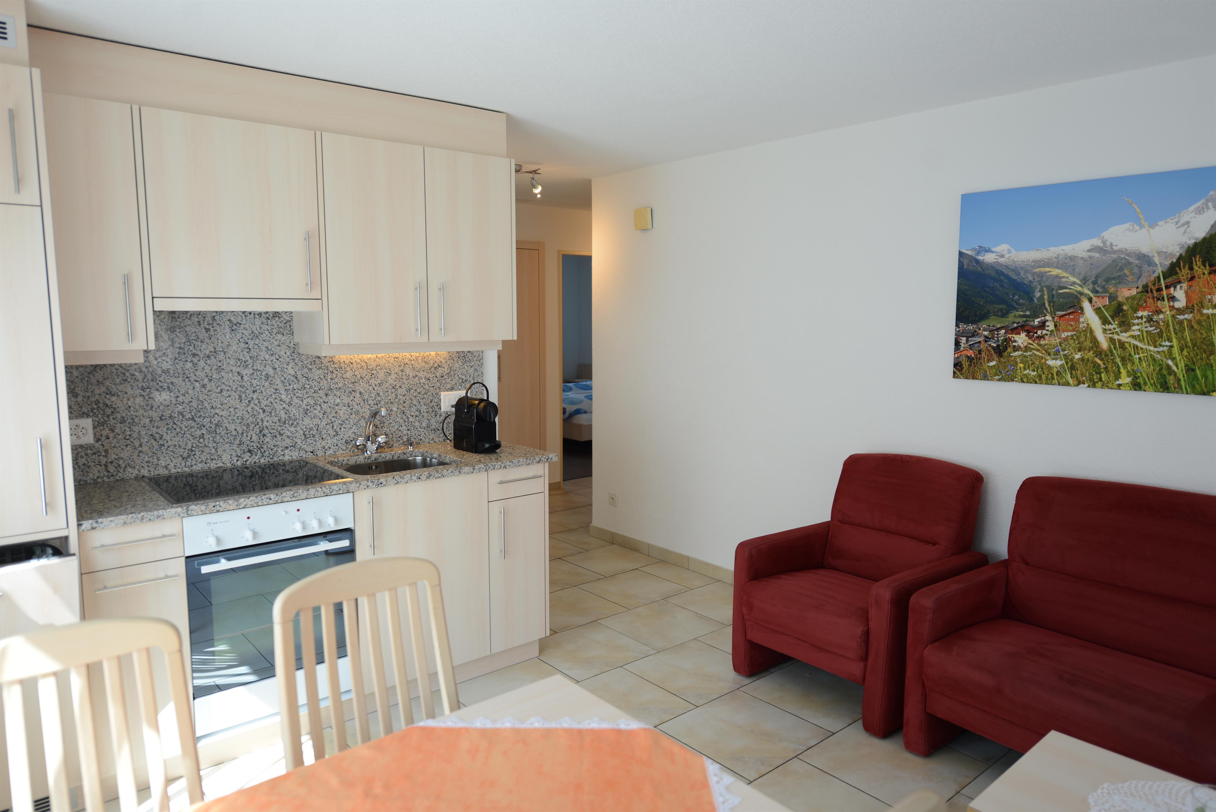 Das Haus verfügt über einen Lift. Ruhig am Waldrand und in der Nähe der Luftseilbahnen, Sportanlagen und des Aqua Allalins gelegen.