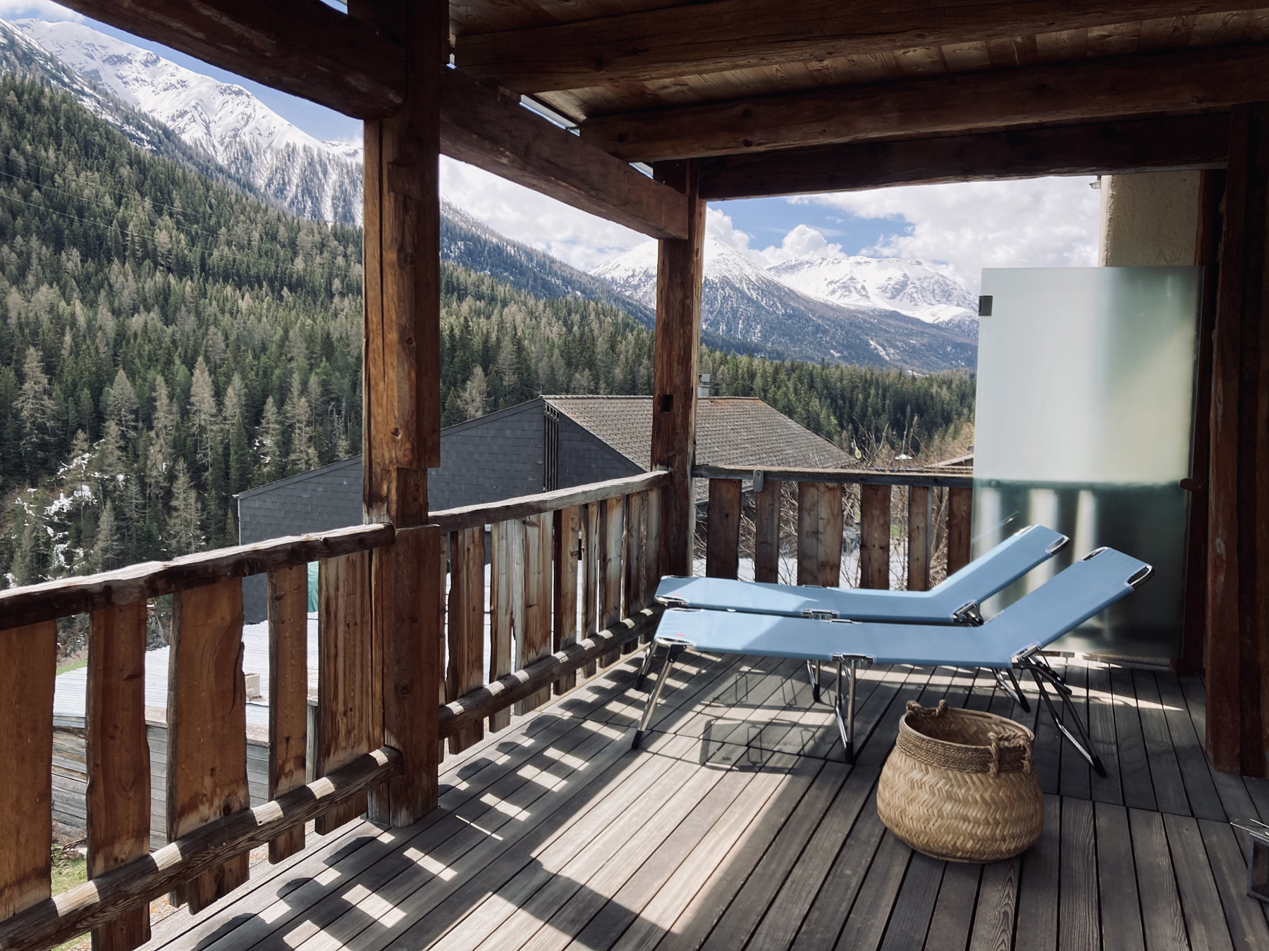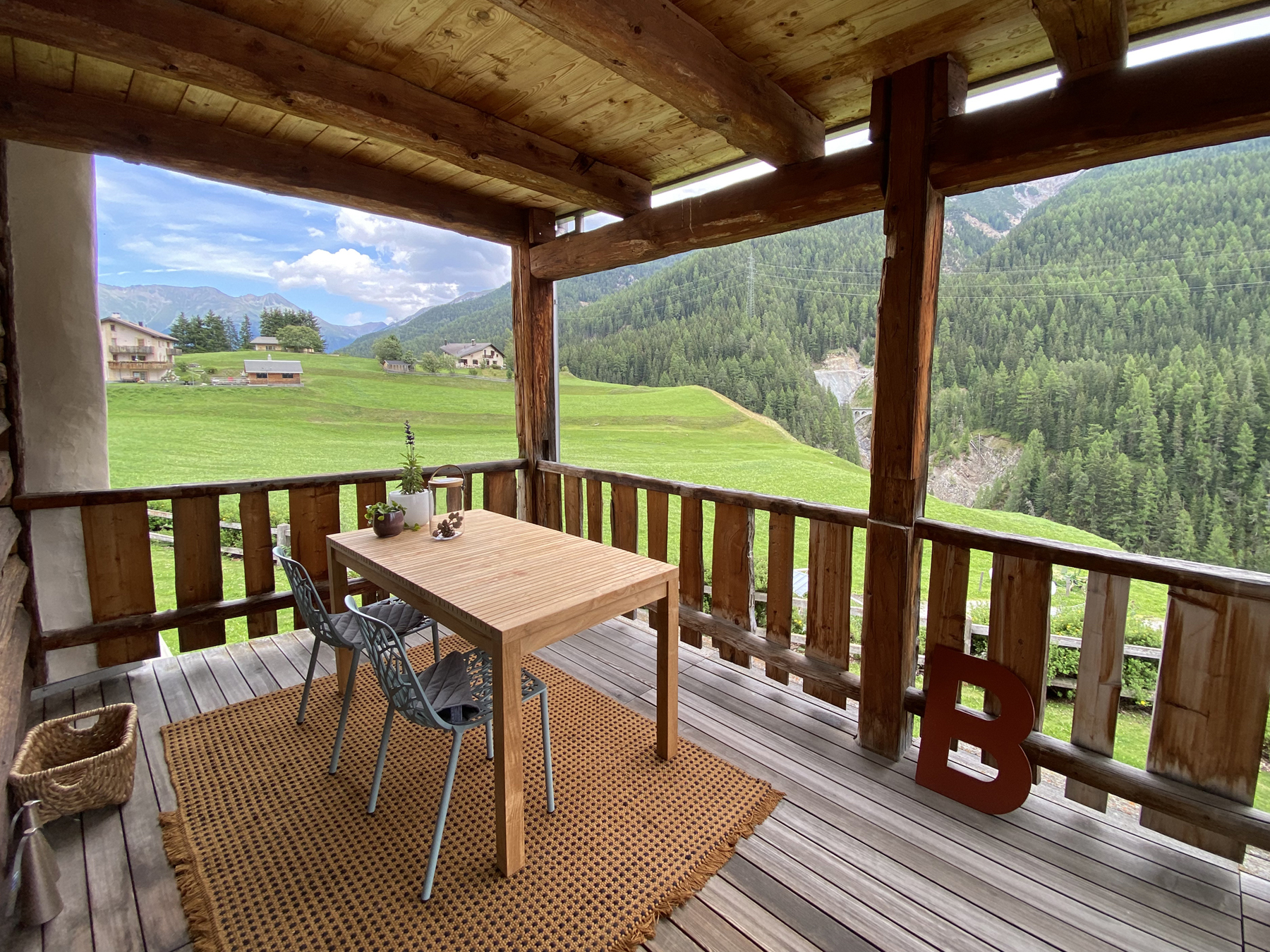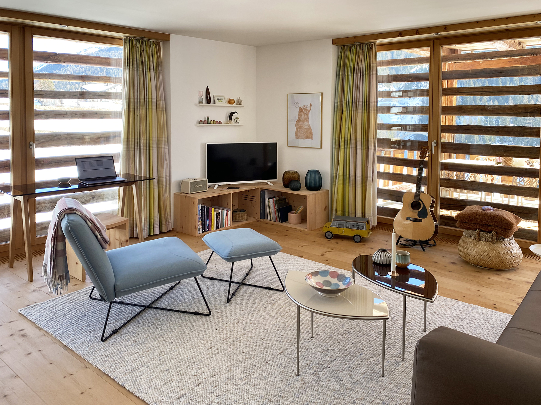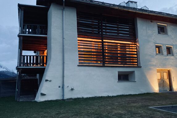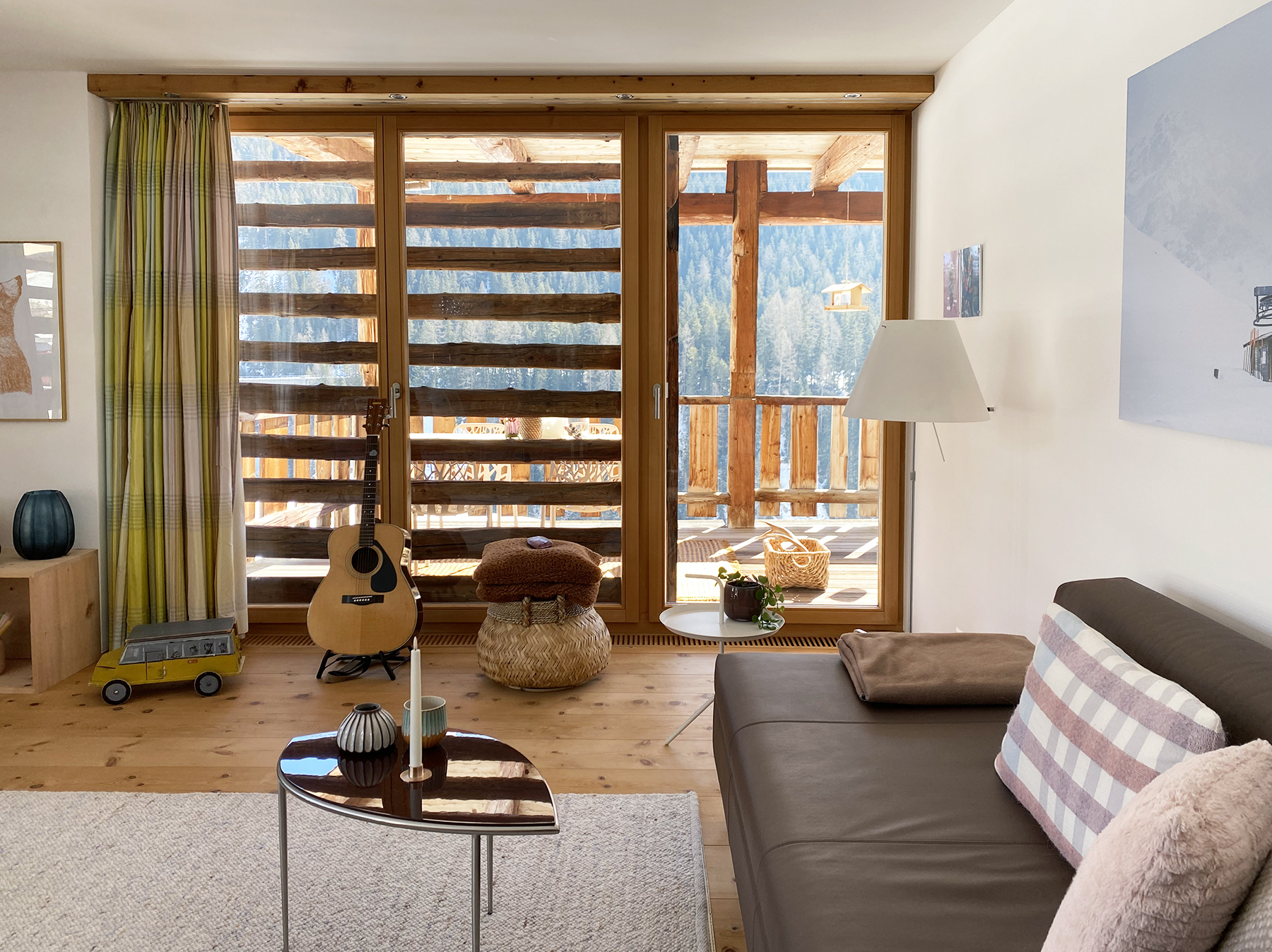 Das grosszügige Wohnzimmer verfügt wie die ganze Wohnung über einen schönen Arvenholzboden. Zwei Wände sind fast durchgehend verglast, und man blickt durch die originalen Balken des Heustalls in die Bergwelt. Abends lassen sich die Holzbalken beleuchten und schaffen damit eine besondere Atmosphäre. Eine gemütliche Sofaecke wartet auf die müden Beine des Wanderers oder der Langläuferin. Vom Wohnzimmer aus gelangt man auf die gedeckte Terrasse, welche mit Essplatz und Liegestühlen ausgestattet ist. Hier geniesst man den Brunch oder das Feierabendbier mit Blick in die grandiose Bergwelt des Schweizer Nationalparks. Auf der anderen Talseite grüsst die rote Rhätische Bahn vom Viadukt.