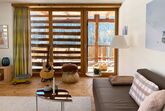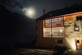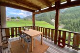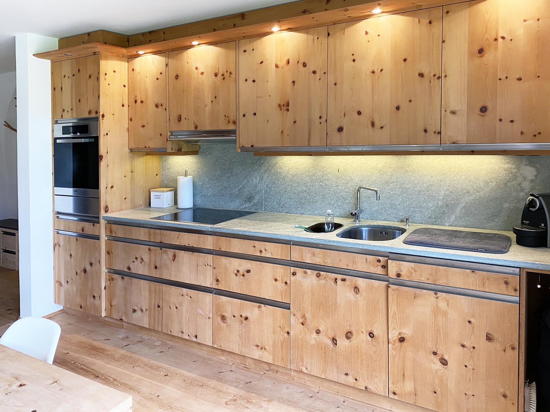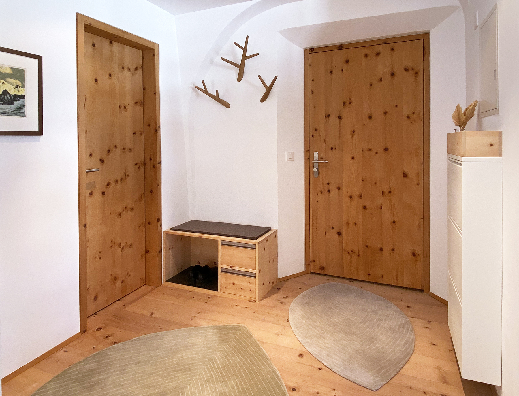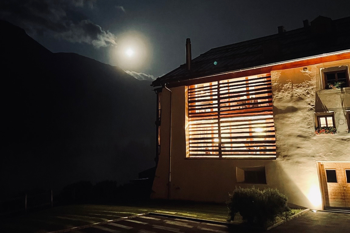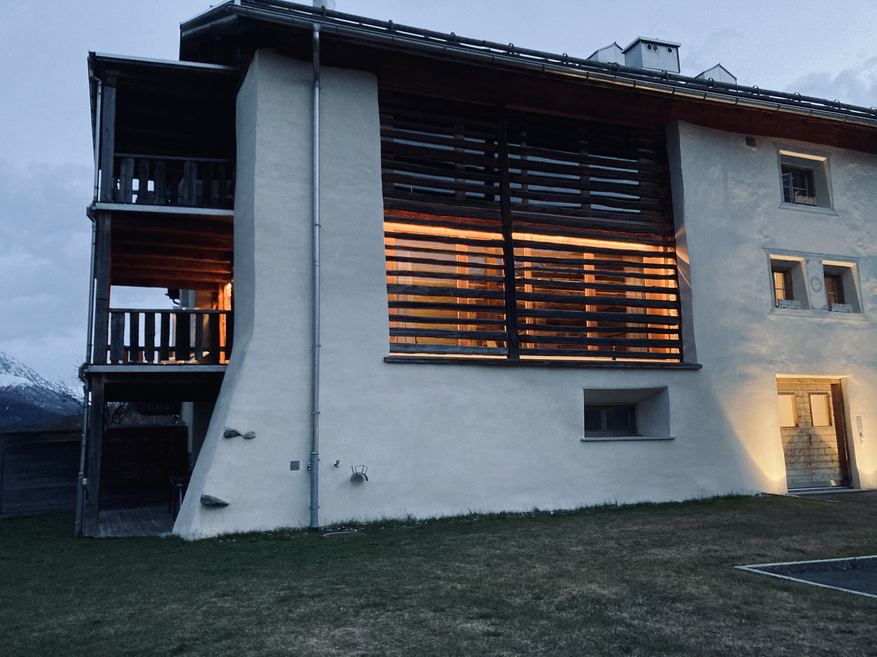 Das grosszügige Wohnzimmer verfügt wie die ganze Wohnung über einen schönen Arvenholzboden. Zwei Wände sind fast durchgehend verglast, und man blickt durch die originalen Balken des Heustalls in die Bergwelt. Abends lassen sich die Holzbalken beleuchten und schaffen damit eine besondere Atmosphäre. Eine gemütliche Sofaecke wartet auf die müden Beine des Wanderers oder der Langläuferin. Vom Wohnzimmer aus gelangt man auf die gedeckte Terrasse, welche mit Essplatz und Liegestühlen ausgestattet ist. Hier geniesst man den Brunch oder das Feierabendbier mit Blick in die grandiose Bergwelt des Schweizer Nationalparks. Auf der anderen Talseite grüsst die rote Rhätische Bahn vom Viadukt.