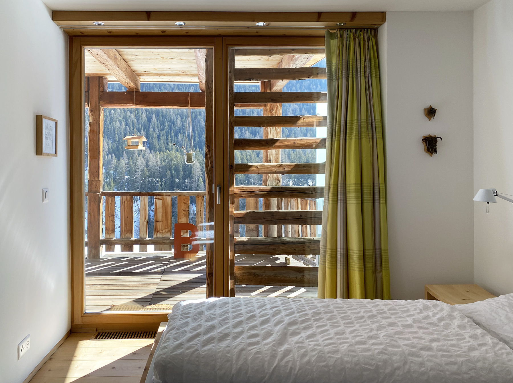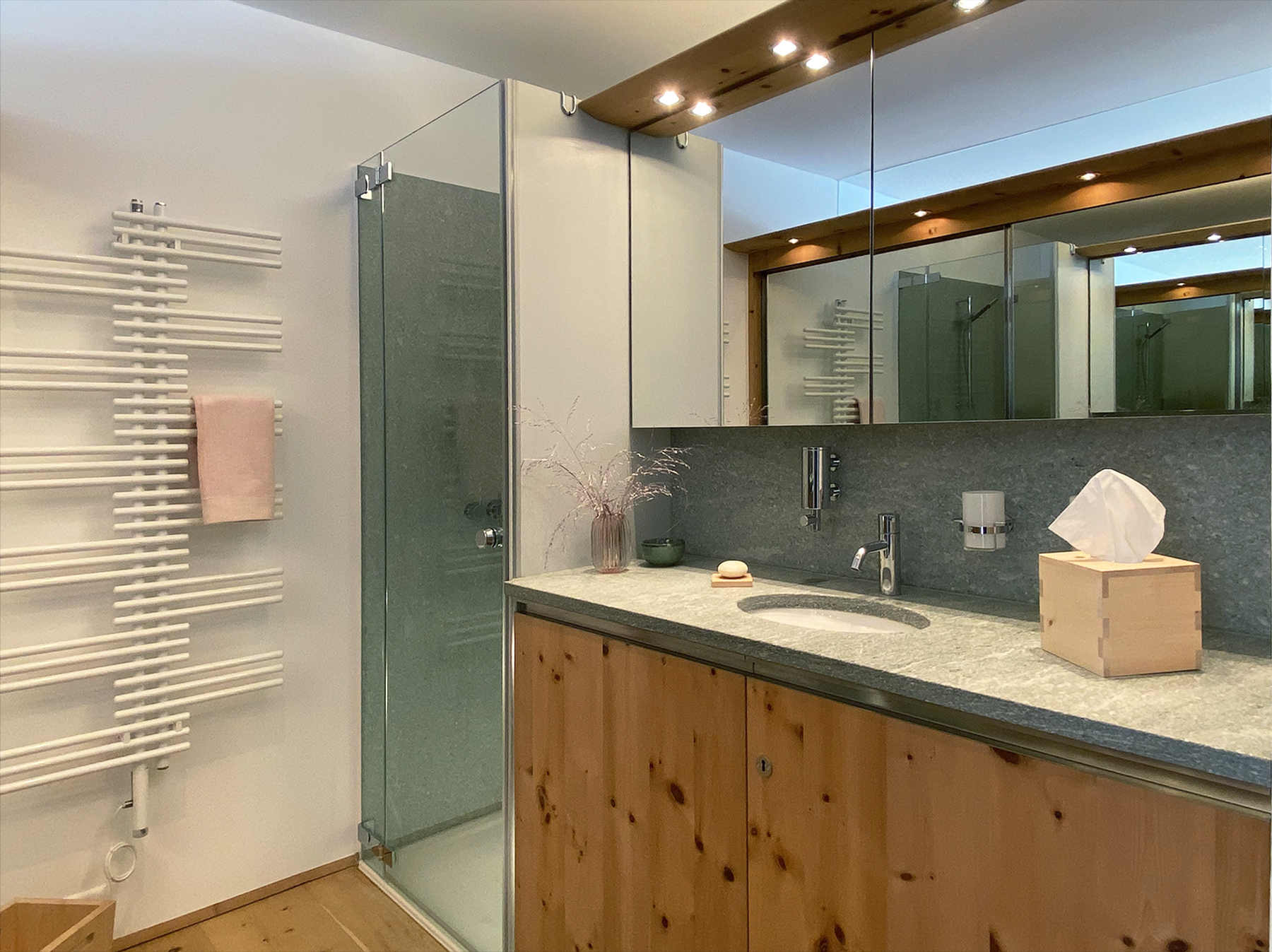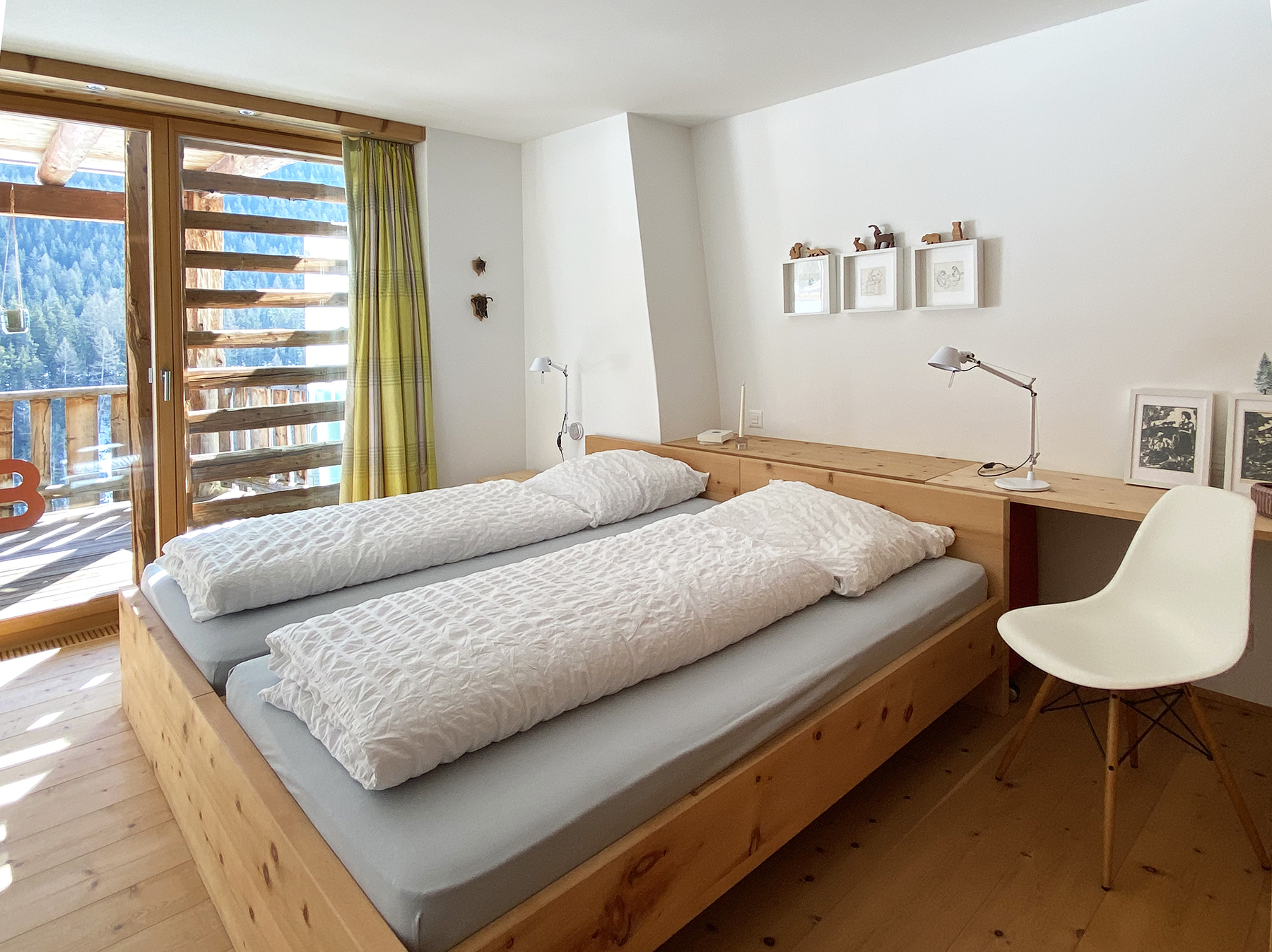 Im behaglichen Schlafzimmer fällt man abends in hochwertige, wolkenweiche Arven-Betten und geniesst die Stille Brails. Der Schlafbereich hat ebenfalls direkten Zugang zur Terrasse. Ein grosszügiger Schiebeschrank bietet genug Stauraum für die persönlichen Dinge. Das Bad verfügt über eine helle Duschkabine ohne Stufe und einen Handtuchradioator. Das WC ist in einem separaten Raum, der ebenfalls als Badezimmer genutzt werden kann.