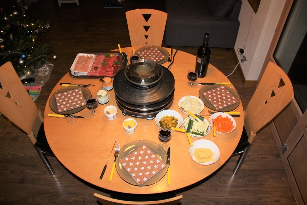 Die grosse Küche ist sehr gut ausgestattet. Neben der üblichen Einrichtung (Geschirrspülmaschine, Kaffeemaschine Delizio Migros, Wasserkocher, Milchschäumer) verfügt die Küche auch über ein Käsefondue-Caquelon und einen Racletteofen mit Tischgrill und Fondue-Chinoise-Pfanne.