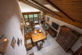 Innen erwartet Sie eine charmante Dachwohnung mit einem luftigen Wohnkonzept. Das geräumige Doppelschlafzimmer richtet sich nach Norden aus, während das sonnendurchflutete Wohnzimmer mit seinem einladenden Chemineé, der bequemen Polstergruppe und dem Esstisch in offenem Verbund mit der Küche nach Süden orientiert ist. Eine besondere Note erhält die Wohnung durch die Galerie, die über eine eher steile Treppe erreichbar ist und zwei zusätzliche Schlafplätze bietet. Die Ausstattung lässt mit TV, Radio und WLAN UPC, 4 Platten Keramik Herd, Mikrowelle, Backofen, Geschirrspülmaschine, Filter-Kaffeemaschine sowie Fondue- und Raclette-Geschirr keine Wünsche offen. Praktisch sind auch die Waschmaschine und der Tumbler für die Benutzung mit Münzautomat im Keller.