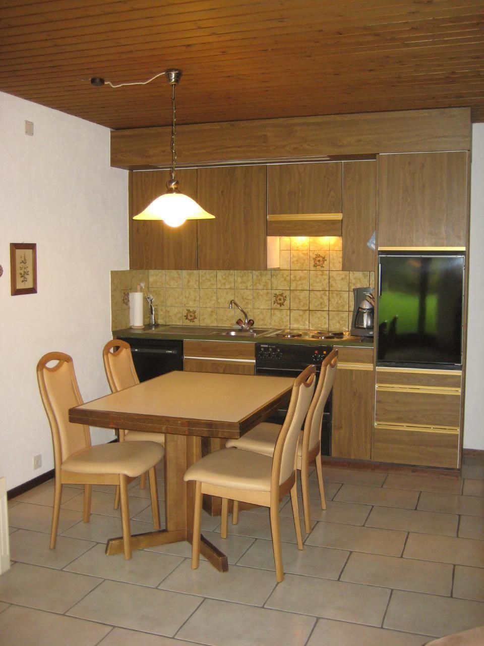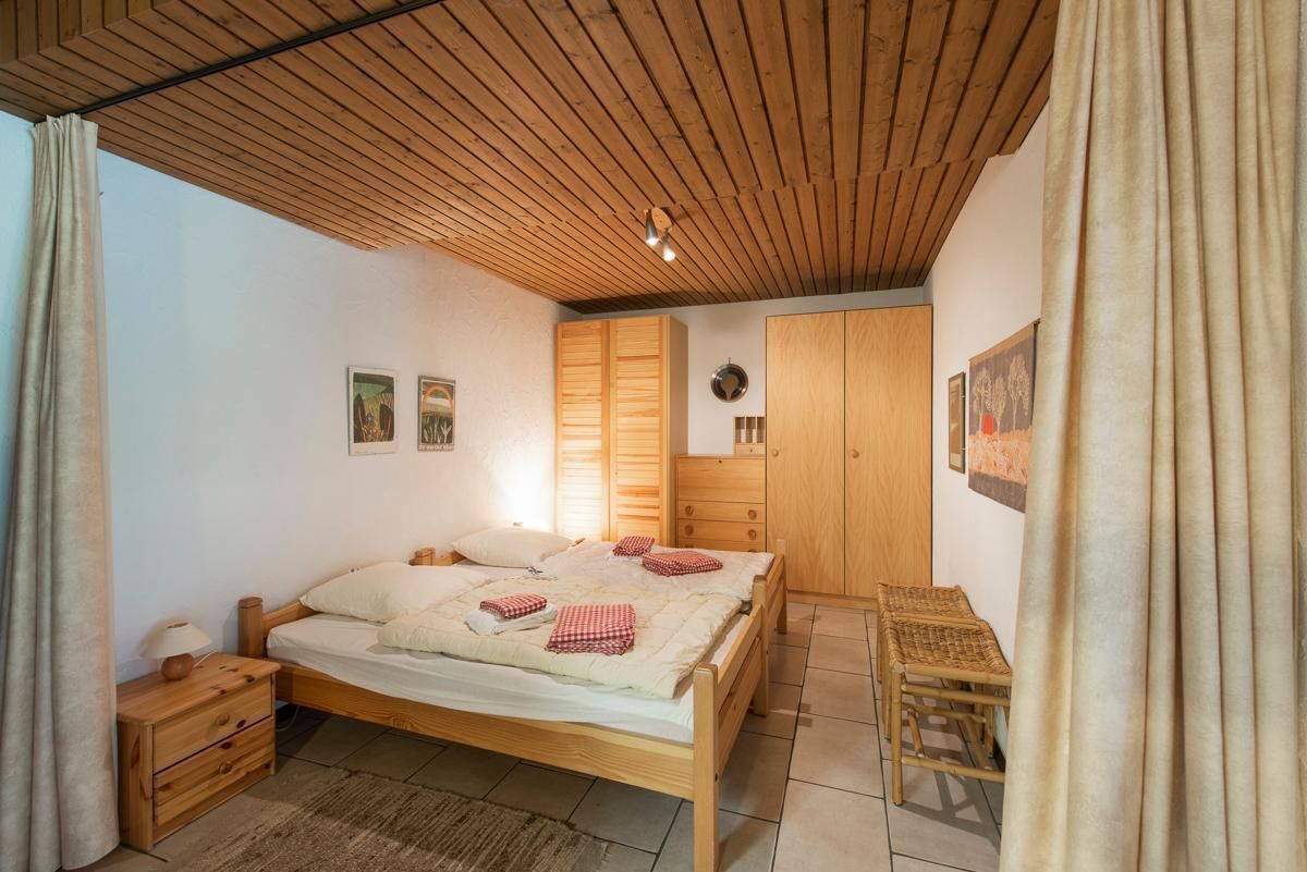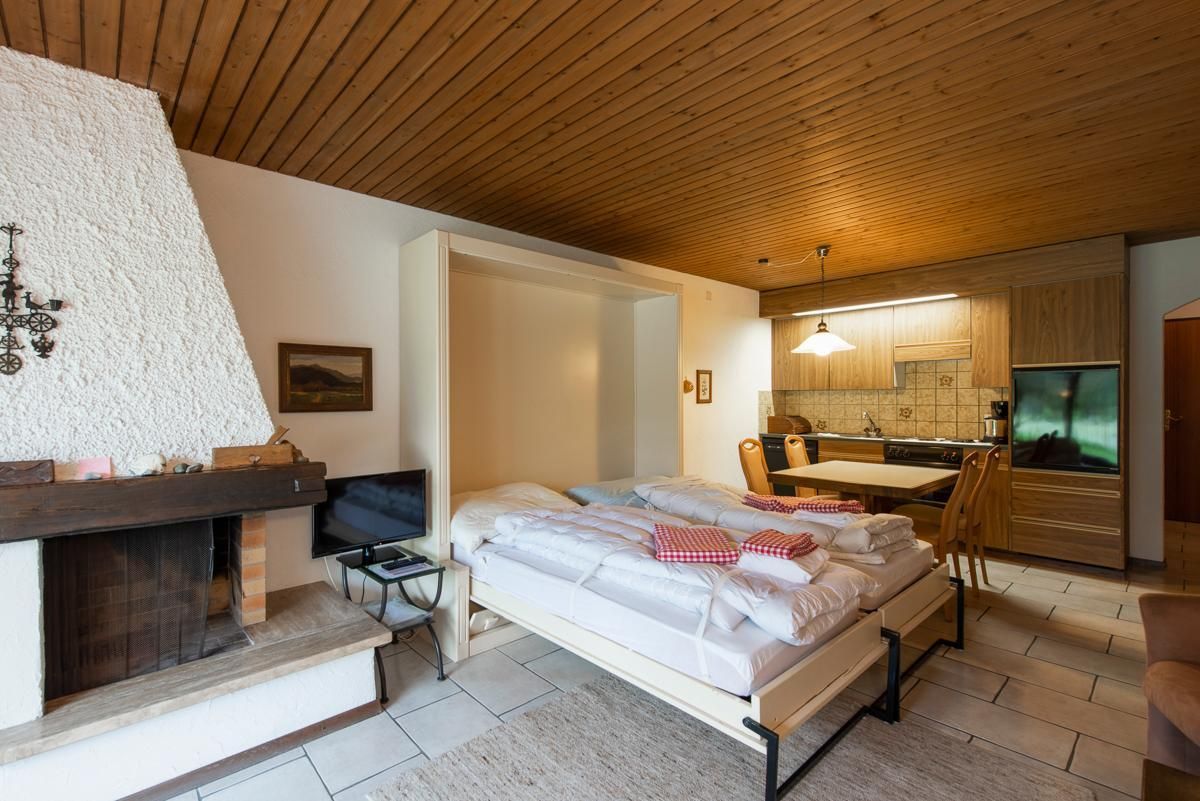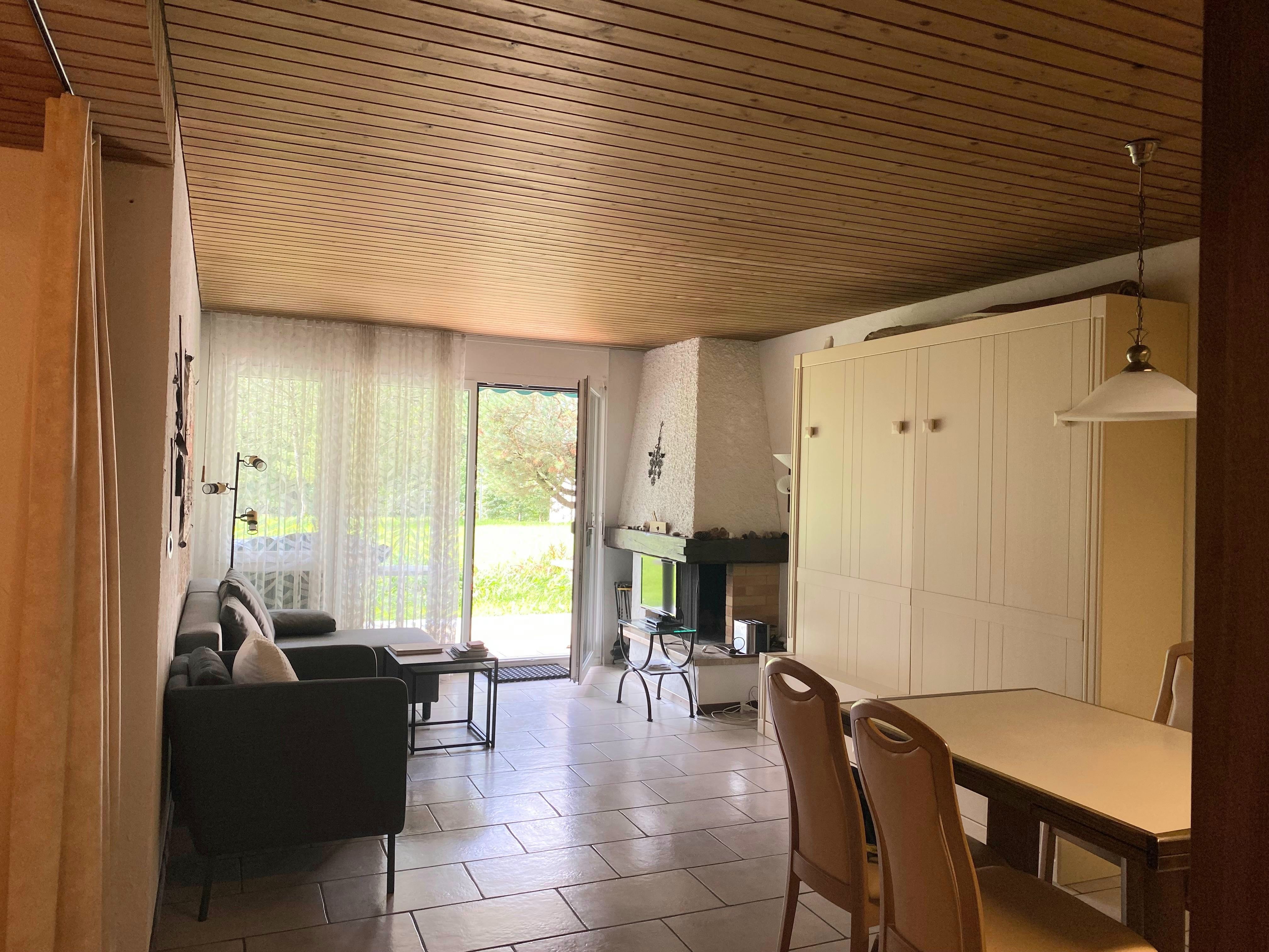 Die Wohnung präsentiert sich als eine 2 ½ Zimmer-Wohnung mit einem charmanten länglichen Grundriss, der ein Doppelschlafzimmer umfasst, das geschickt mit einem Vorhang vom Wohnzimmer getrennt ist. Richtung Süden öffnet sich ein geräumiges Wohnzimmer, ausgestattet mit einem einladenden Cheminée, einer bequemen Polstergruppe und einem Esstisch, perfekt für gemütliche Abende. Für zusätzliche Schlafmöglichkeiten stehen im Wohnzimmer 2 Kippbetten zur Verfügung. Die offene Küche ist großzügig gestaltet und mit allem Komfort wie Elektroherd, Abwaschmaschine und Kaffeemaschine ausgerüstet. Für den praktischen Alltag finden Sie im Keller zudem eine Waschmaschine und einen Tumbler mit Zeitautomat.