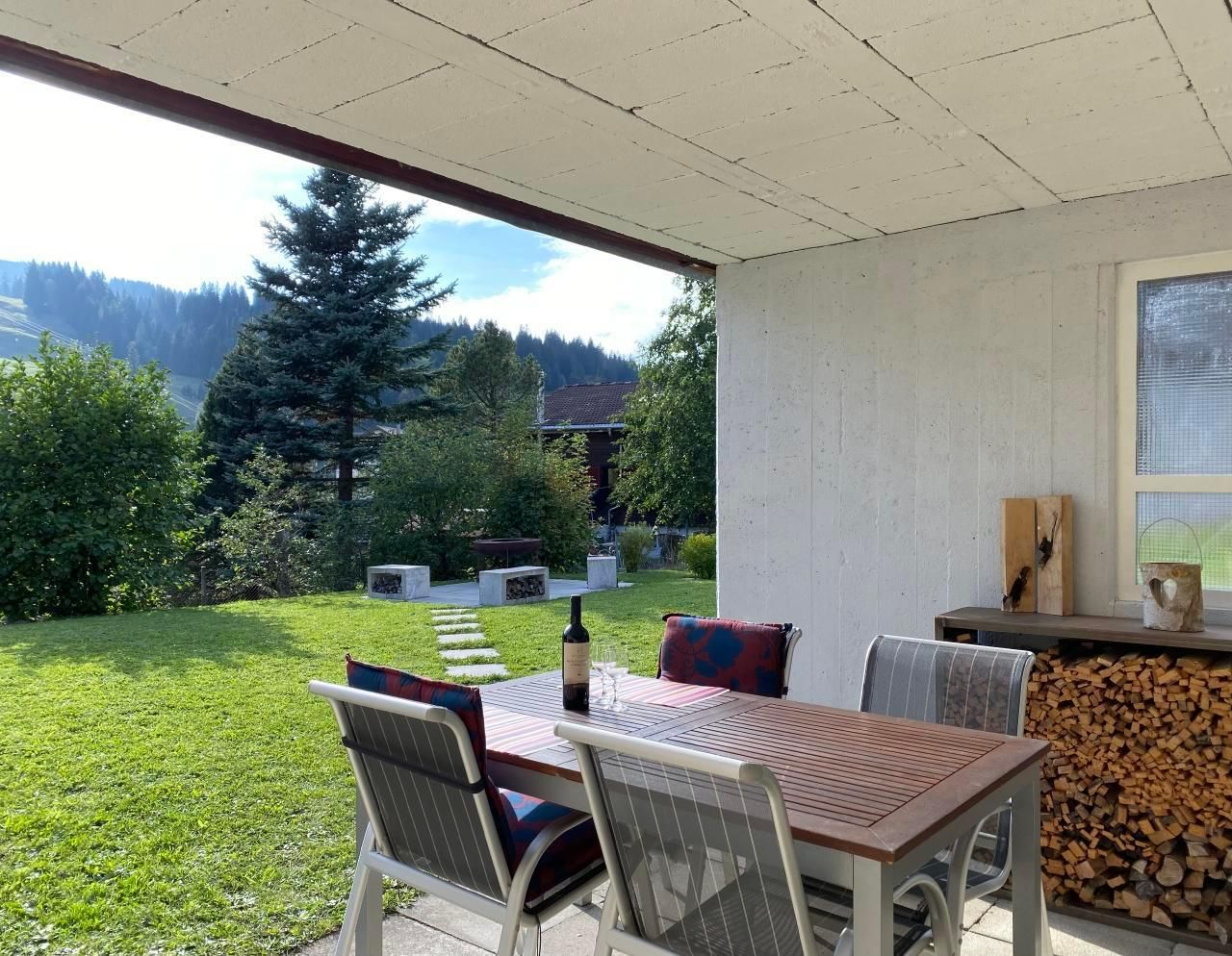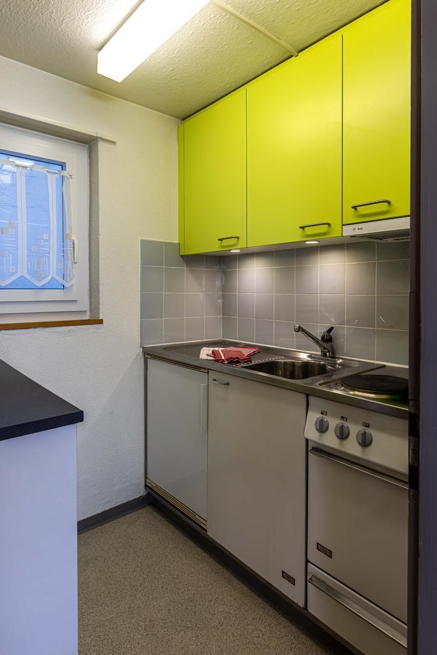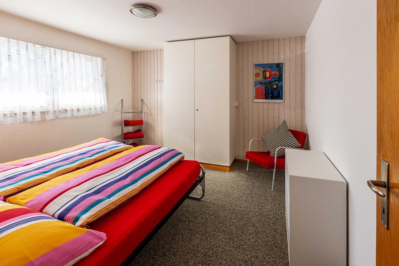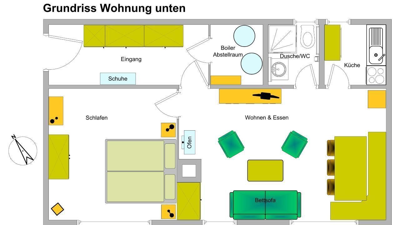 Diese Wohnung im Parterre bietet Platz für bis zu 4 Personen und verfügt über ein Schlafzimmer, einen Wohn-Essbereich mit Schlafsofa (160 cm breit, mit Lattenrost) sowie eine separate Küche. Sie hat einen direkten Zugang zur grossen Spielwiese mit Feuerstelle – ideal für Familien und Naturfreunde.