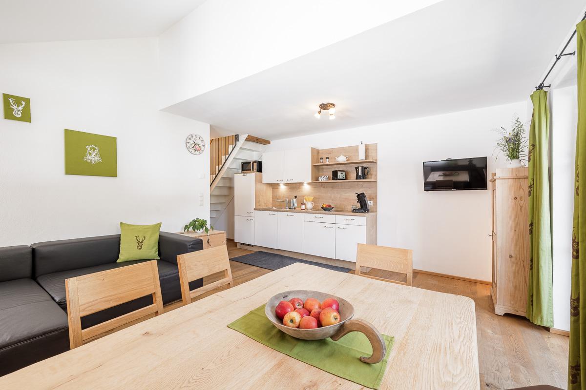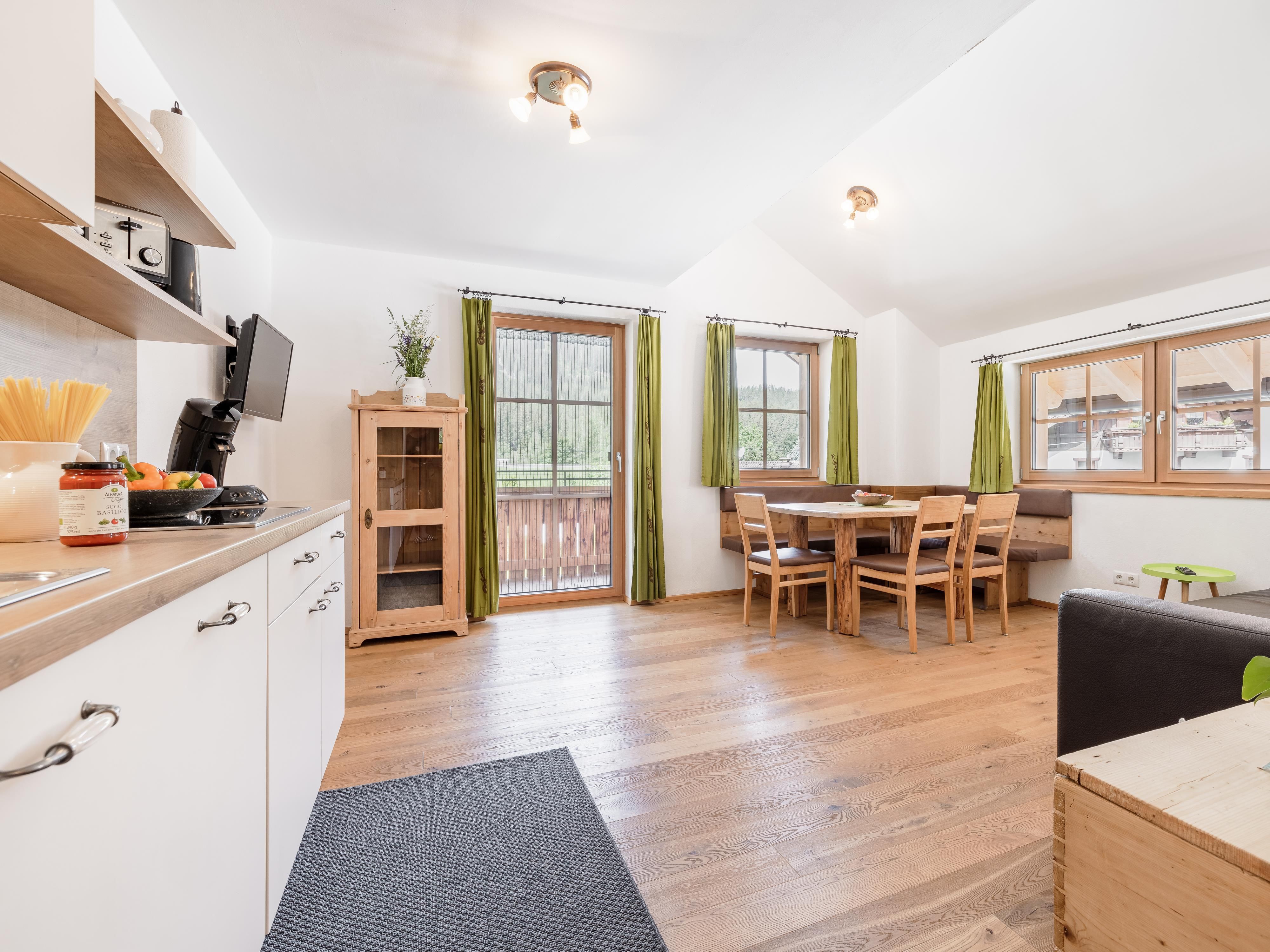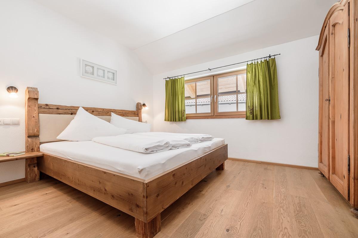 Unser Appartement Enzian hat eine Größe von ca. 75 m²: 1 Doppelbettzimmer, 1 Zimmer mit 1 Doppelbett und 1 Einzelbett, eine große, vollausgestattete Wohnküche mit Balkon und ein Badezimmer mit Dusche und WC.