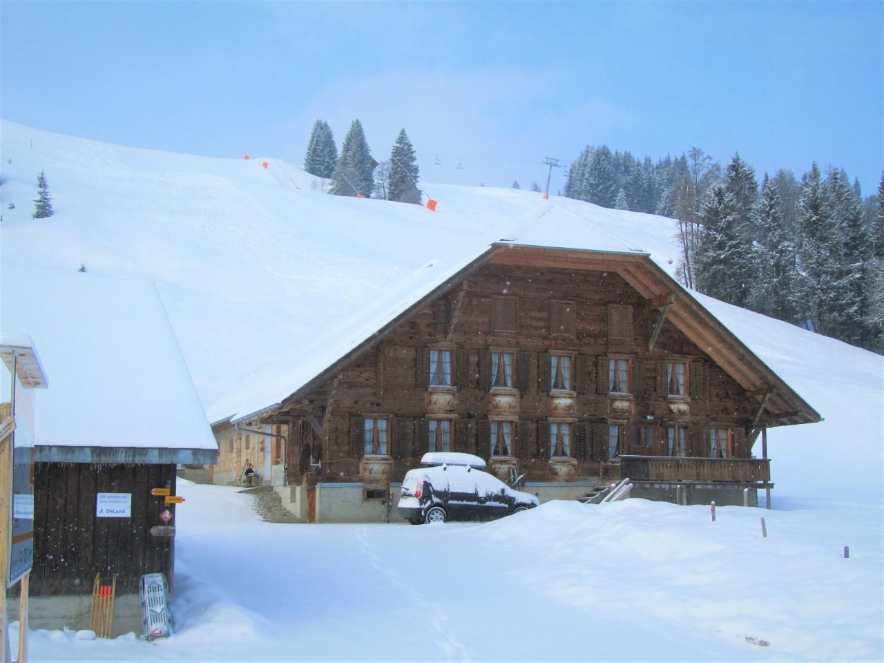 zur Info: Zwischen Mitte Mai und Ende September werden unruhige Schläfer vom Geräusch der Melkmaschine (ab 5.30 Uhr) im angebauten Stall sanft geweckt. Im Winter trainieren direkt neben der Alp die Nachwuchs-Skifahrer. Am Wochenende finden manchmal Rennen statt.