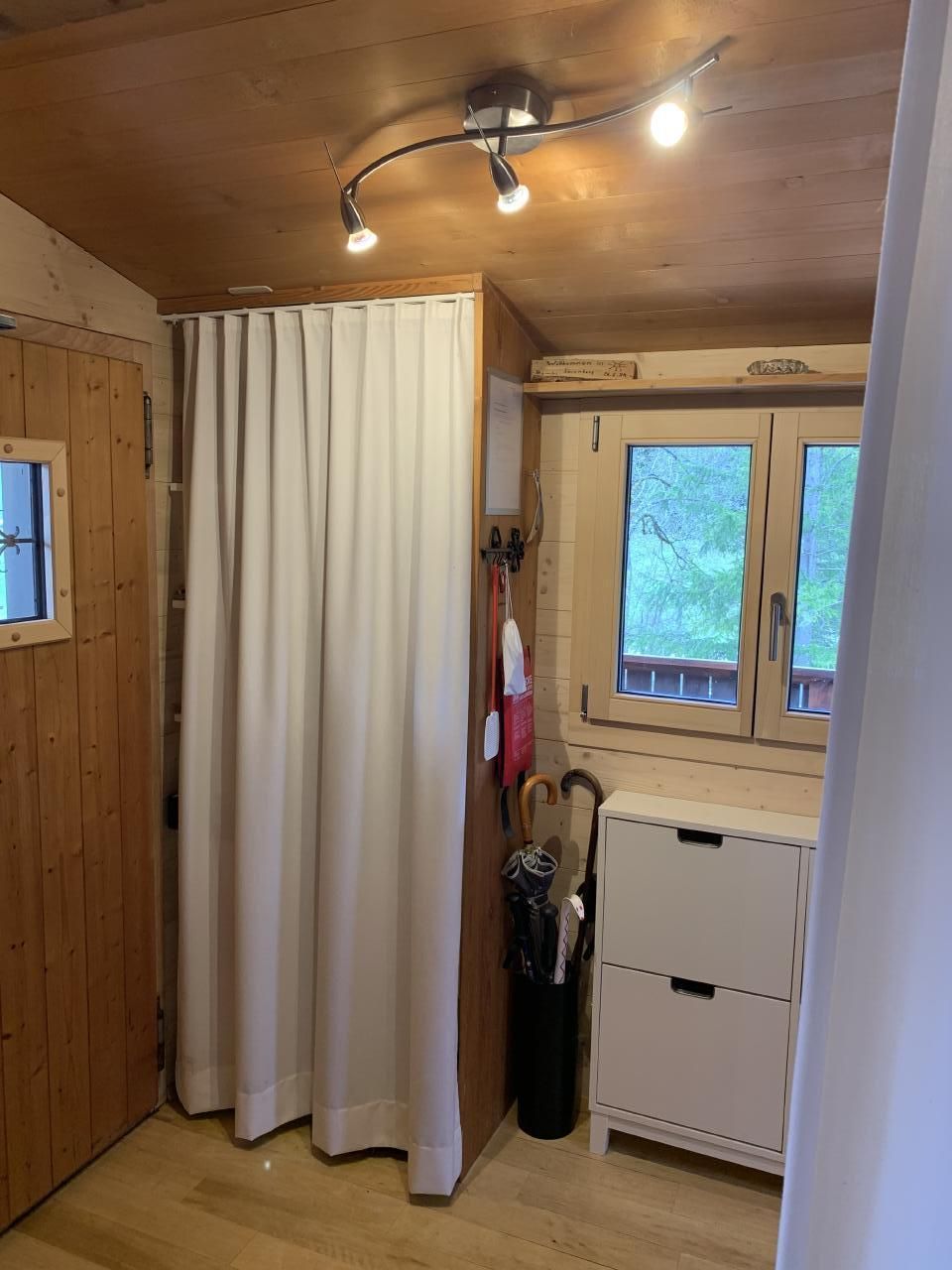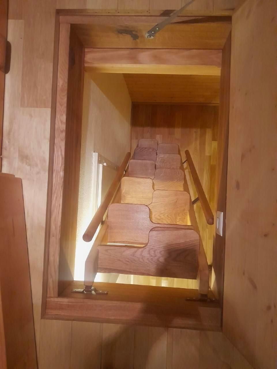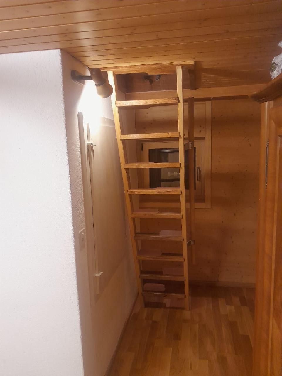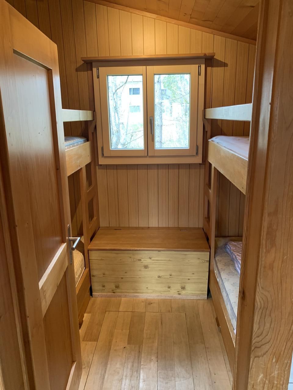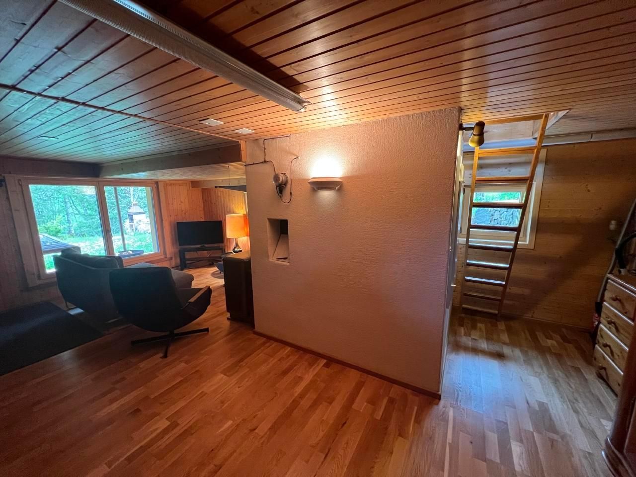 Sonstige Schlafzimmereinrichtung (Schlafzimmer1): Im Wohnzimmer und im Untergeschoss hat es zusätzlich je ein aufklappbares bzw. ausziehbares Bettsofa. Der Zugang zum Untergeschoss ist vom Schlafzimmer aus durch eine Bodenklappe mit einer Leiter oder von aussen über die Gartentreppe gewährleistet.