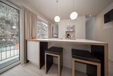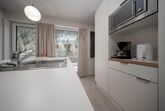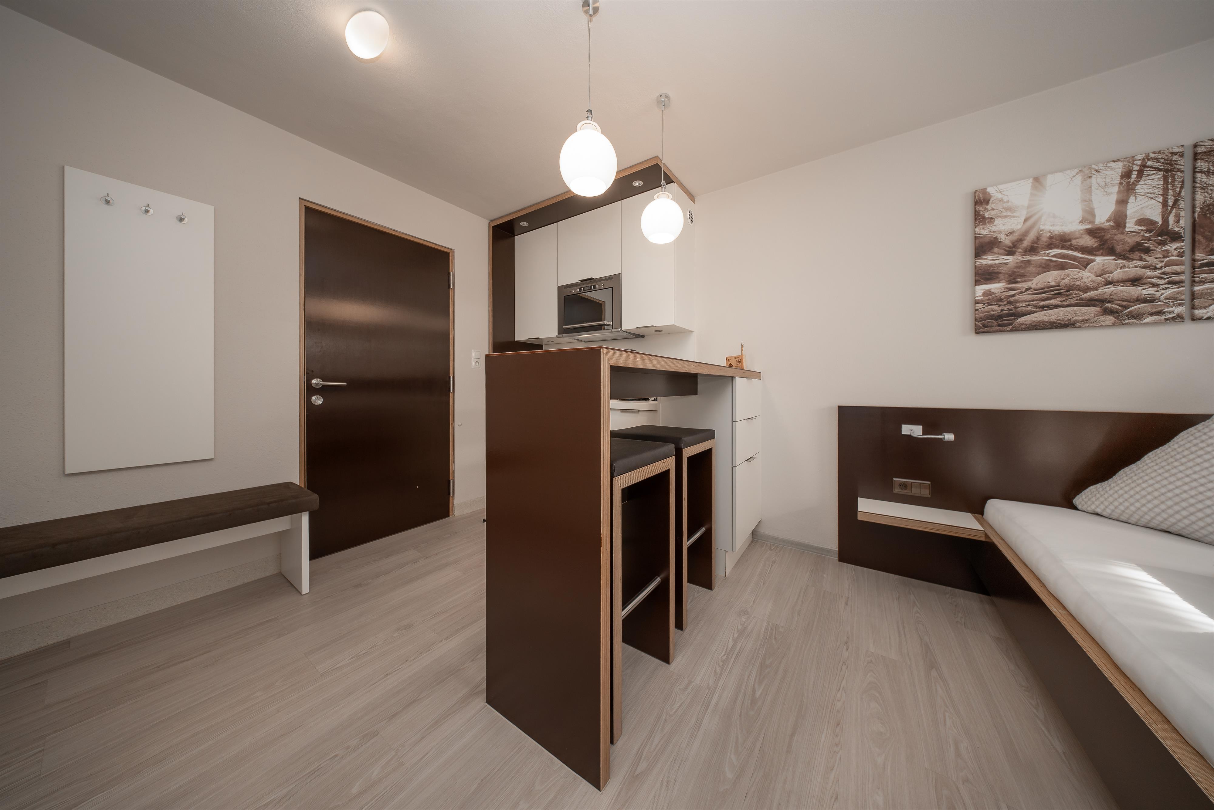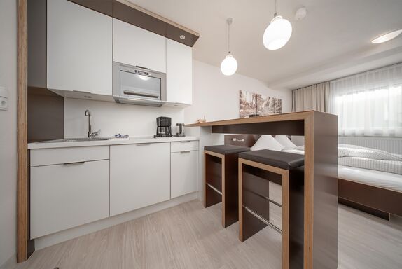 Modern - in Naturtönen gehaltene Einraumwohnung für zwei Personen (ca. 19 m²) ist wie folgt ausgestattet: Wohnschlafraum mit 1 Doppelbett, voll ausgestattete Kochnische mit Stehbar, Geschirr, Kühlschrank, Mikro, Toaster, Cerankochfeld,Wasserkocher....) Kabel-Flat-TV und gratis W-LAN. Badezimmer mit Dusche/WC/Fön. Eine Wohnung verfügt über einen Geschirrspüler und über einen kleinen Balkon.