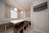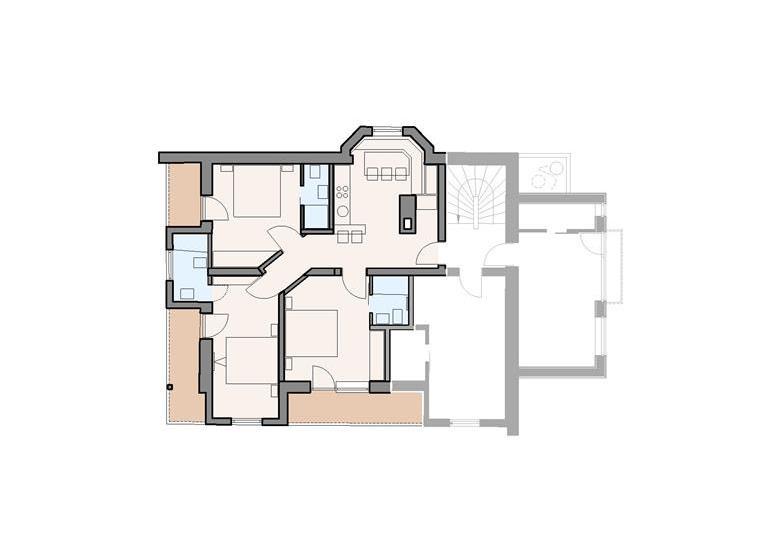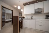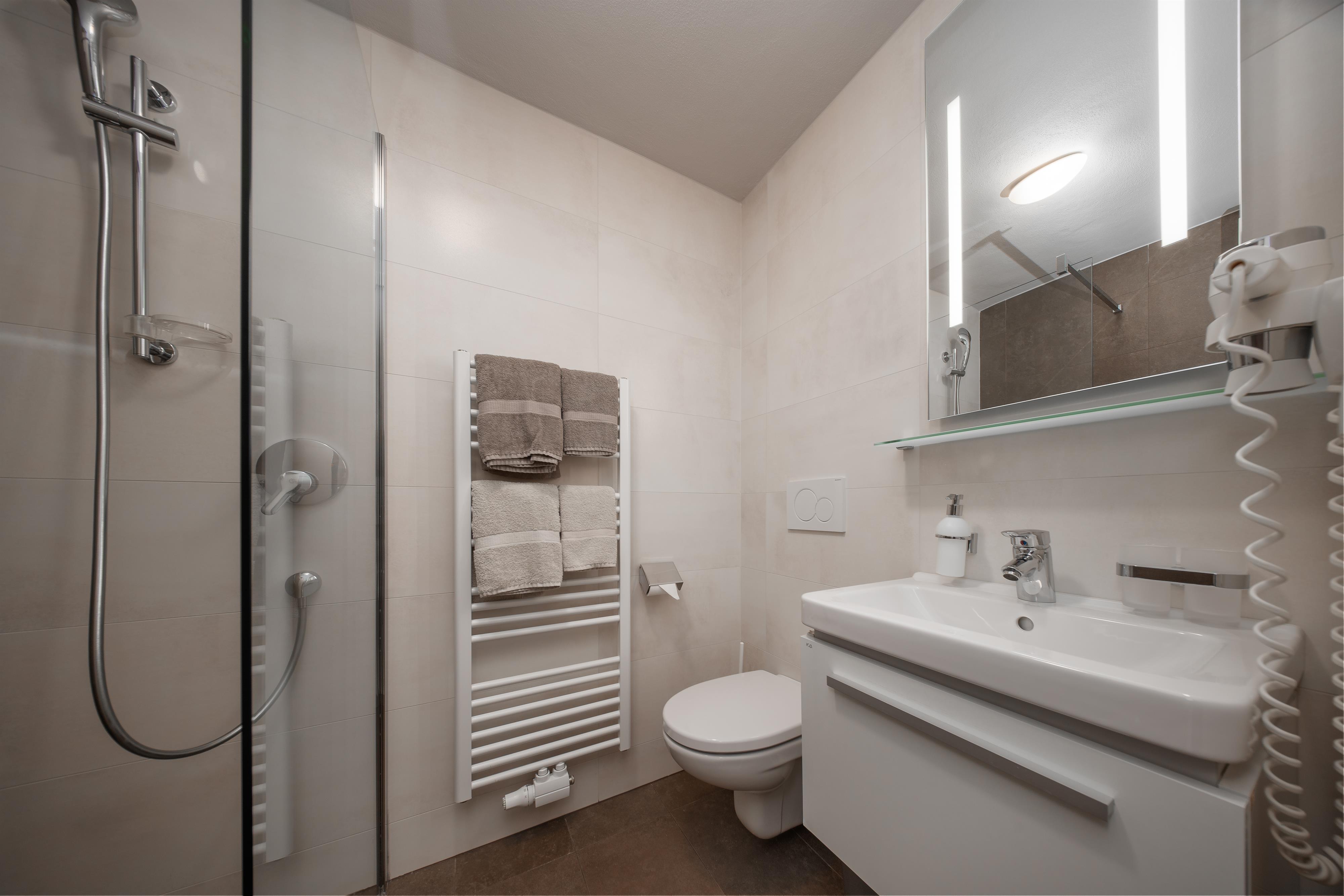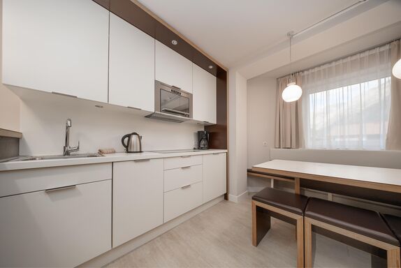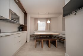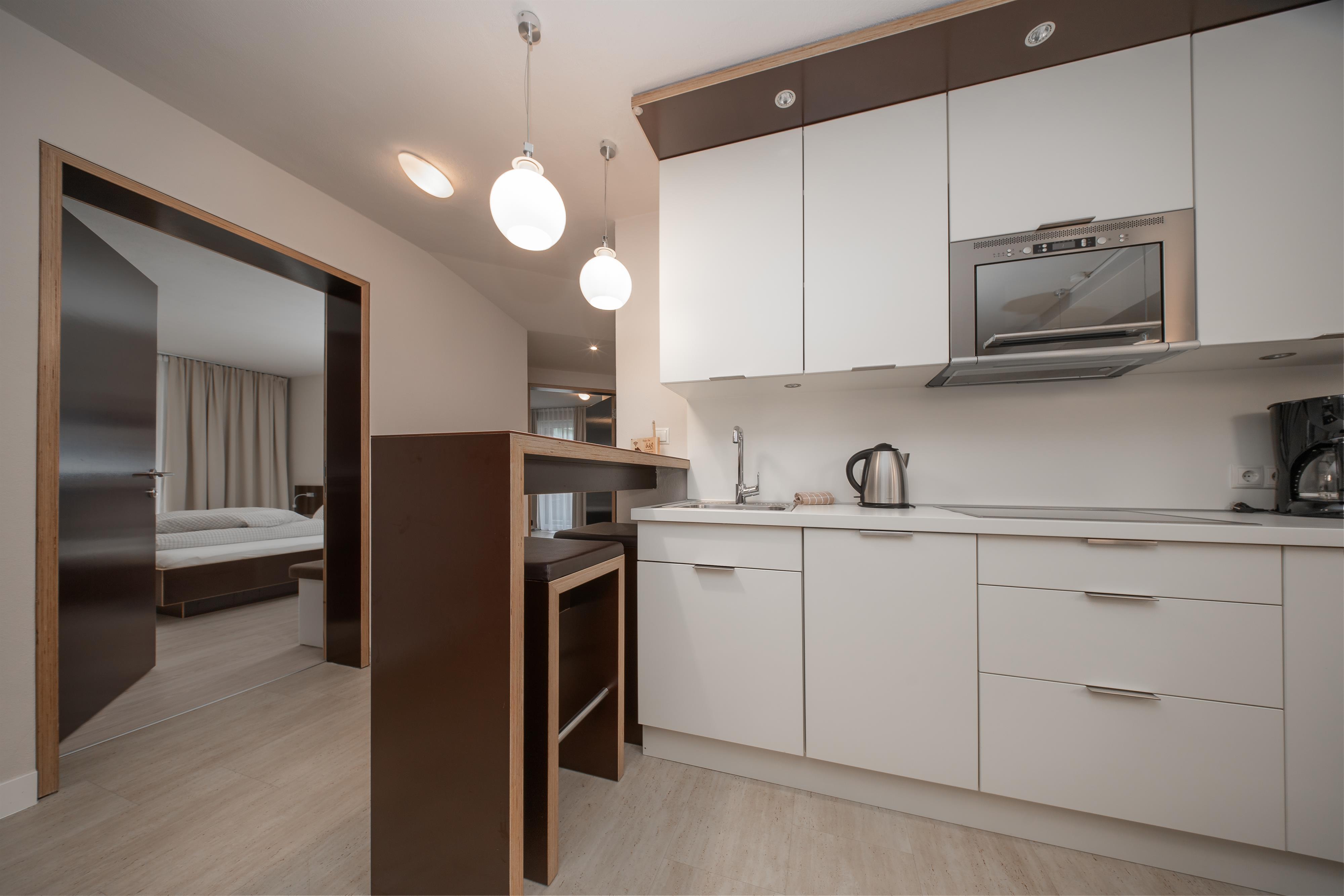 Modern - in Naturtönen eingerichtetes Appartement für 4-6 Personen (ca. 70 m²): 3 Doppelzimmer mit jeweils Balkon und Badezimmer mit Dusche/WC/Föhn, Vorraum mit Garderobe, voll ausgestattete Küche (Kühlschrank, Wasserkocher, Geschirrspüler, Toaster, Cerankochfeld, Mikro...) mit Essecke und Bar, Geschirrtücher, Handtücher, Bettwäsche, Kabel-Flat-TV und gratis W-LAN.