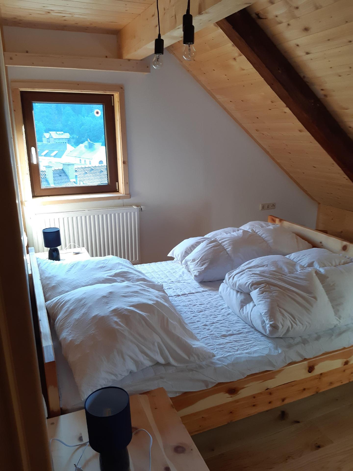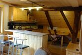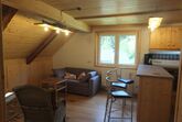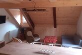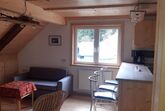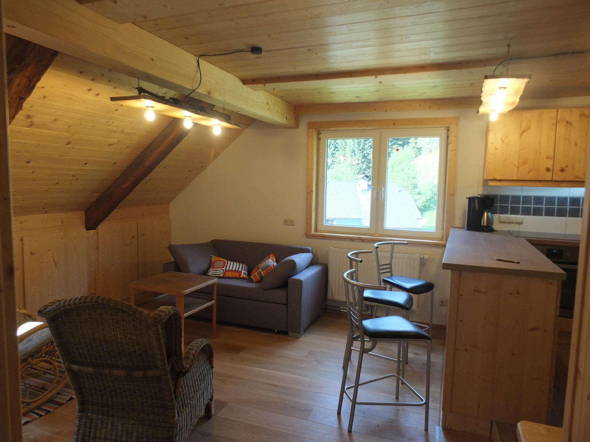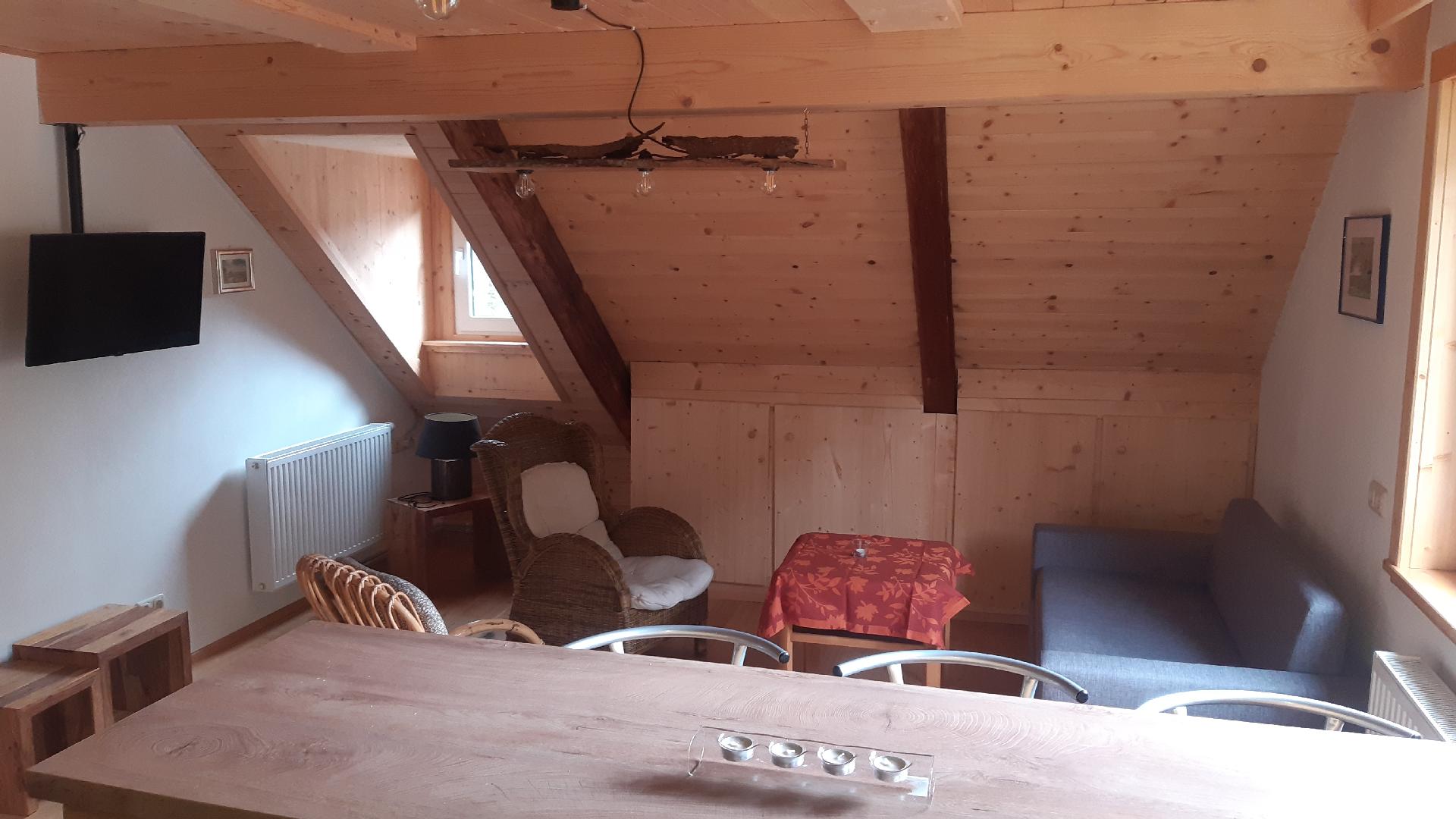 Das Haus ist ca. 250 bis 300 Jahre alt und wurde komplett aus Holz gebaut. In den Jahren 2009 bis 2012 wurde eine Grundsanierung durchgeführt. Im Sommer 2017 wurde ein neues Dach und eine neue Pelletsheizung installiert. Die Ferienwohnung befindet sich im Dachgeschoss des Hauses. Der im Erdgeschoss befindliche Wohnungsteil ist rein privat und wird nicht vermietet. Die Ferienwohnung besteht aus einem Schlafzimmer mit Doppelbett, einem Wohnzimmer mit Schlafsofa (Grand Lit 140 cm breit), Dusche/WC und einem Küchen-/Essbereich sowie einer Schlafnische mit Einzelbett. Die offene Küche ist mit allem ausgestattet, was zu einem angenehmen Aufenthalt notwendig ist. Zusätzlich gibt es einen Kaminofen. Fernseher wie auch WLAN ist in der Wohnung vorhanden.