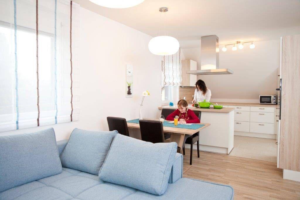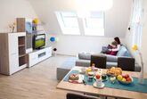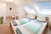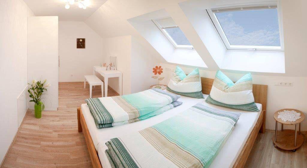 Die im Jahre 2016 fertiggestellte Ferienwohnung liegt im Obergeschoss eines zweigeschössigen Einfamilienhauses und erstreckt sich über eine Wohnfläche von 60 m². Im gepflegten Inneren genießen zwei bis vier Personen ein Wohlfühlambiente, das sich aus lichtdurchfluteten Räumen, hellen Möbeln und Naturholzfarben zusammen setzt. Nach dem Hauseingang gelangen Sie über eine Treppe direkt zu Ihrer Ferienwohnung. Diese unterteilt sich in einen Vorraum, ein Doppelzimmer, eine gesellige Wohnküche, einen Abstellraum und ein modernes Duschbad mit WC. Eine gute Nacht verspricht das Schlafzimmer mit einem 180 cm x 200 cm großen Doppelbett, einem Kleiderschrank und einem Schminktischchen, auf dem auch ein Laptop Platz findet. Die beiden Dachfenster oberhalb des Bettes laden zum Schlafen unterm Sternenhimmel ein, wenn Sie die Jalousien offen lassen. Herzstück der Wohnung ist das Wohn- und Esszimmer mit integrierter Küche. Im Wohnbereich nehmen Sie auf einer großen Wohlfühl-Couch Platz zur Entspannung nach einem Tagesausflug. Dabei sorgt der Fernseher mit Sat.-TV sorgt für Unterhaltung. Die Couch bietet zudem eine Schlaffläche für ein Kind als dritte Person. Darüber hinaus ist ein Kinderbett vorhanden. Neben der Wohnlandschaft gelangen Sie am Esstisch mit vier Hochlehnenstühlen vorbei in den offenen Kochbereich. Dieser ist für Selbstversorger voll ausgestattet: Induktionsherd, MW-Herd, Backofen, großer Kühl- und Gefrierschrank, Geschirrspüler, sowie Kleinelektrogeräte wie Kaffeemaschine, Wasserkocher und Toaster ermöglichen eine umfangreiche und komfortable Selbstversorgung.
